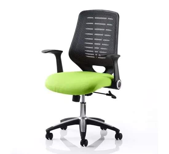 Chosen time and time again, the Relay is the ever popular mesh operator option. Modern styling with silver and chrome accented base & gas lift and easy fold armrests are complimented by a cool vented backrest design that is finished in a choice of either black or silver breathable mesh that allows you to keep your cool. The Relay makes for a versatile chair for all office environments. FEATURES : Material : Bonded Leather & Mesh Finish : Black Soft mesh back rest with stylishly designed durable nylon outer Air-mesh, fabric or soft bonded leather seat options Silver accent styling Folding arms Gas lift tested up to 150kg Usage: Operator 8hr Black or Silver mesh available Most Stylish and Unique piece of furniture Matching furniture available Images shown are for illustration purpose only Available at an affordable price DIMENSIONS : Seat Width : 500mm Seat Depth : 490mm Seat Height : 460-550mm Back Width : 480mm Back Height : 540mm Arm Width : 500mm Arm Height : 640mm Overall Width : 650mm Overall Depth : 610mm Overall Height : 980-1070mm