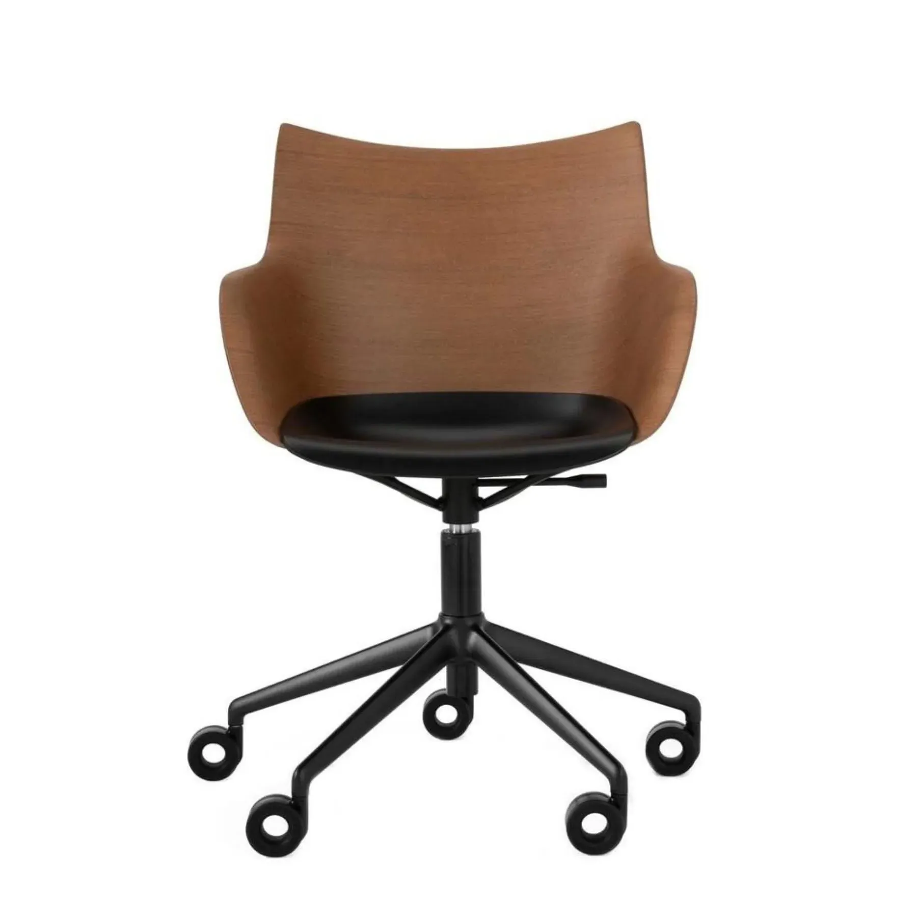 Experience the allure of natural elegance with the Kartell Q/Wood chair. From the innovative Smart Wood collection, this armchair, designed by Philippe Starck, envelops you in comfort with its inviting lines and soft armrests. Using patented technology, the wood is meticulously crafted with a mould that extends the curvature of the panel to the very edges, resulting in a seat that boasts sinuous roundness and a seamless aesthetic. Whether placed in a modern office or a contemporary living space, the Q/Wood chair radiates timeless charm. Designed with versatility in mind, the Q/Wood chair finds its place in the office environment with a 5-wheel base that enhances its suitability as a desk chair. Its integrated swivel mechanism and smooth-rolling wheels provide effortless mobility, allowing you to move freely while maintaining optimal productivity. Crafted with sustainability at its core, this chair utilizes wood sourced from FSC® certified forests, ensuring responsible production practices and a durable construction that withstands the test of time. The Q/Wood Chair seamlessly blends the poetry of wood with innovative technology, marking a historic milestone as Kartell''s first foray into incorporating wood into their renowned catalogue. Elevate your space with the exquisite craftsmanship and eco-conscious design of the Kartell Q/Wood Chair, where comfort meets sustainability in perfect harmony.