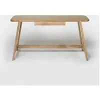 The desk offers versatile functionality with its clean, minimalist design suitable for various settings. Its solid oak construction provides durability and natural wood grain character, while the streamlined profile fits comfortably in compact spaces. The sturdy build ensures stable support for daily work tasks.