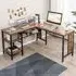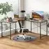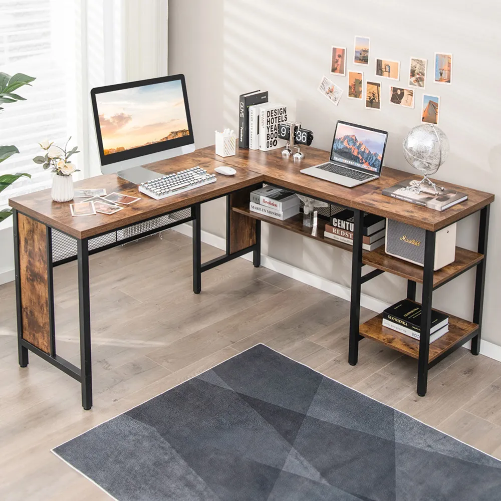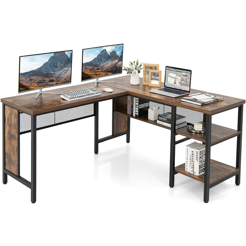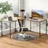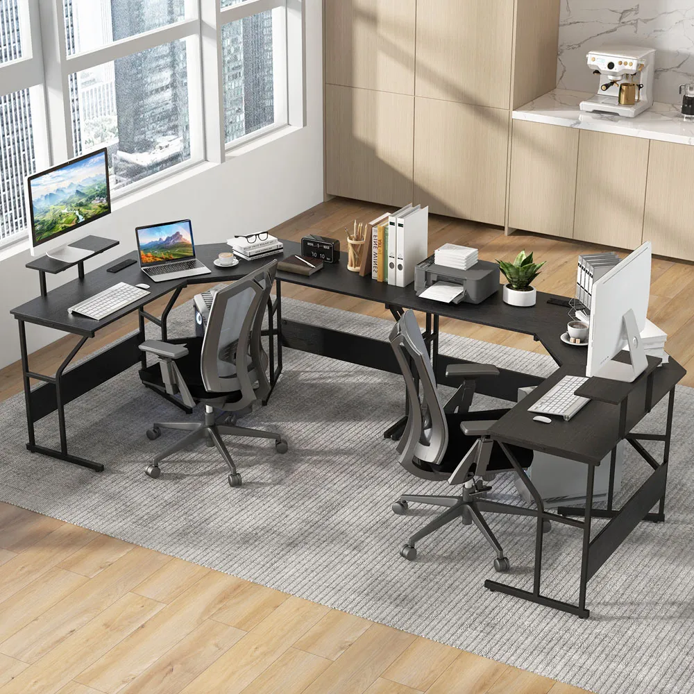 The L-shaped computer desk offers a generous 130 x 130cm work surface for multitasking with multiple monitors and devices. Its two built-in cable grommets maintain a tidy workspace, while two extra storage shelves organize documents and office supplies efficiently. The middle shelf can be removed to accommodate a computer host, and the chic black finish complements various office decors.