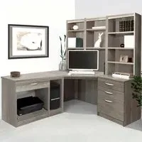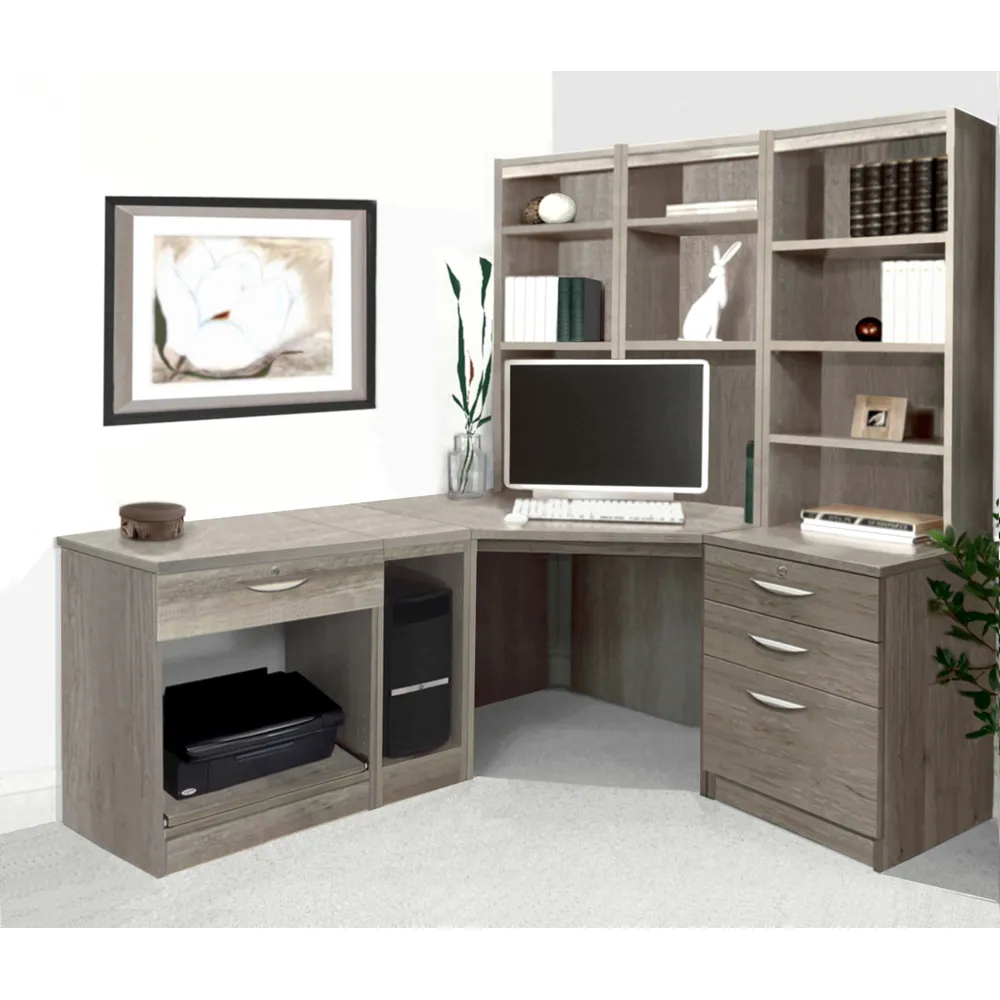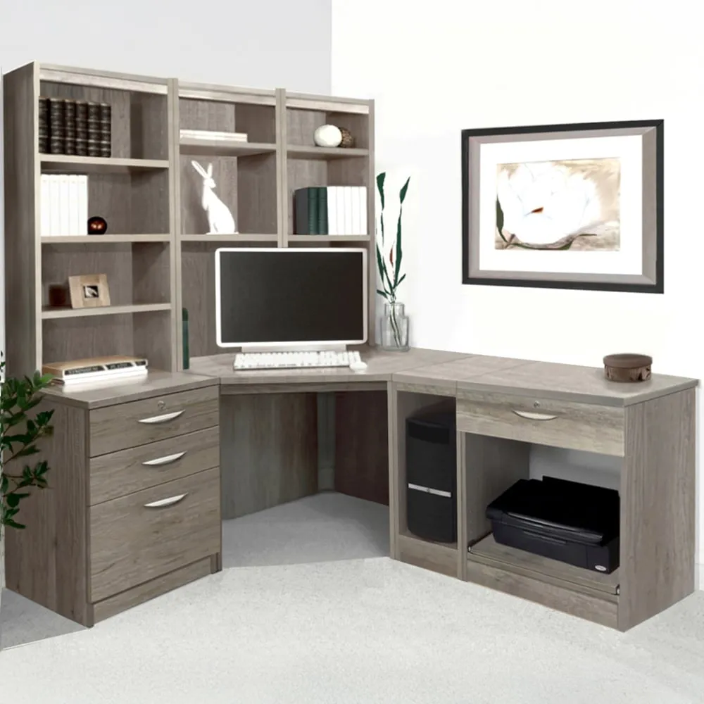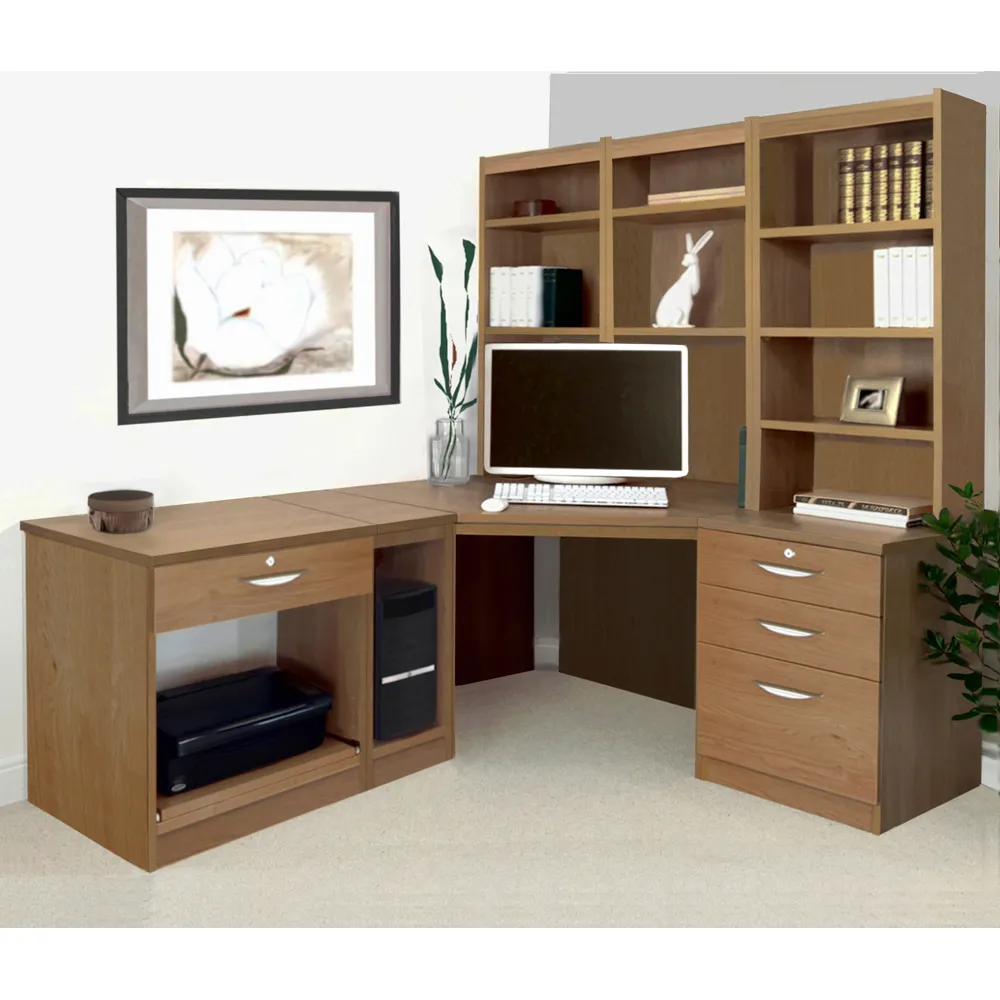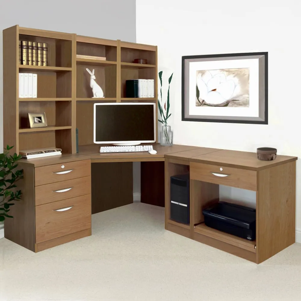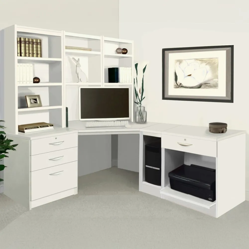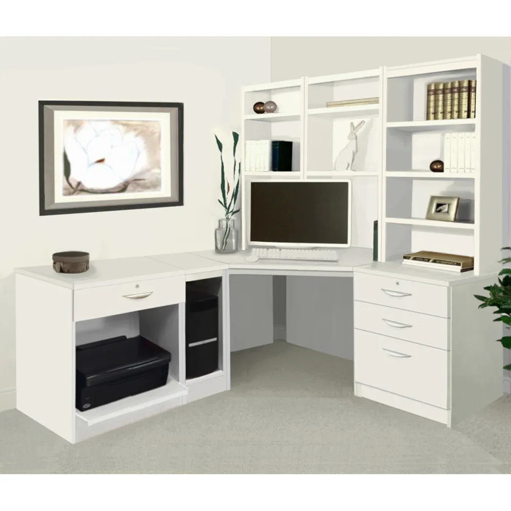 The corner computer desk offers practical workspace organization with its 4-drawer storage system and integrated printer shelf. Constructed from furniture-grade MFC that resists heat and scratches, featuring 18mm thick panels including a reinforced back panel for structural integrity. The desktop includes a 40mm rear overhang for cable clearance, while the hand-finished surface provides long-lasting durability.