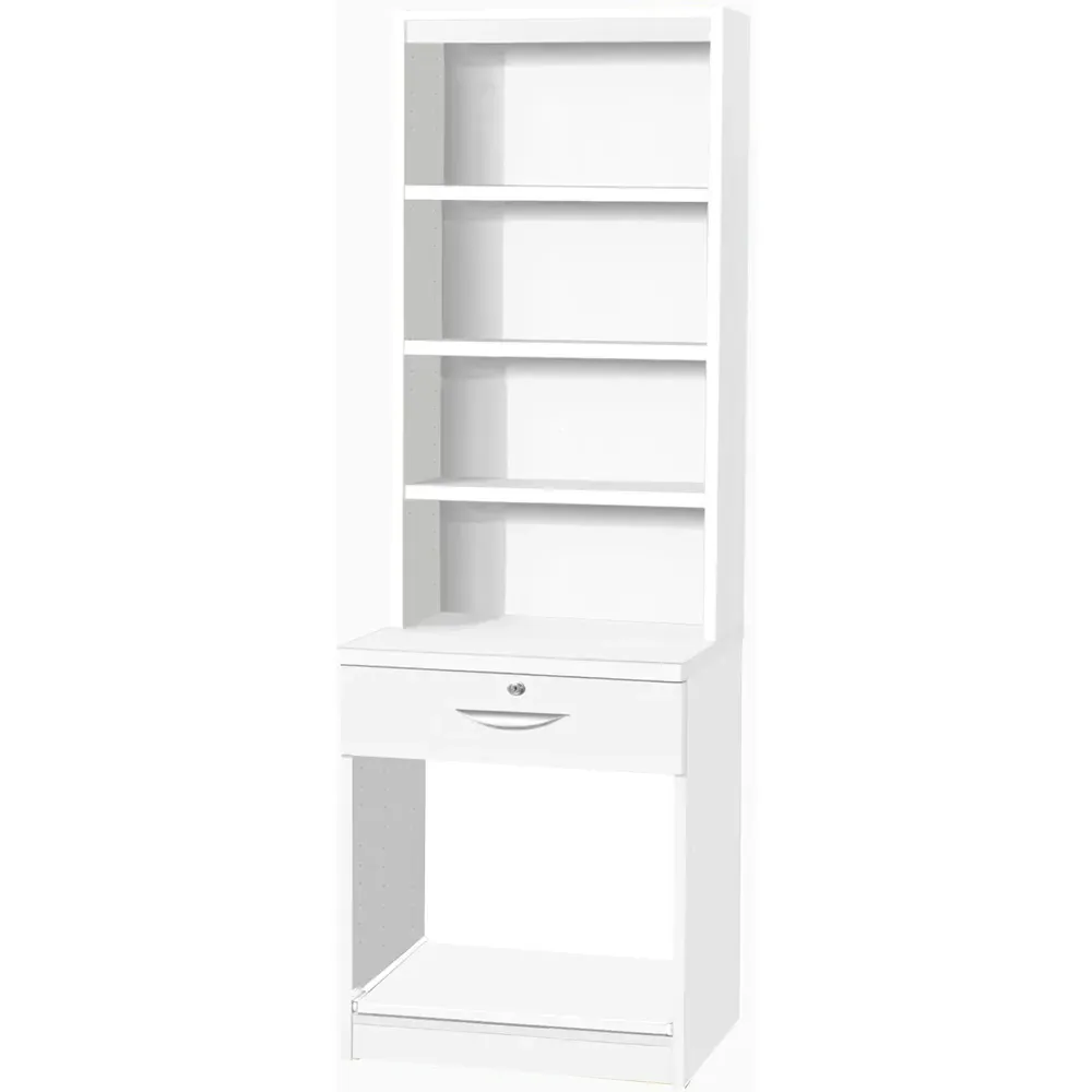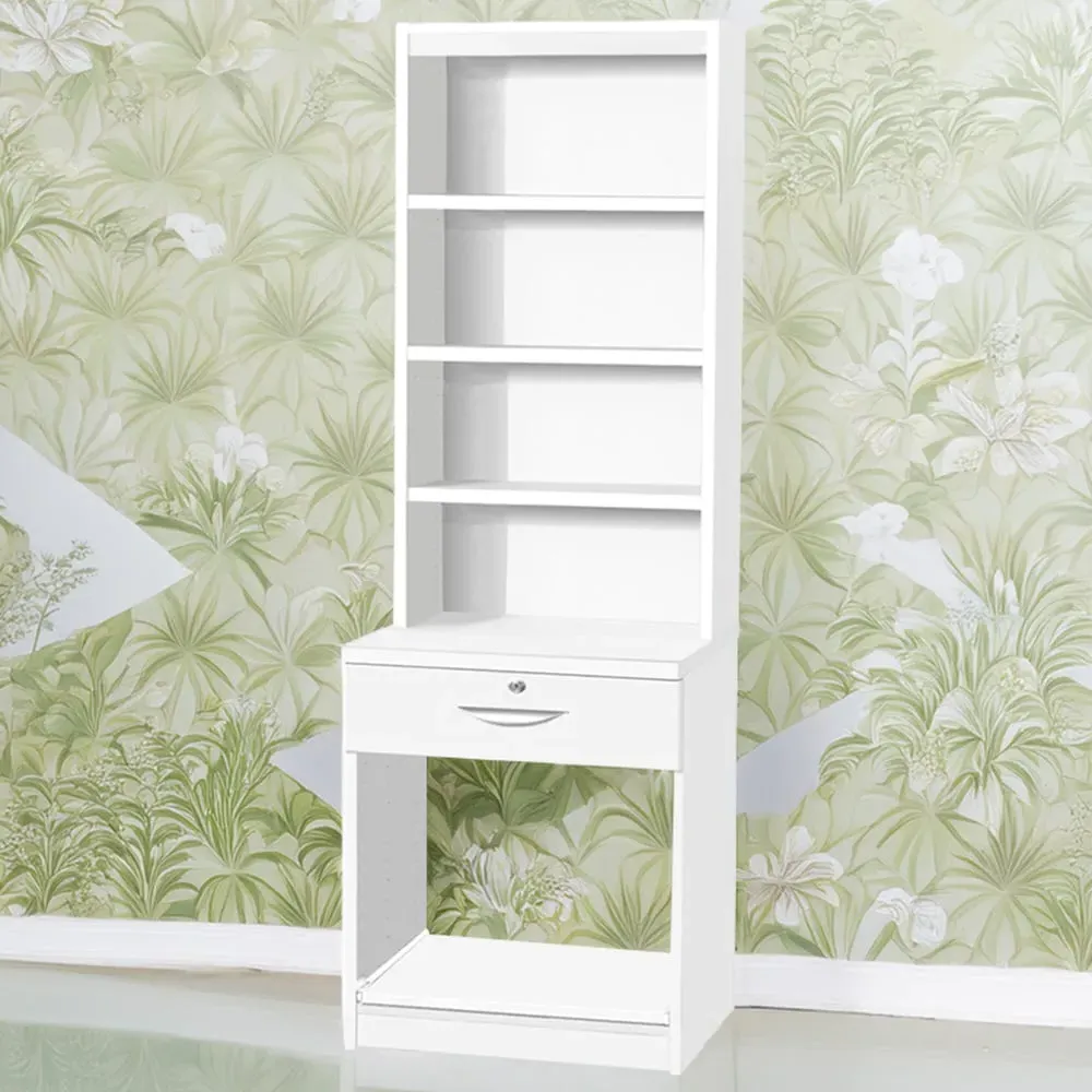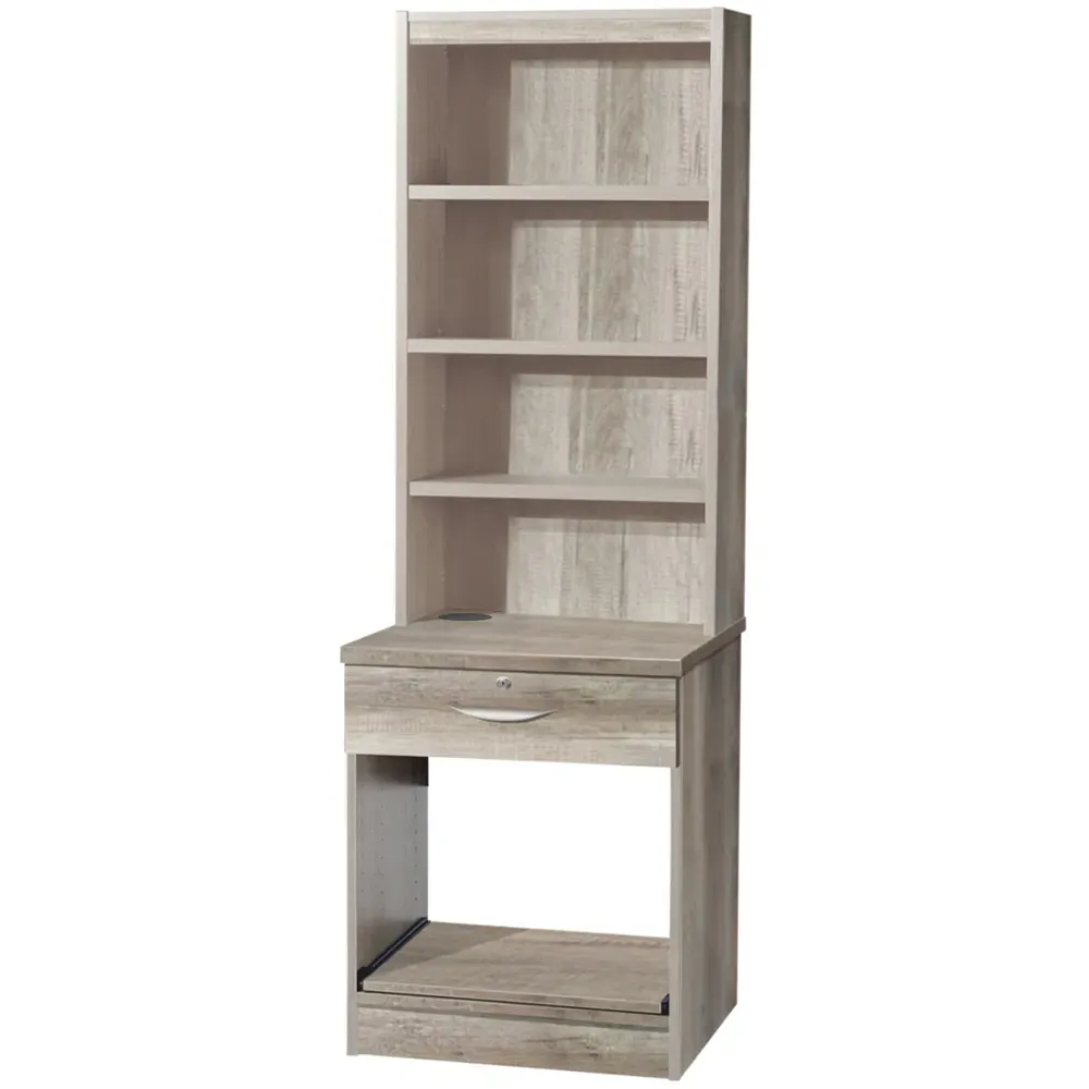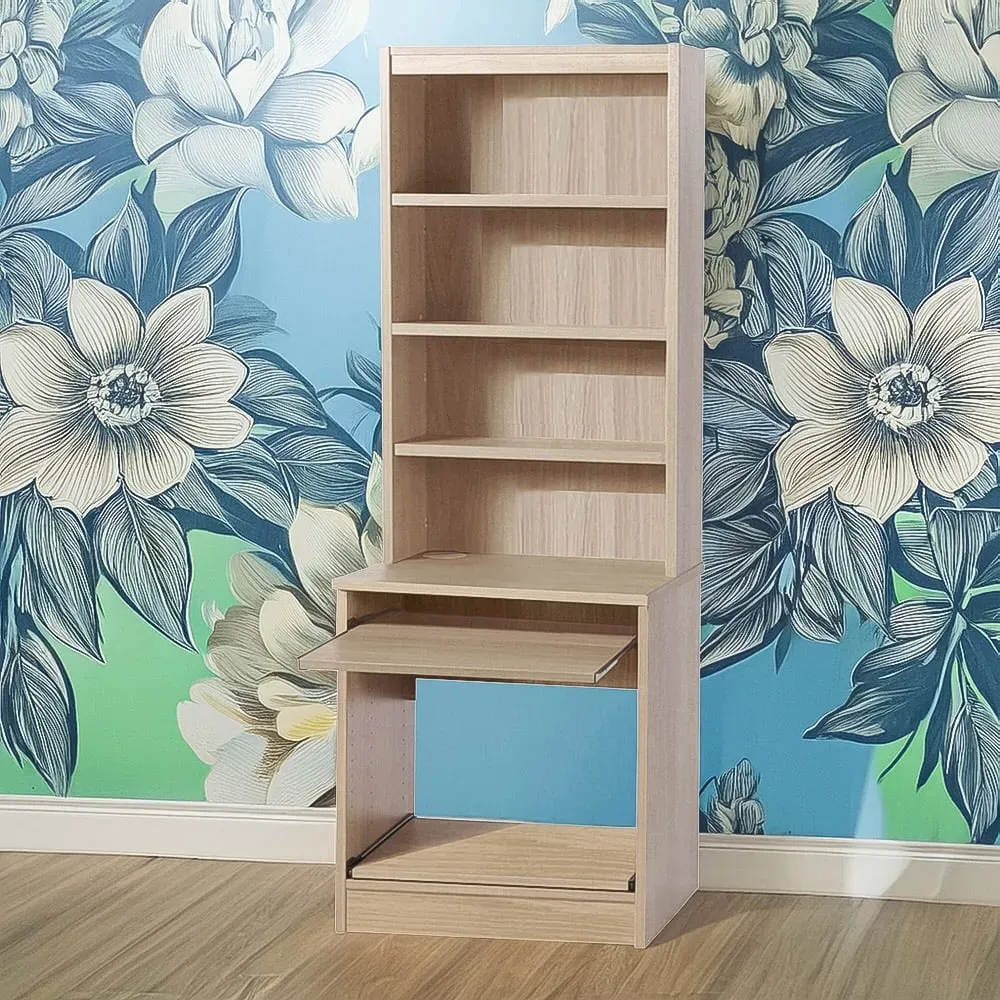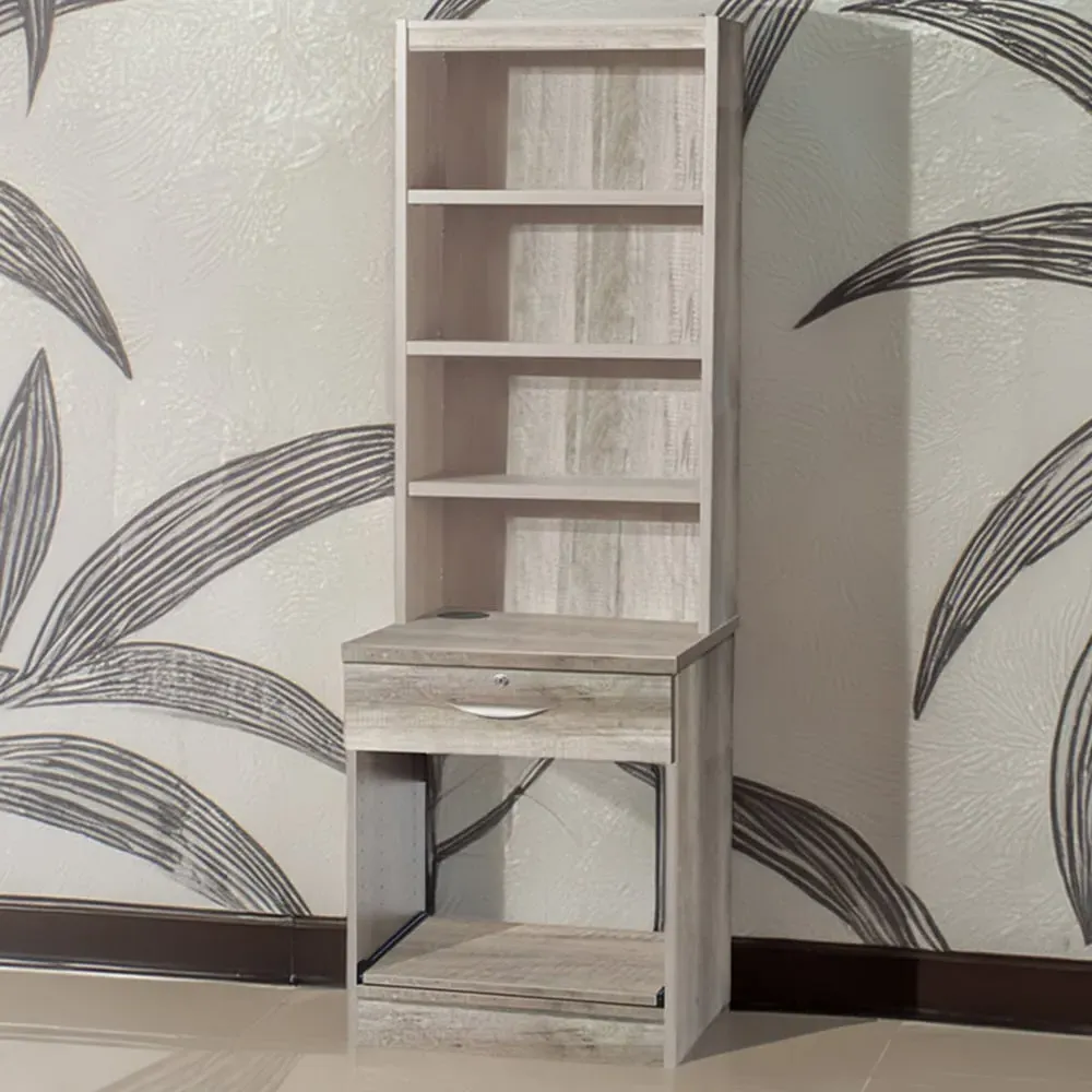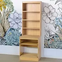 The printer desk stand offers organized storage with its four shelves and integrated hutch design. Its two fully adjustable slide-out printer shelves feature twelve height settings to accommodate various equipment, while the coordinating cable port and management system eliminate wire trapping. The hutch provides additional storage with one fixed shelf and adjustable shelves offering nine height positions. Made from furniture-quality MFC with 18mm thick panels, the unit resists heat and scratches while ensuring structural strength.
