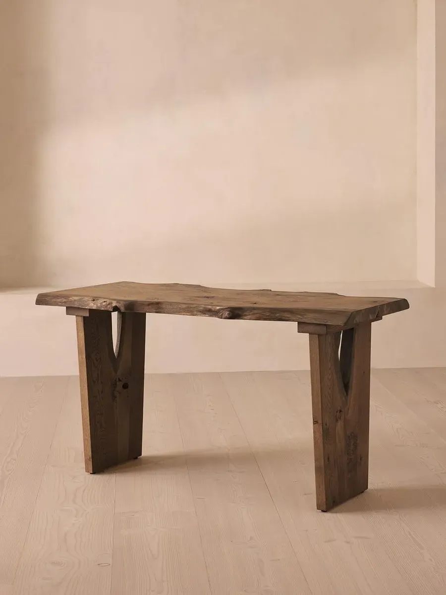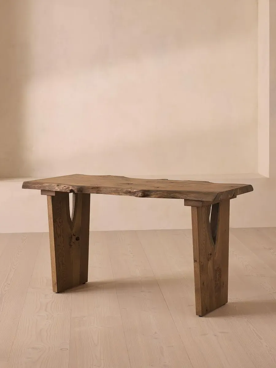 An heirloom piece built from aged oak with a unique live edge and natural knots. Inspired by the rustic interiors of Soho Farmhouse, the Calne desk is built to last a lifetime. Made in the UK from British Pippy oak, its solid silhouette is characterised by an unfinished edge, alongside natural knots and cracks that give every piece a one-of-a-kind finish. A cable-management grommet can be placed on the left, right or in the centre to keep your workspace in order.