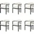 The dining chairs combine ergonomic carver design with contemporary style, featuring comfortable armrests and supportive backrests. The cream textured fabric upholstery provides refined neutral tones, while the black painted rubberwood legs offer modern contrast and sturdy support. The exposed back detail adds a distinctive design accent, and the robust construction handles daily use with a 150kg weight capacity. W59.5 x D56 x H75 cm.