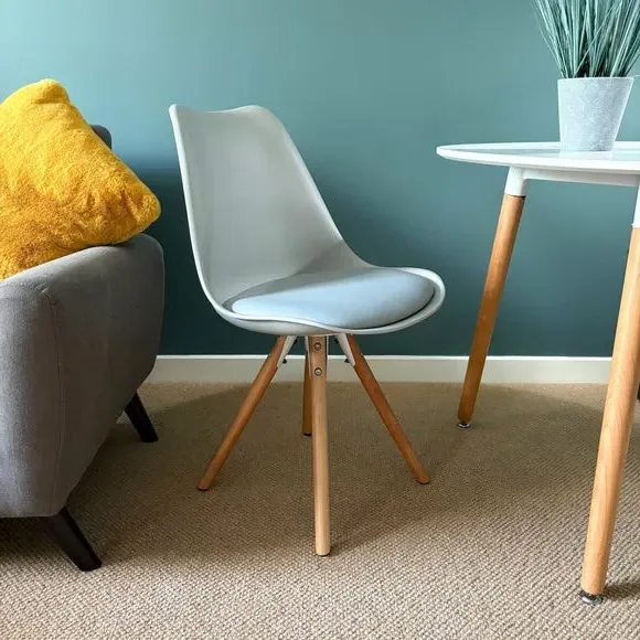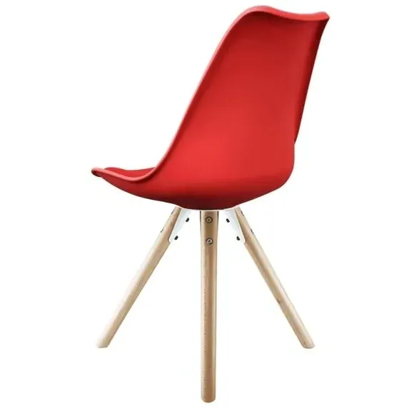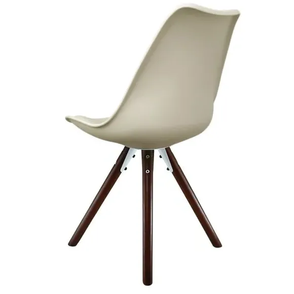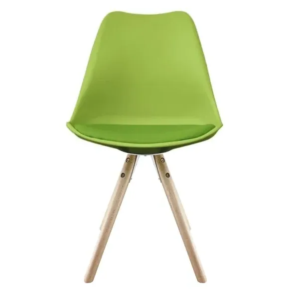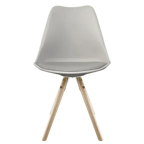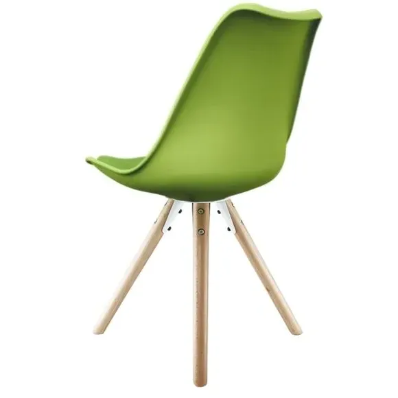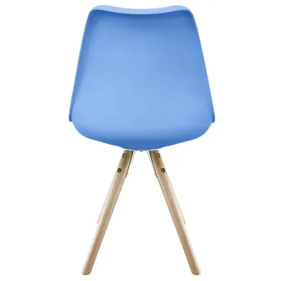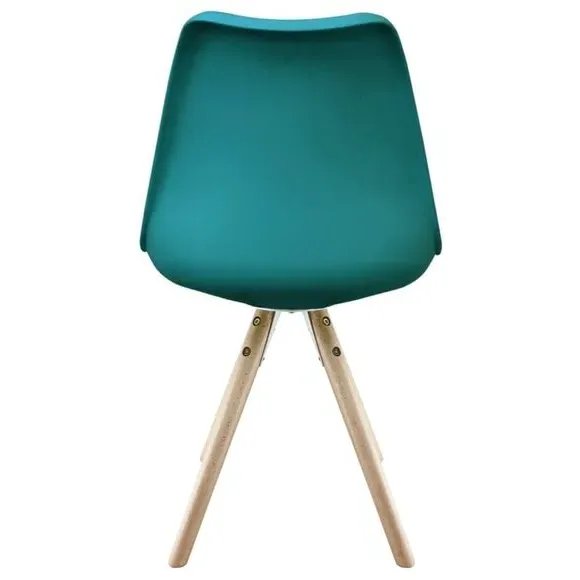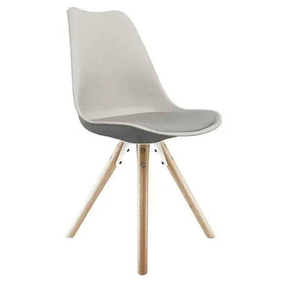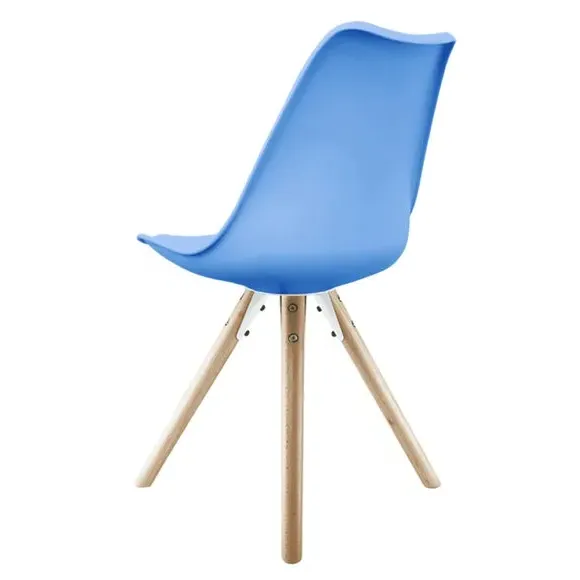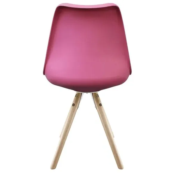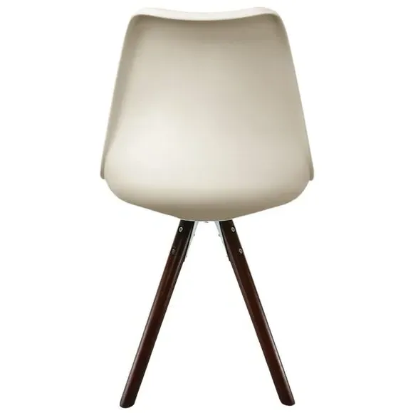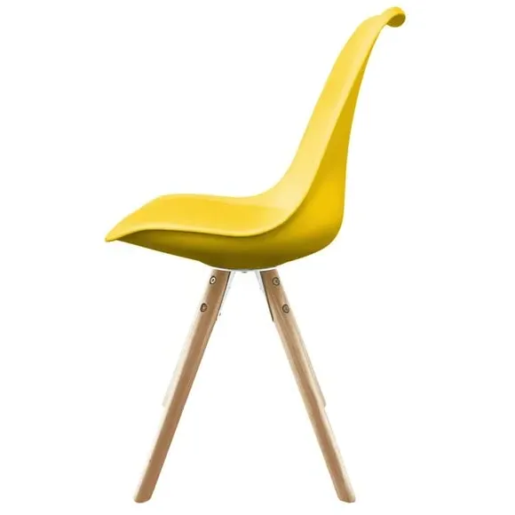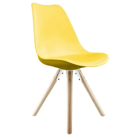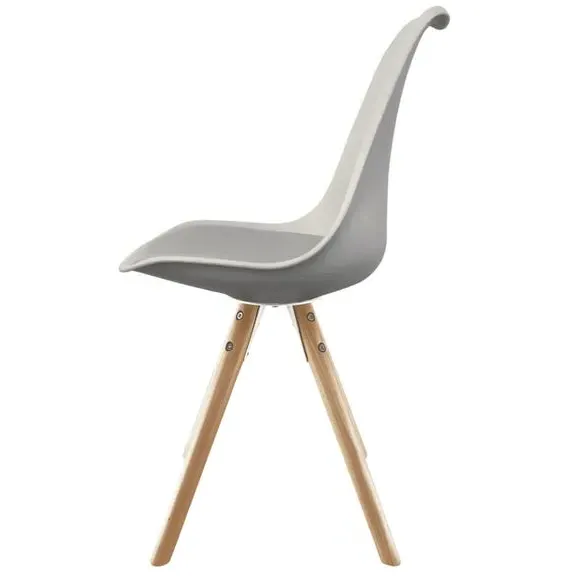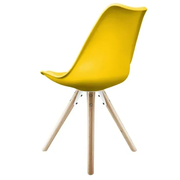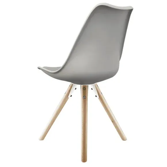 The dining chair combines a curved plastic back with wooden pyramid legs for contemporary appeal. Its removable seat pad provides extra comfort while remaining easy to clean with a damp cloth. The ergonomic curved back offers support during extended use, and the light wood legs ensure a sturdy foundation.