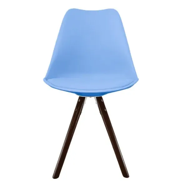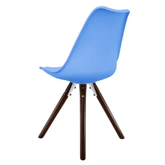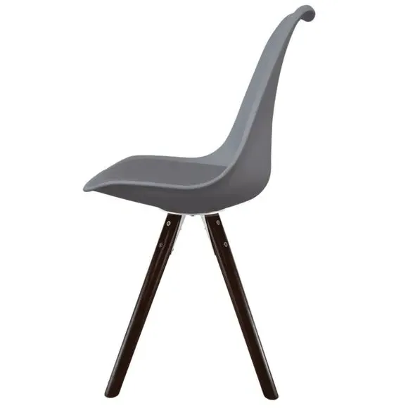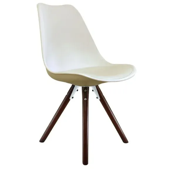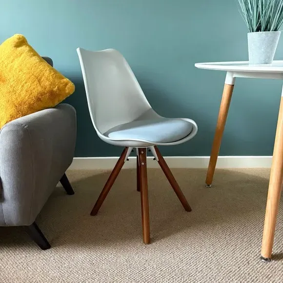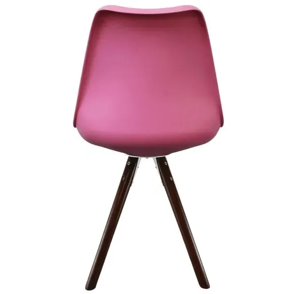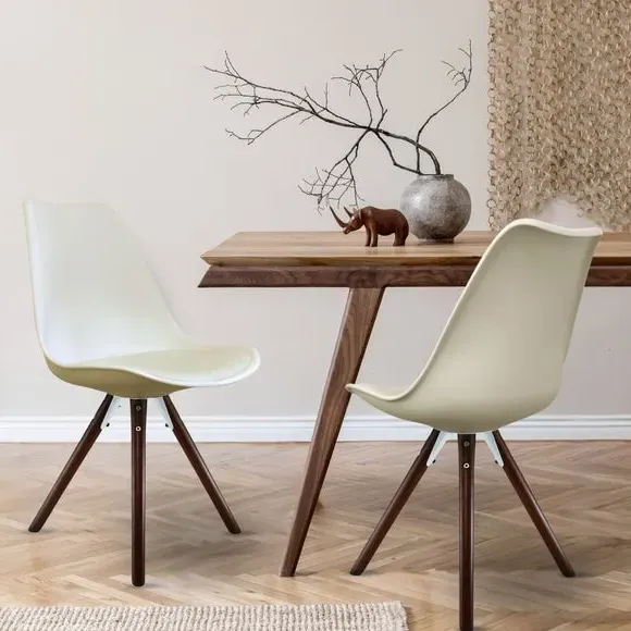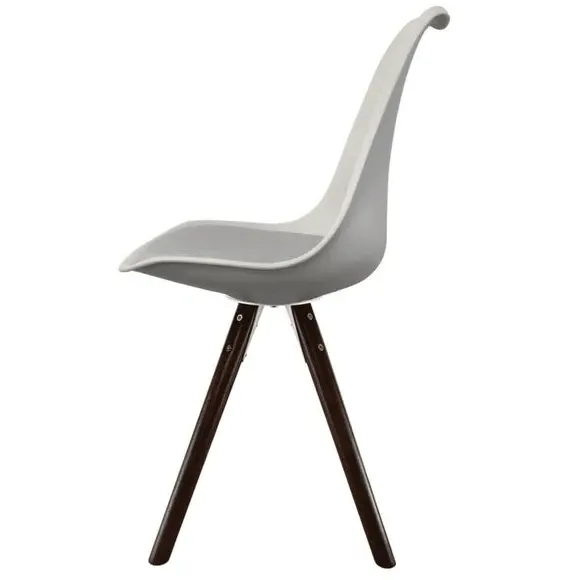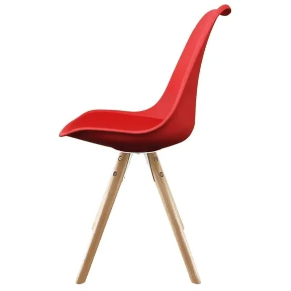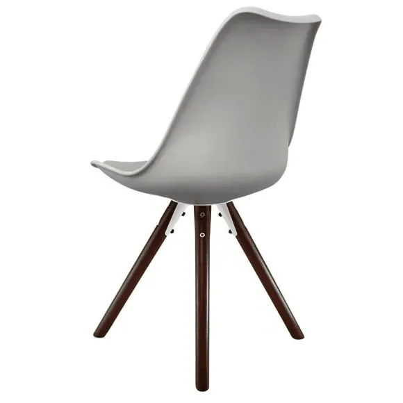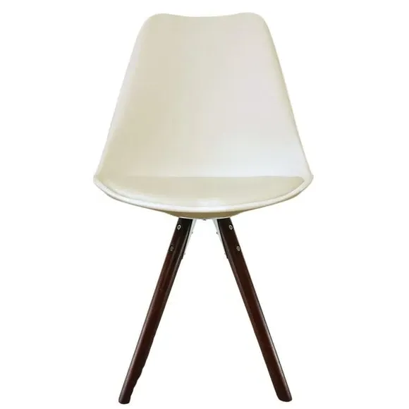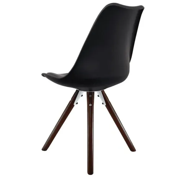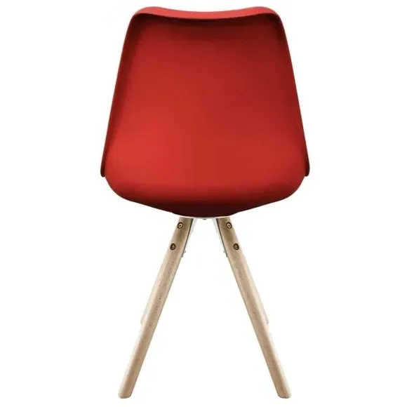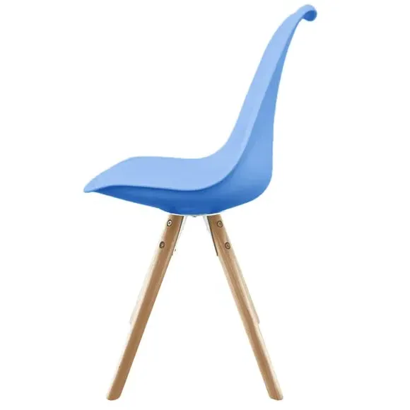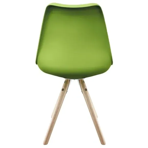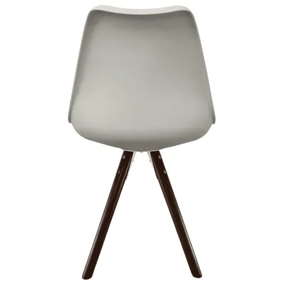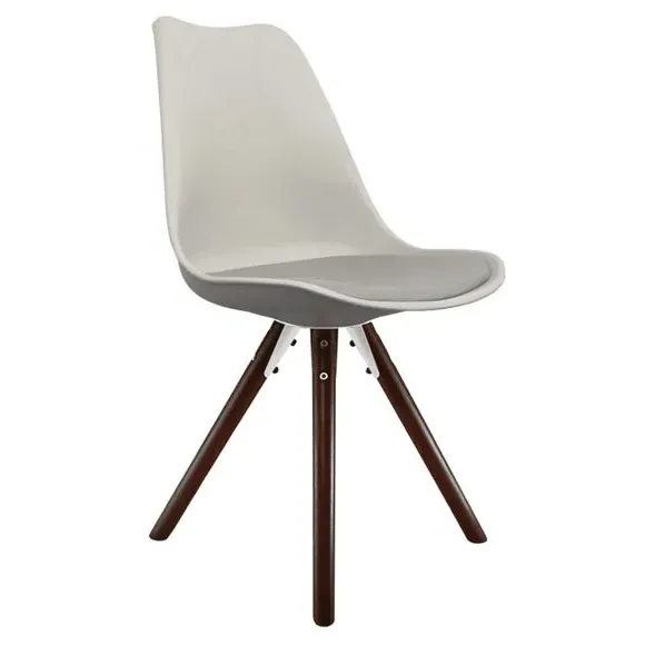 The dining chair combines a curved plastic back with wooden pyramid legs for contemporary appeal. Its removable seat pad provides extra comfort while remaining easy to clean with a damp cloth. The ergonomic curved back offers support during extended use, and the light wood legs ensure a sturdy foundation.