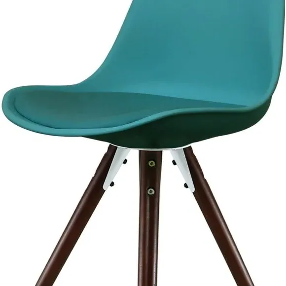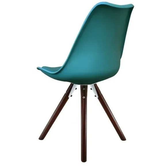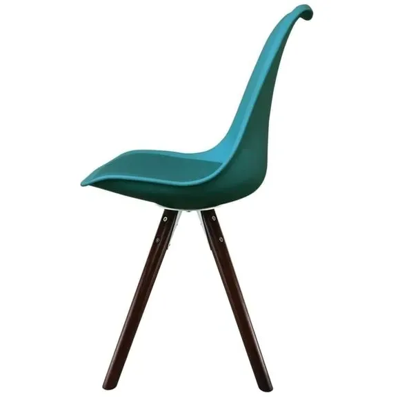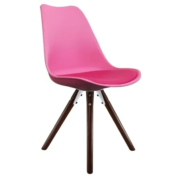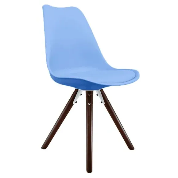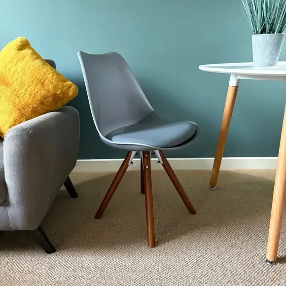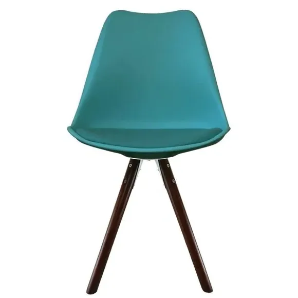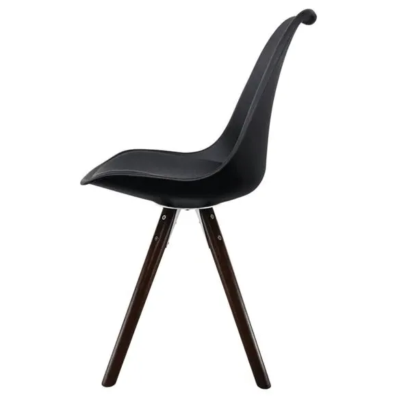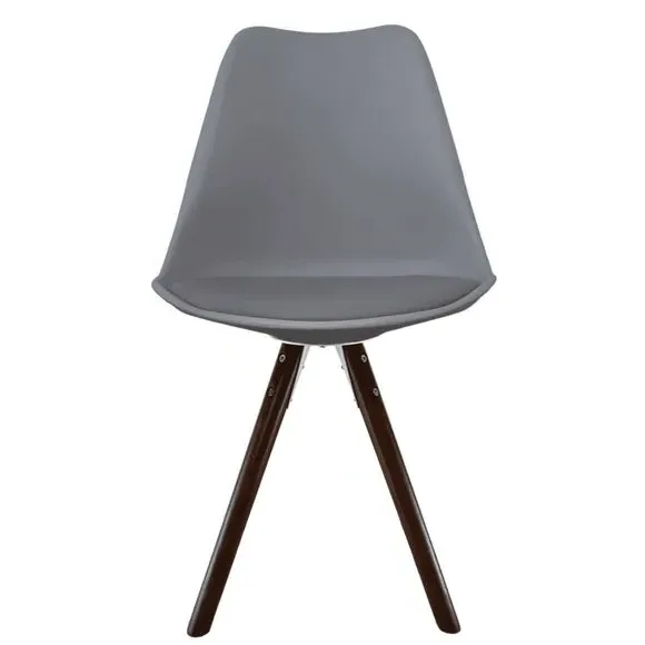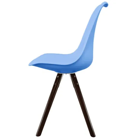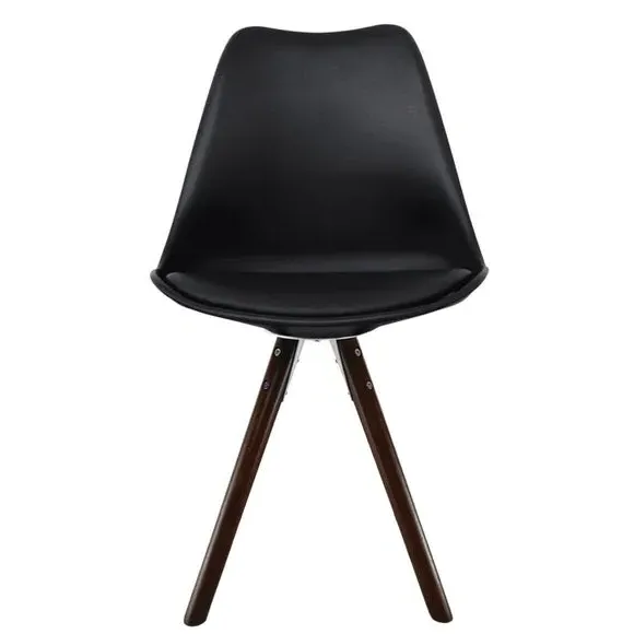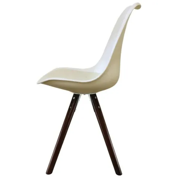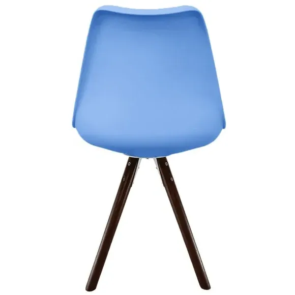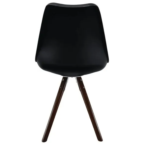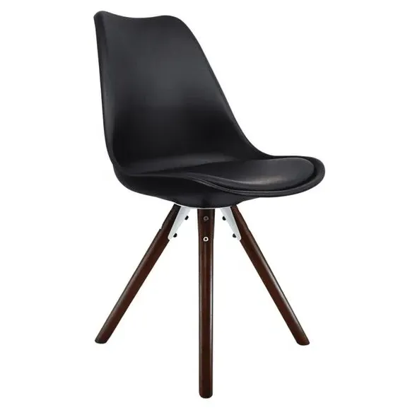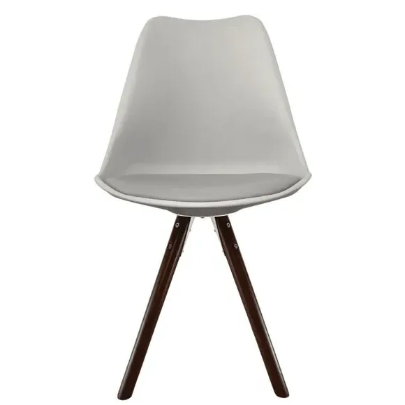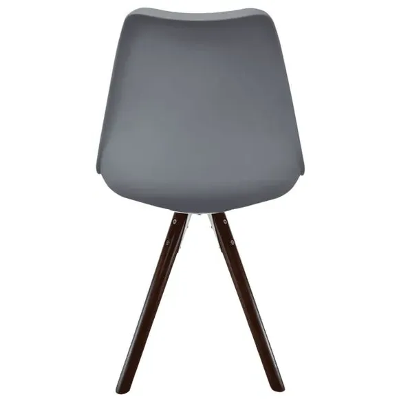 The dining chair combines a curved plastic back with wooden pyramid legs for contemporary appeal. Its removable seat pad provides extra comfort while remaining easy to clean with a damp cloth. The ergonomic curved back offers support during extended use, and the light wood legs ensure a sturdy foundation.