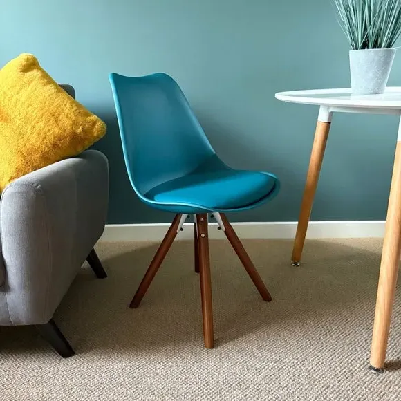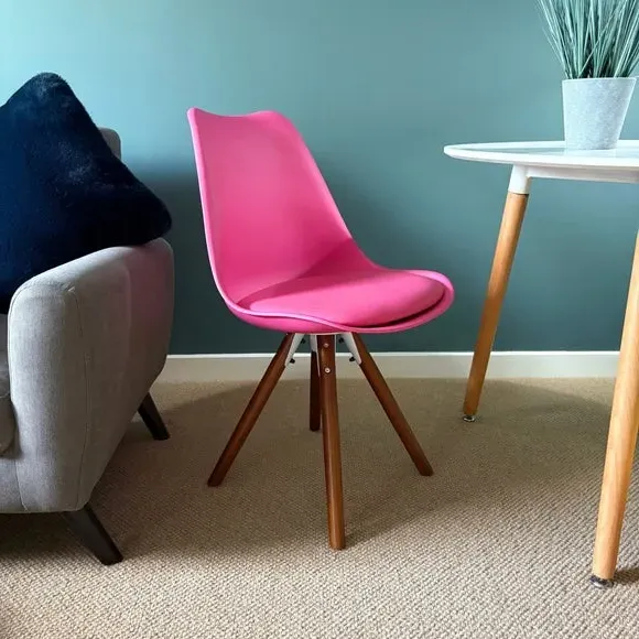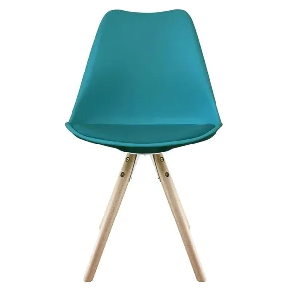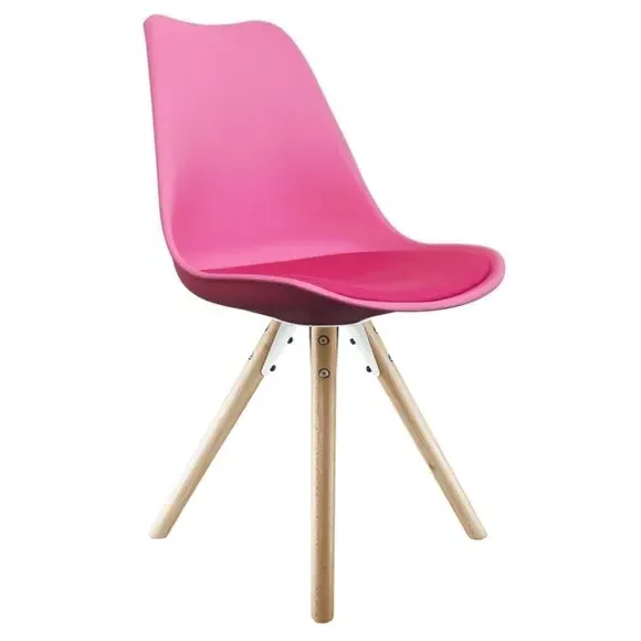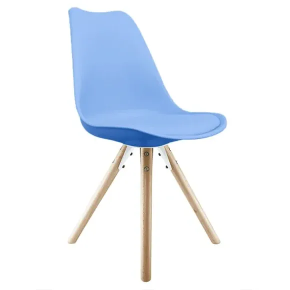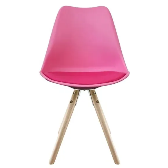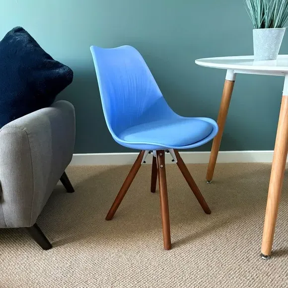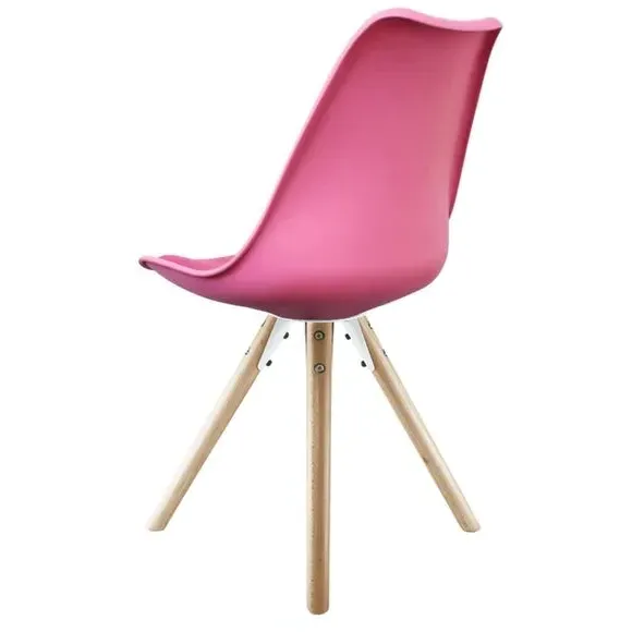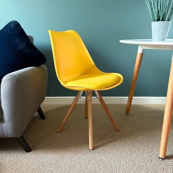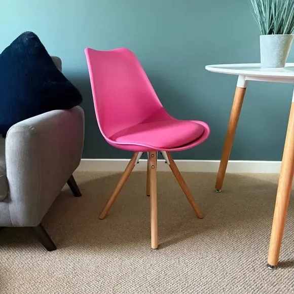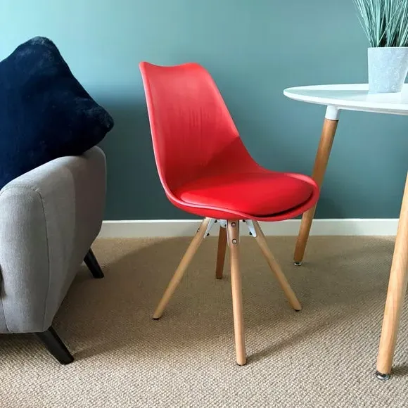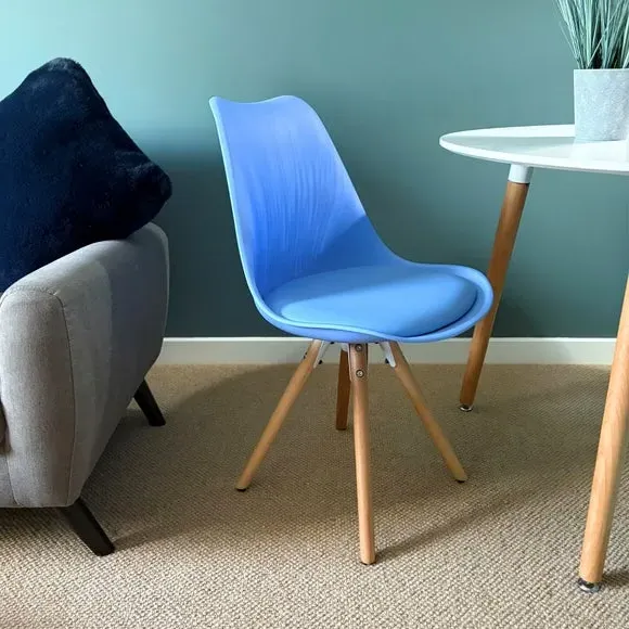 * Removable seat pad* Comfortable and durable* Easy to wipe clean with a damp cloth* Available in a variety of colours* Simple assembly with easy-to-follow instructions Part of a collection of colourful, contemporary plastic dining chairs, this piece combines wooden legs, a curved back, and an easy-to-clean seat pad, making it both stylish and practical. The light wood legs provide a sturdy base, while the curved back offers ergonomic support, ensuring comfort during long, leisurely meals or extended periods of reading at a desk. The seat pad, which is both removable and easy to clean, adds an extra layer of comfort and convenience, making maintenance a breeze.
