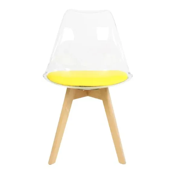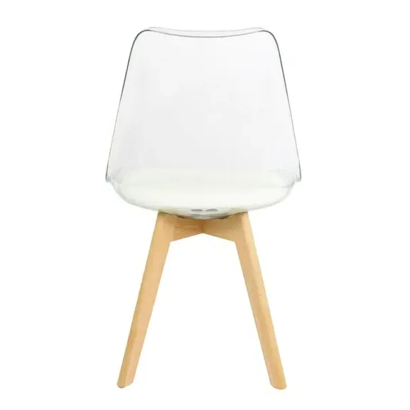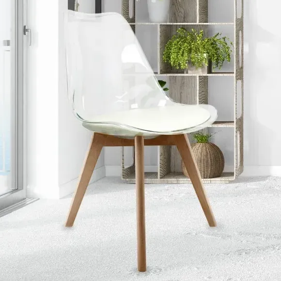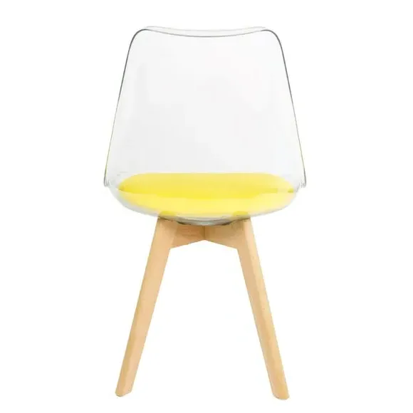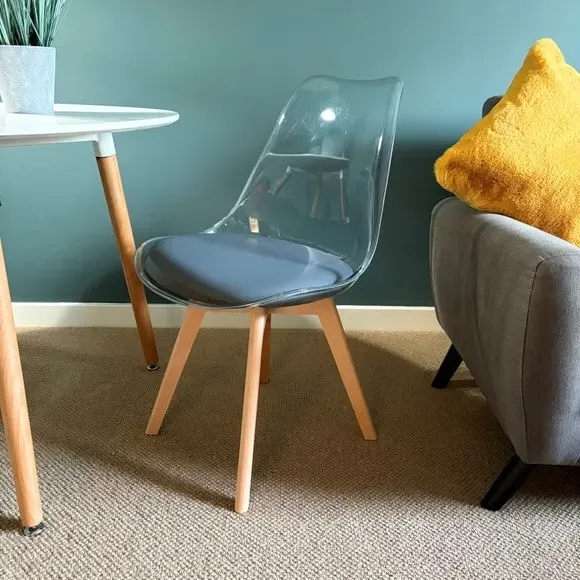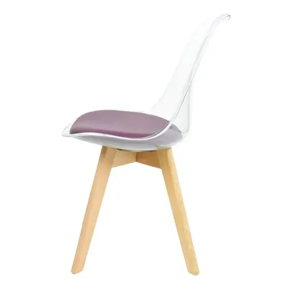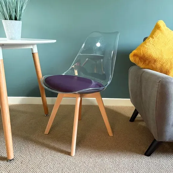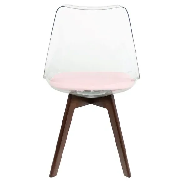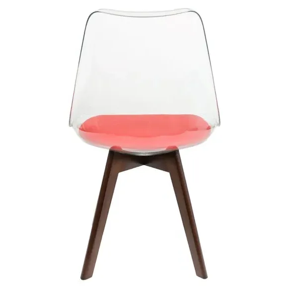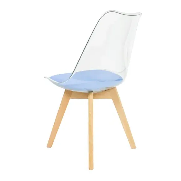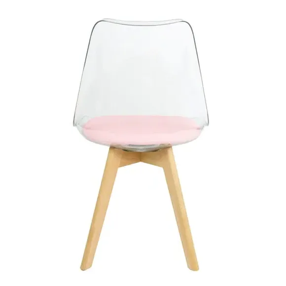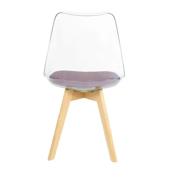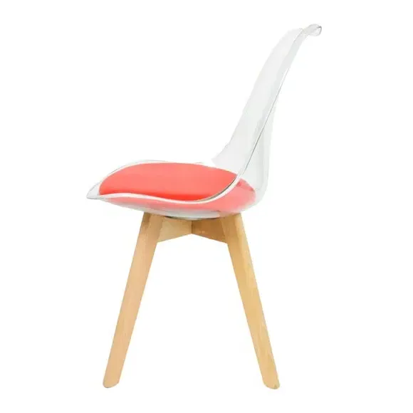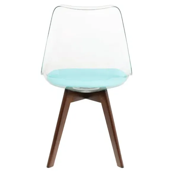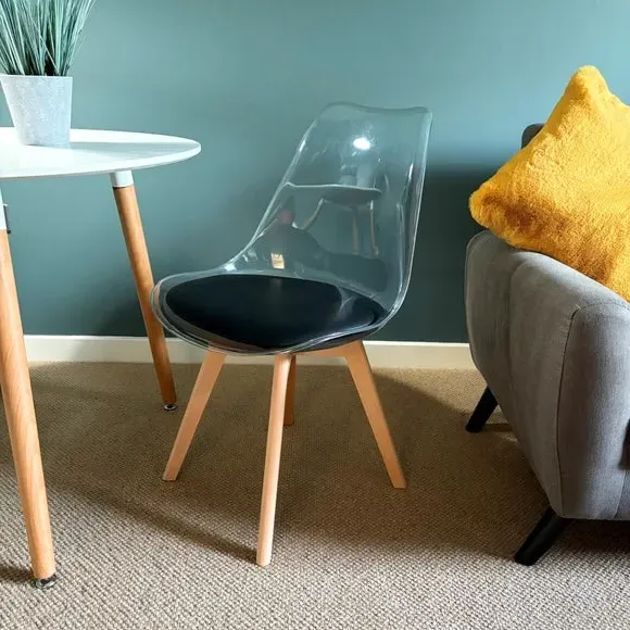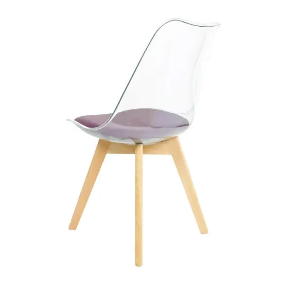 The dining chair combines transparent plastic construction with a removable coloured seat pad for comfort and style. Its contoured clear seat features curvaceous design, while the four squared light wood legs provide exceptional sturdiness. The seat pad wipes clean easily with a damp cloth, and the chair requires simple assembly with straightforward instructions.