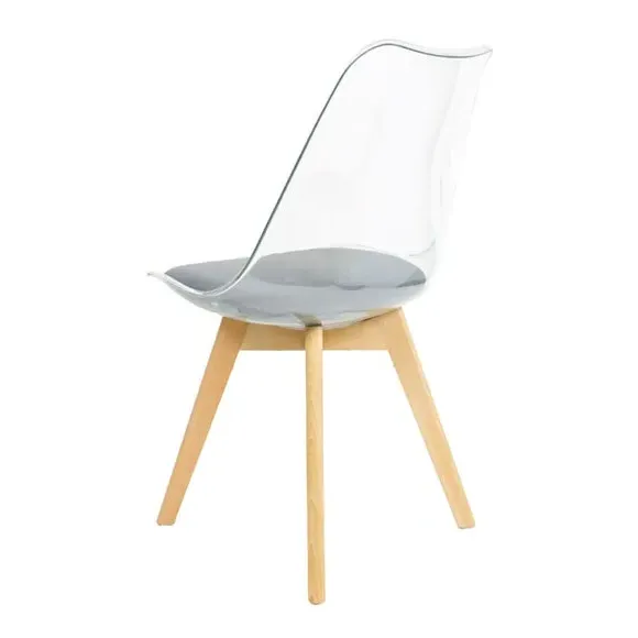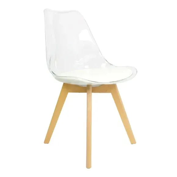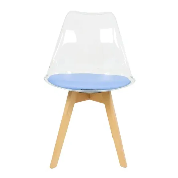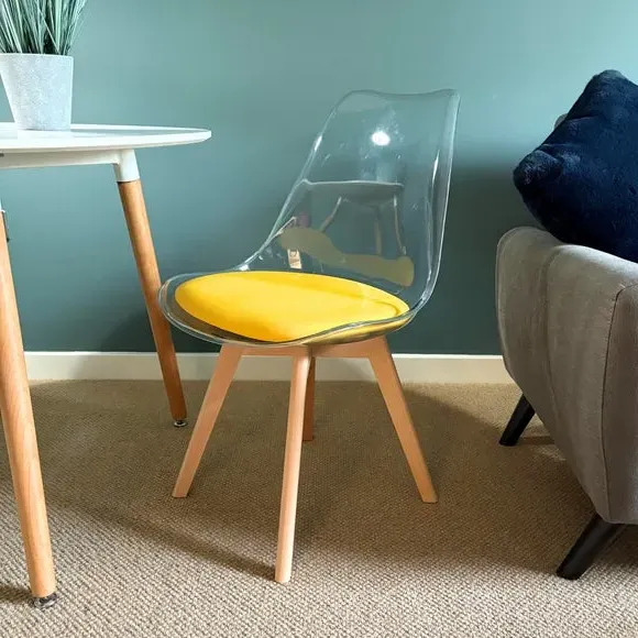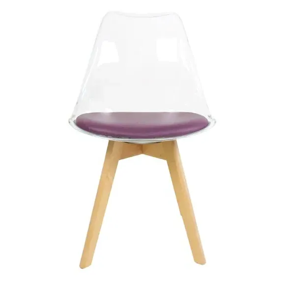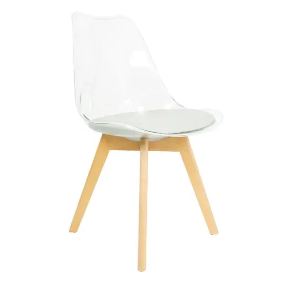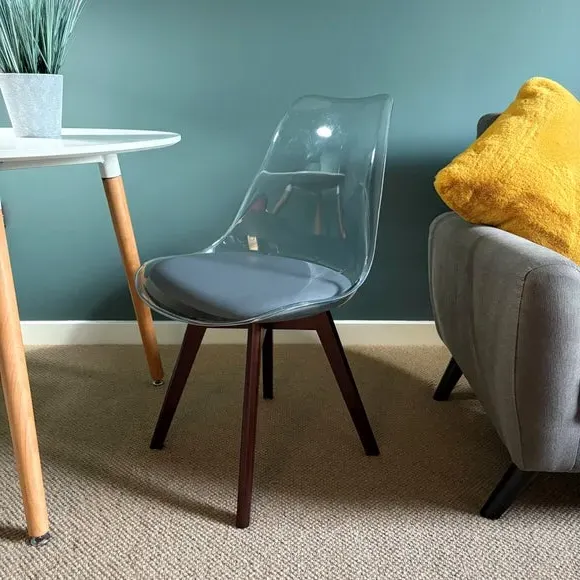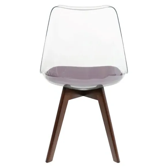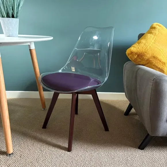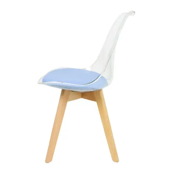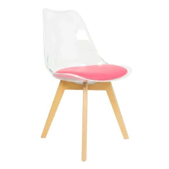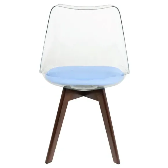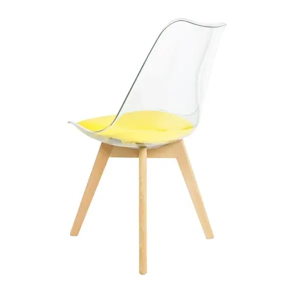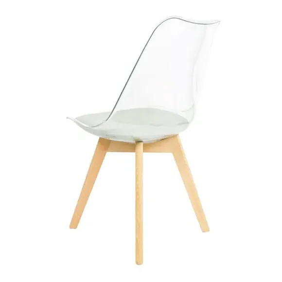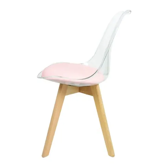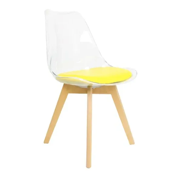 The dining chair combines transparent plastic construction with a removable coloured seat pad for comfort and style. Its contoured clear seat features curvaceous design, while the four squared light wood legs provide exceptional sturdiness. The seat pad wipes clean easily with a damp cloth, and the chair requires simple assembly with straightforward instructions.