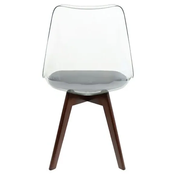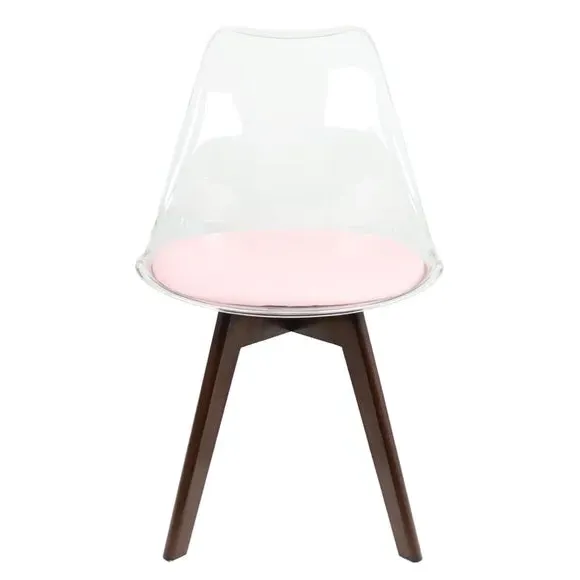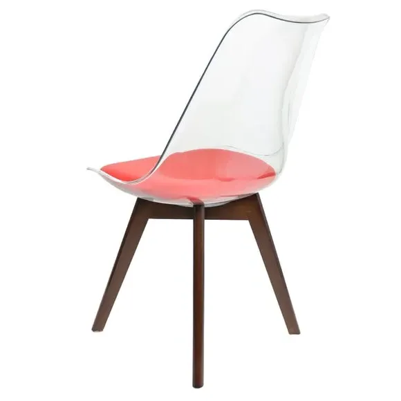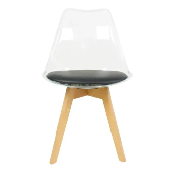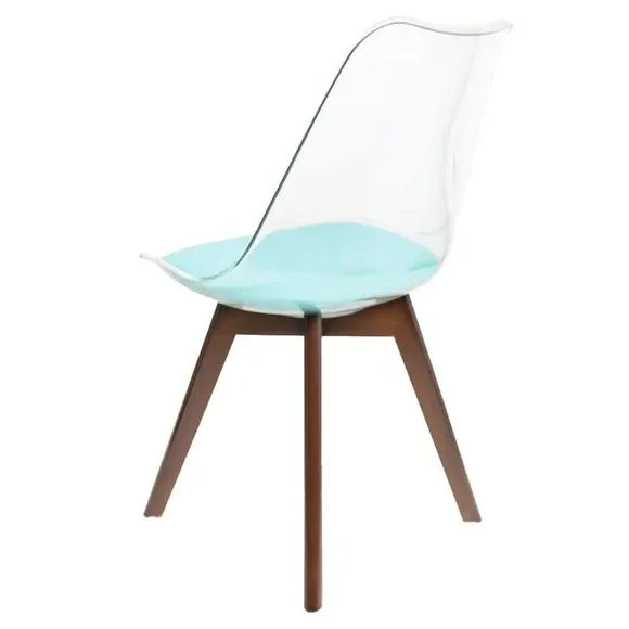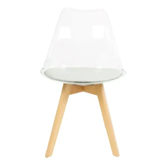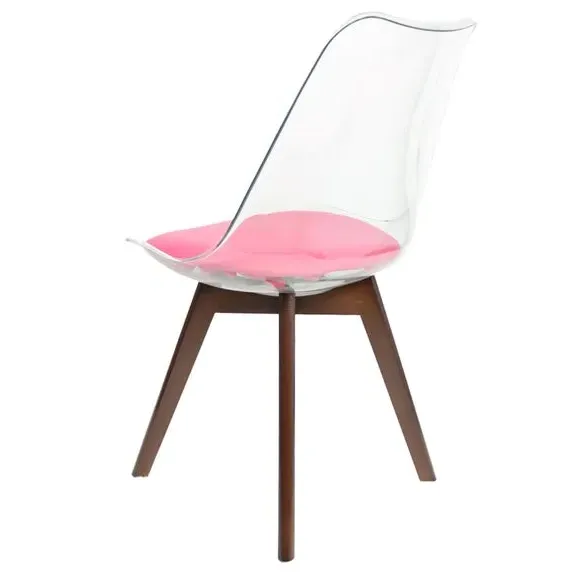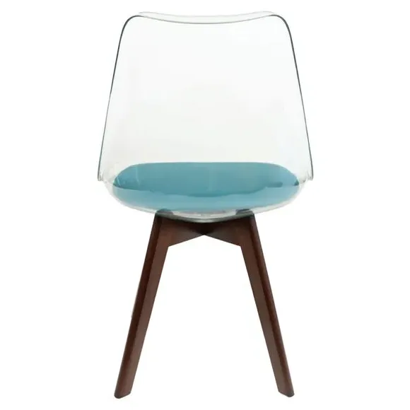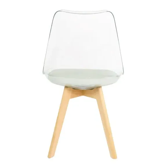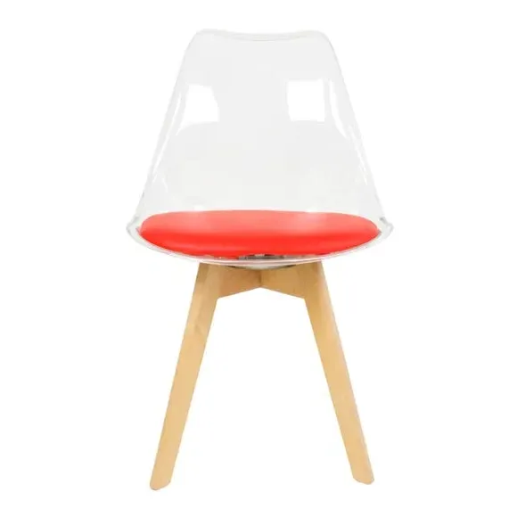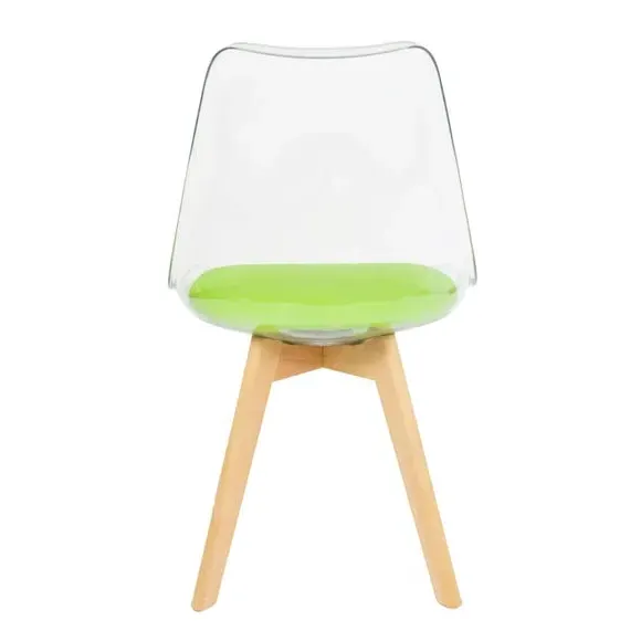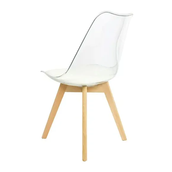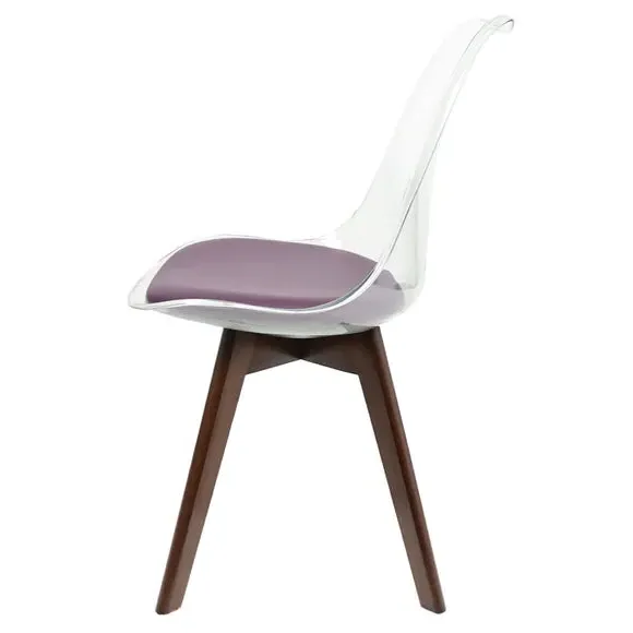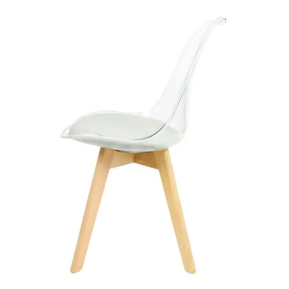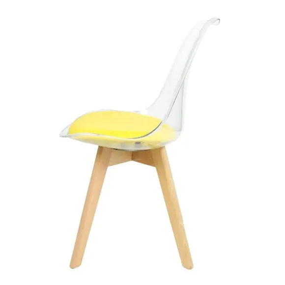 The dining chair combines transparent plastic construction with a removable coloured seat pad for comfort and style. Its contoured clear seat features curvaceous design, while the four squared light wood legs provide exceptional sturdiness. The seat pad wipes clean easily with a damp cloth, and the chair requires simple assembly with straightforward instructions.