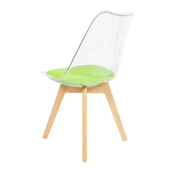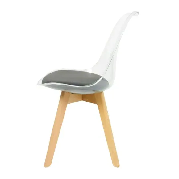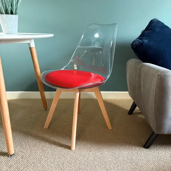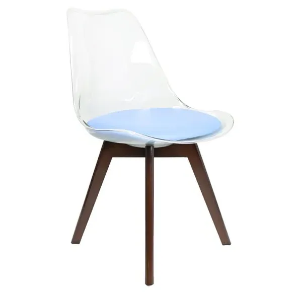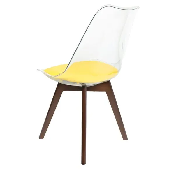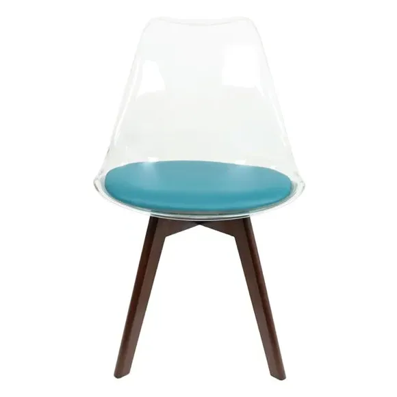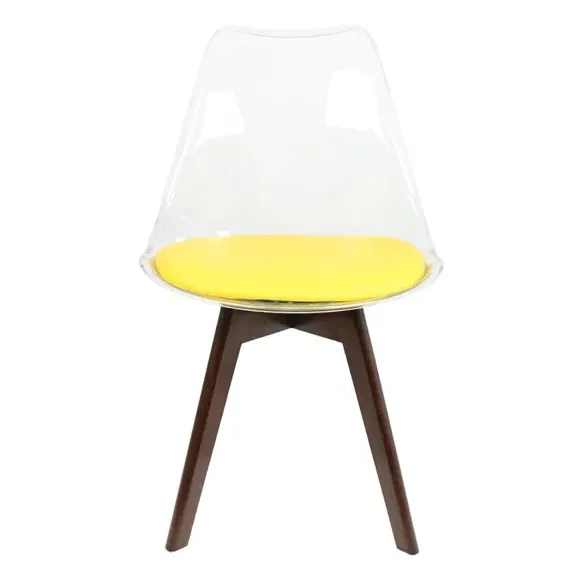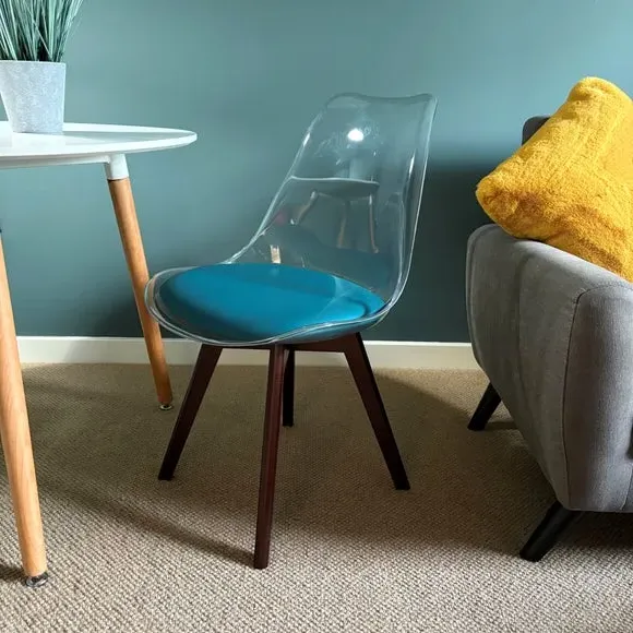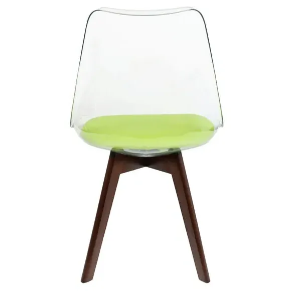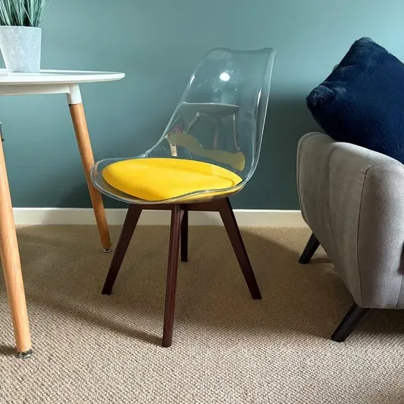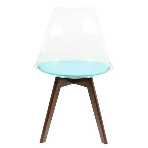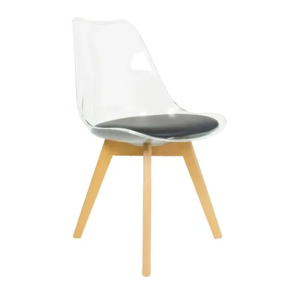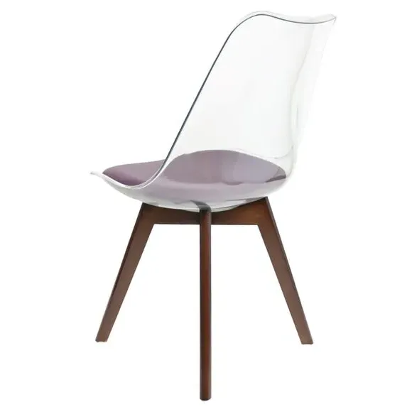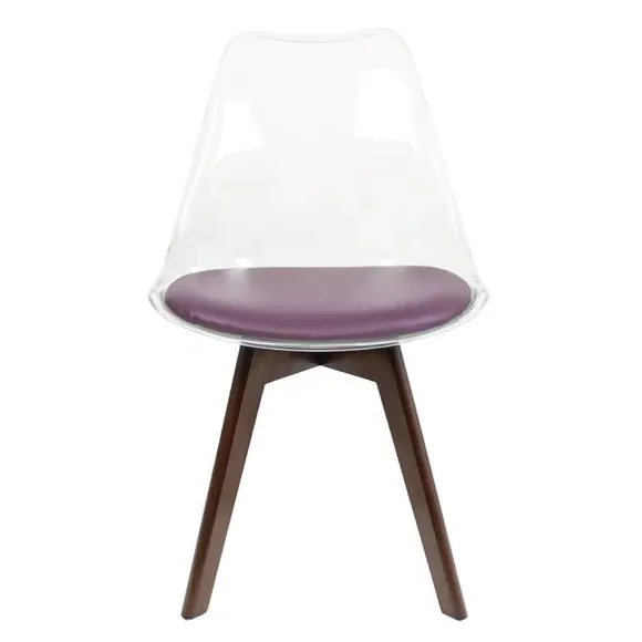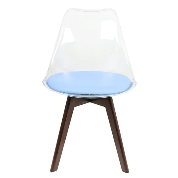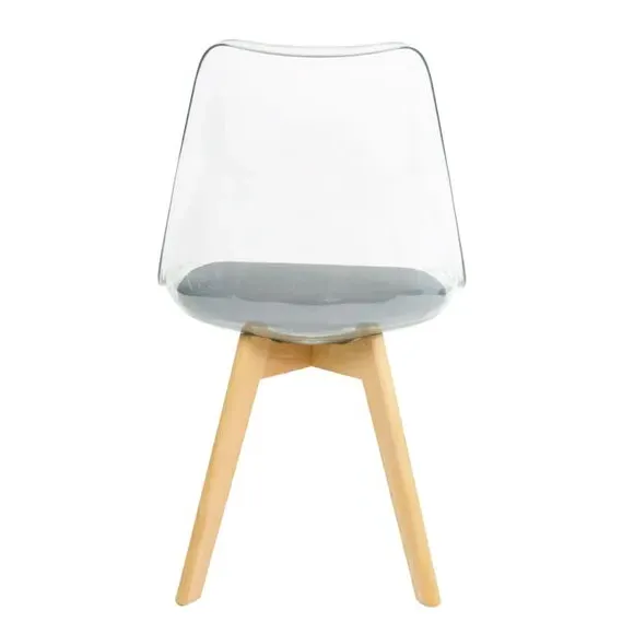 The dining chair combines transparent plastic construction with a removable coloured seat pad for comfort and style. Its contoured clear seat features curvaceous design, while the four squared light wood legs provide exceptional sturdiness. The seat pad wipes clean easily with a damp cloth, and the chair requires simple assembly with straightforward instructions.