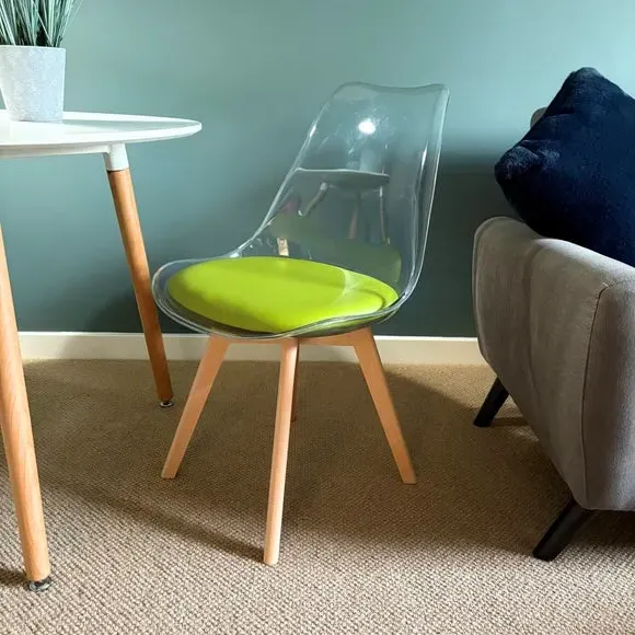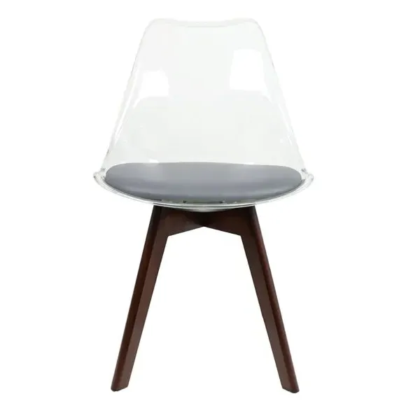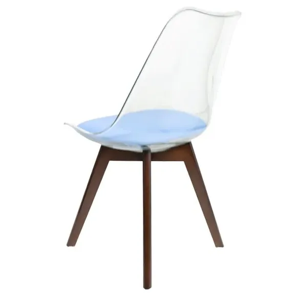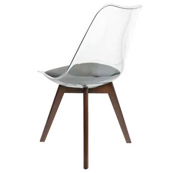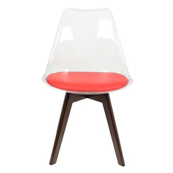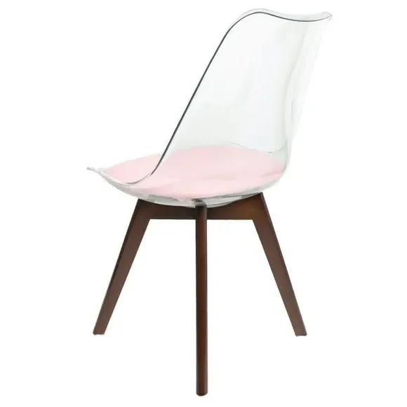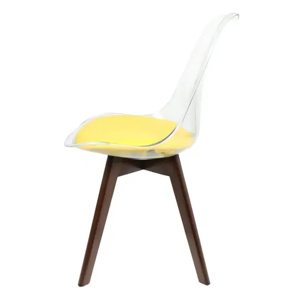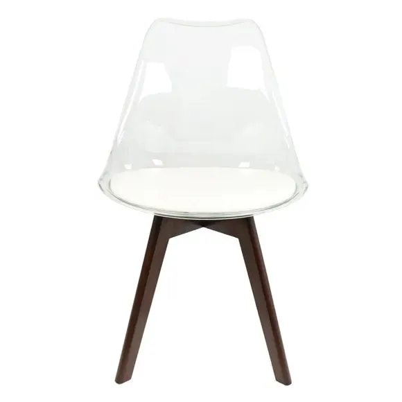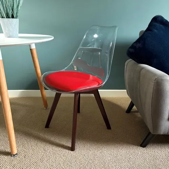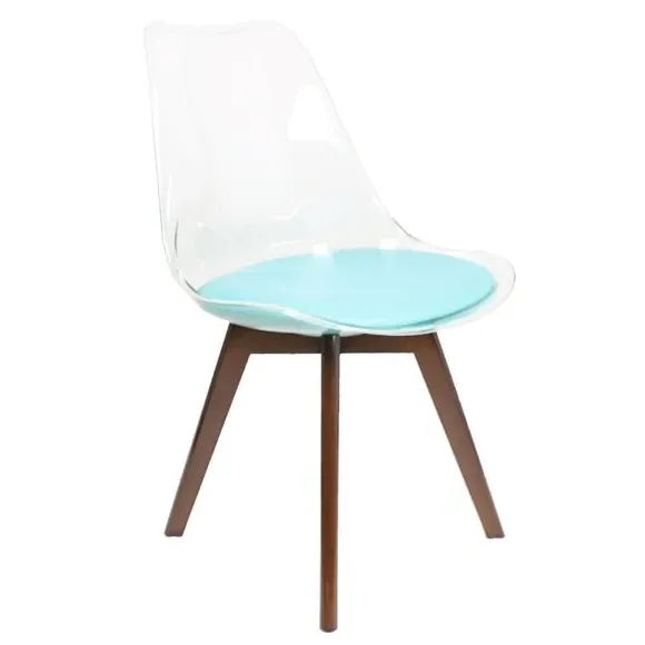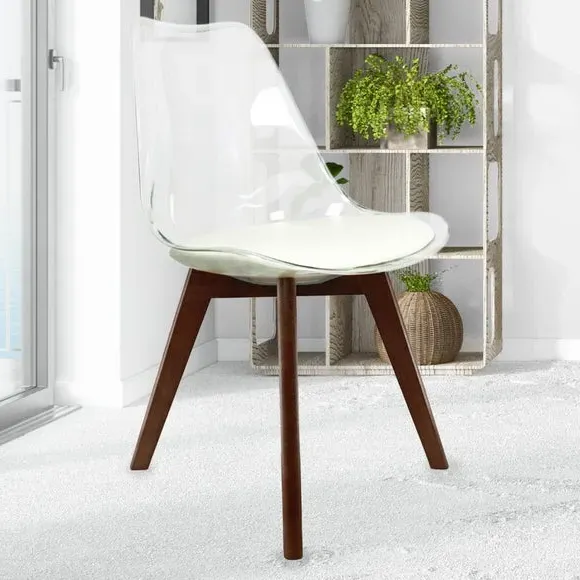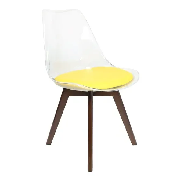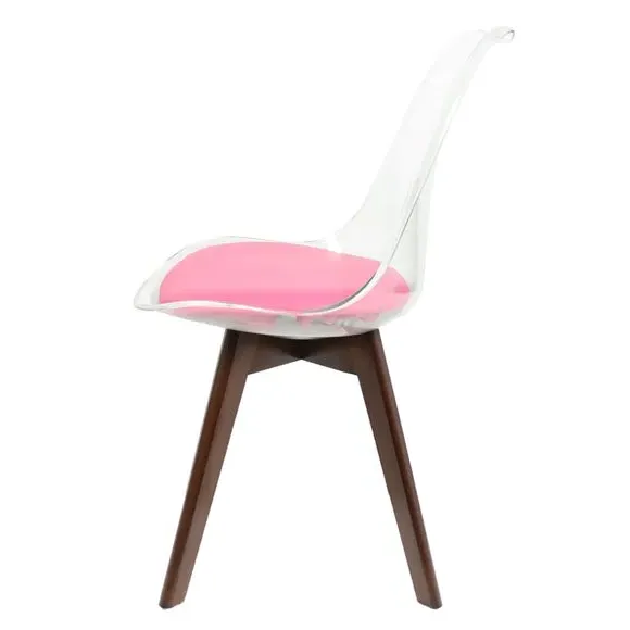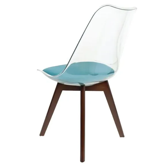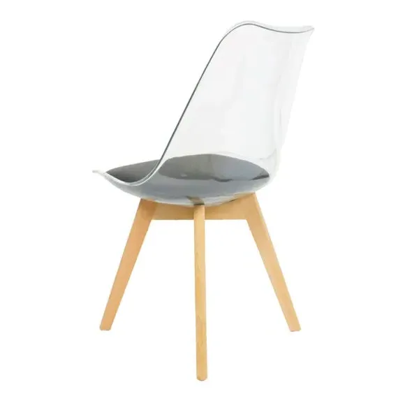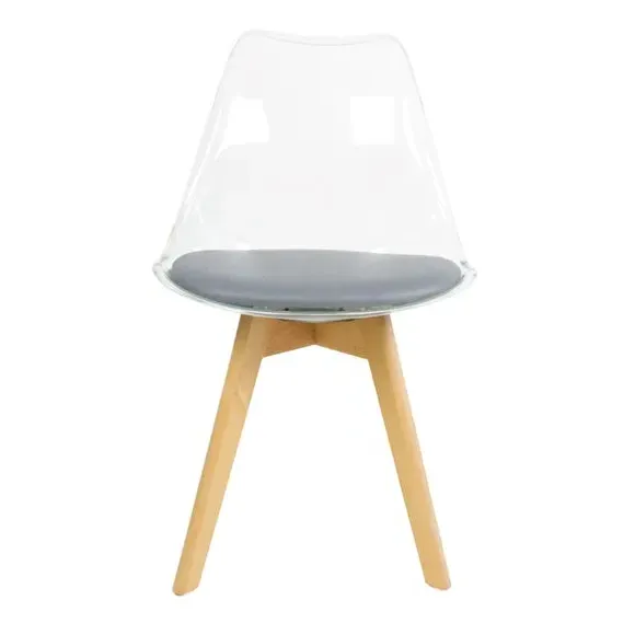 The dining chair combines transparent plastic construction with a removable coloured seat pad for comfort and style. Its contoured clear seat features curvaceous design, while the four squared light wood legs provide exceptional sturdiness. The seat pad wipes clean easily with a damp cloth, and the chair requires simple assembly with straightforward instructions.