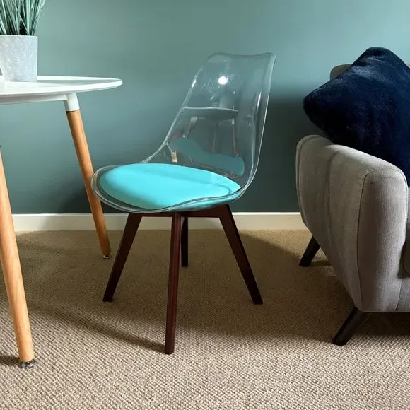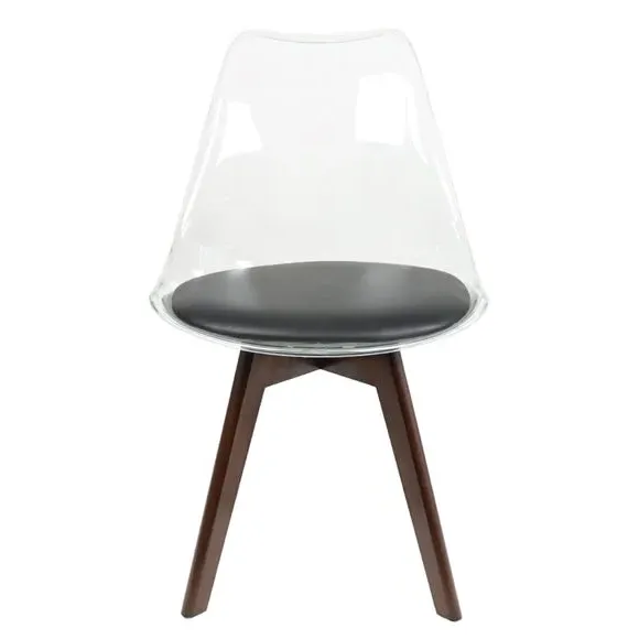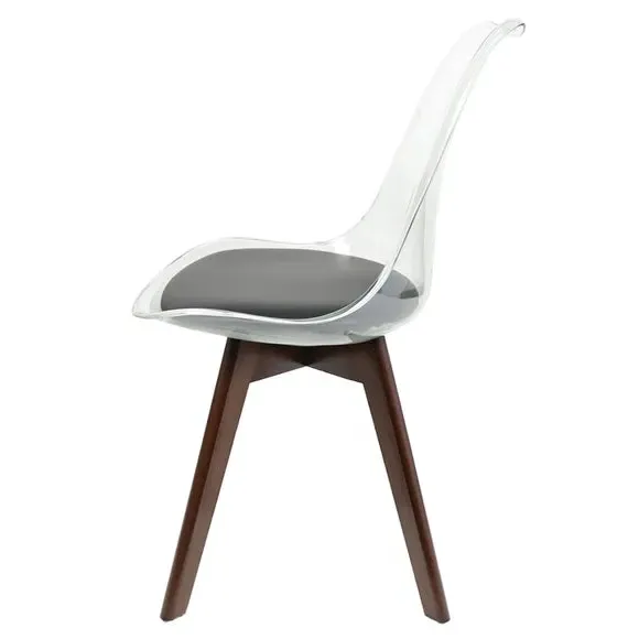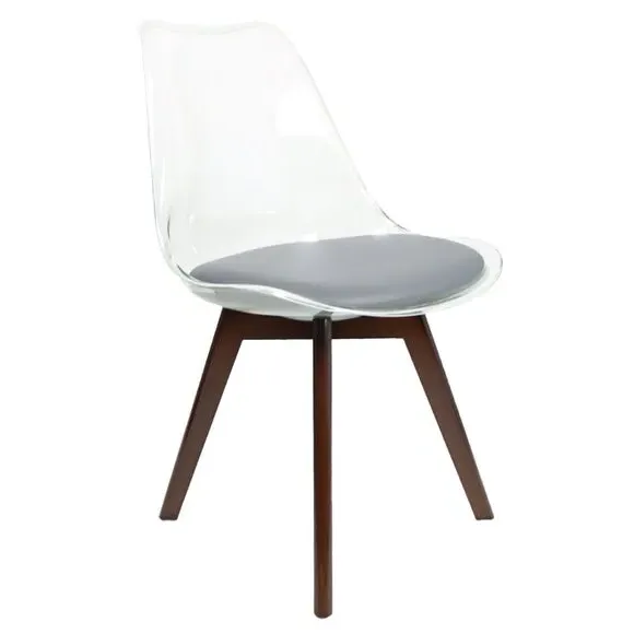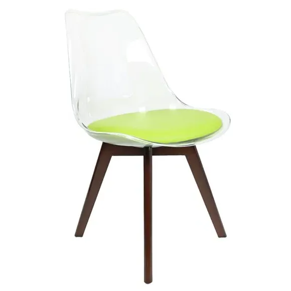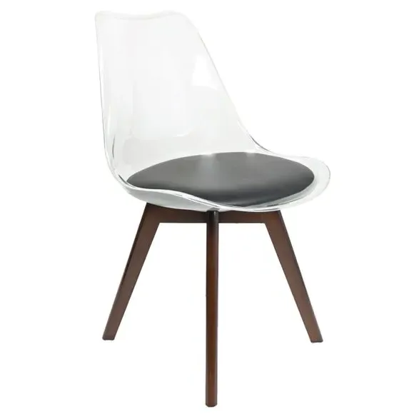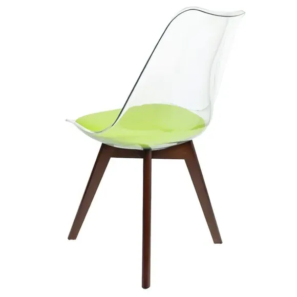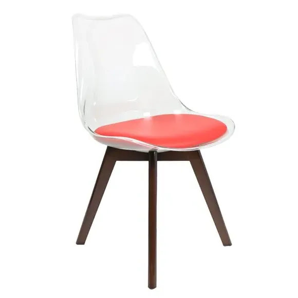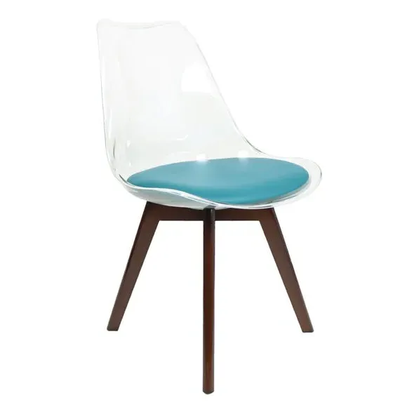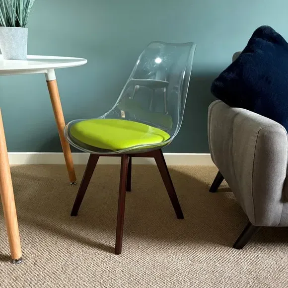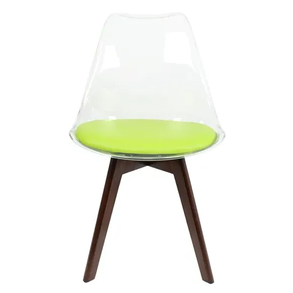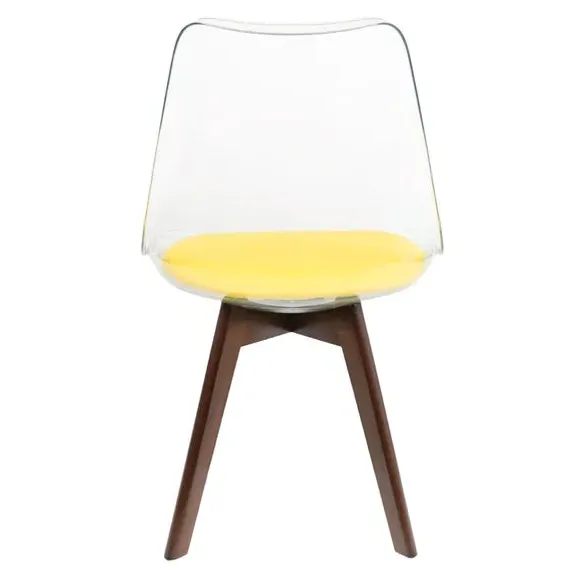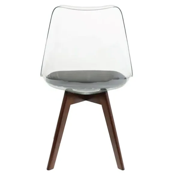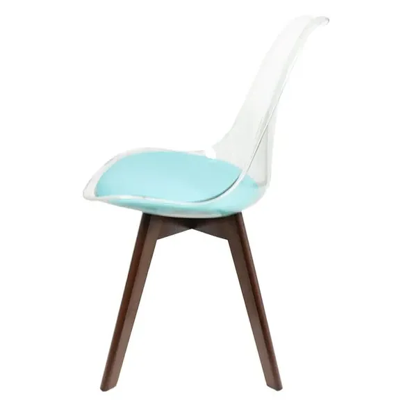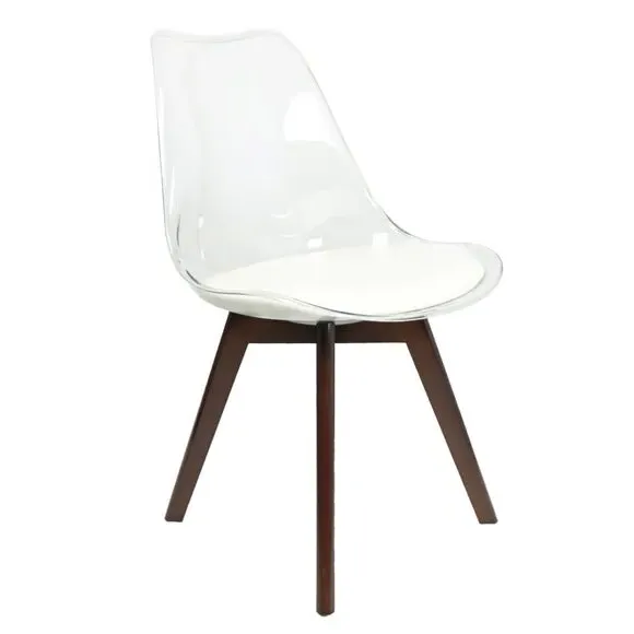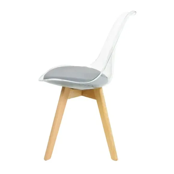 The dining chair combines transparent plastic construction with a removable coloured seat pad for comfort and style. Its contoured clear seat features curvaceous design, while the four squared light wood legs provide exceptional sturdiness. The seat pad wipes clean easily with a damp cloth, and the chair requires simple assembly with straightforward instructions.