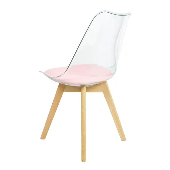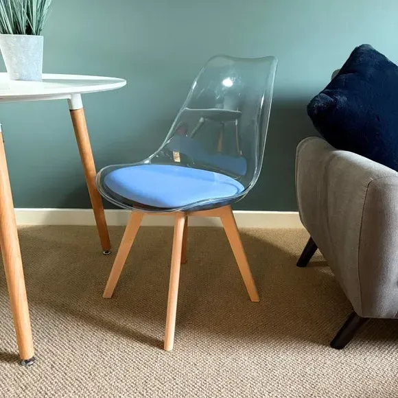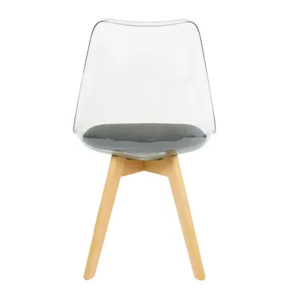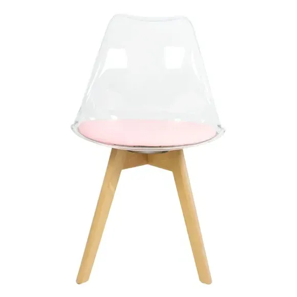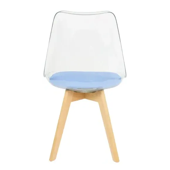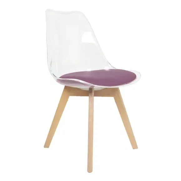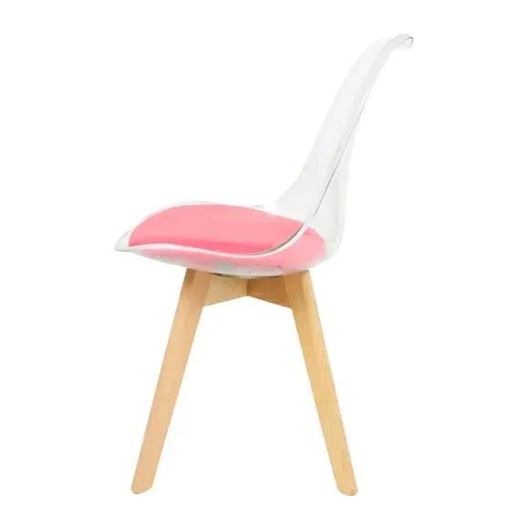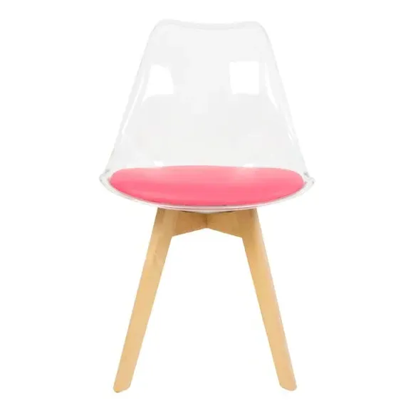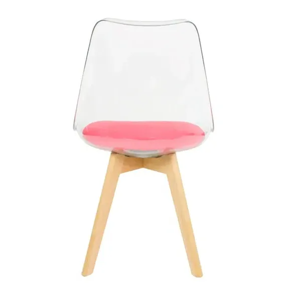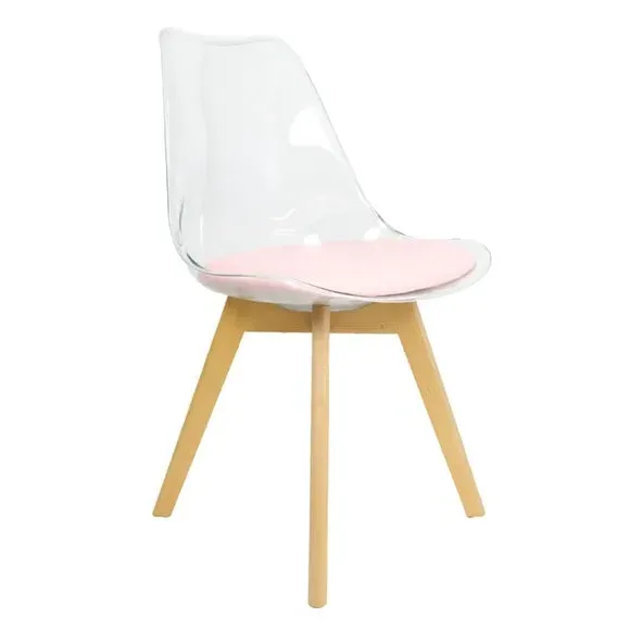 * Removable seat pad* Comfortable and durable* Easy to wipe clean with a damp cloth* Available in a variety of colours* Simple assembly with easy-to-follow instructions Part of a collection that effortlessly blends design and practicality, this chair features a transparent plastic curvaceous seat and a soft, easy-to-clean, colourful seat pad, making it both stylish and comfortable. The contoured, clear seat and four squared light wood legs not only look great but also provide exceptional sturdiness.