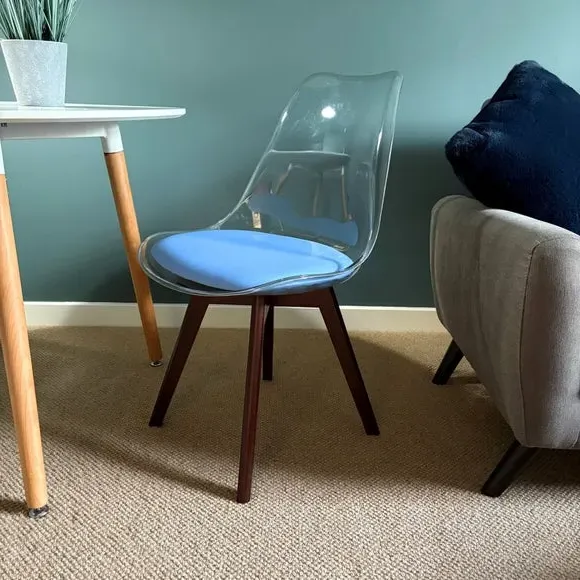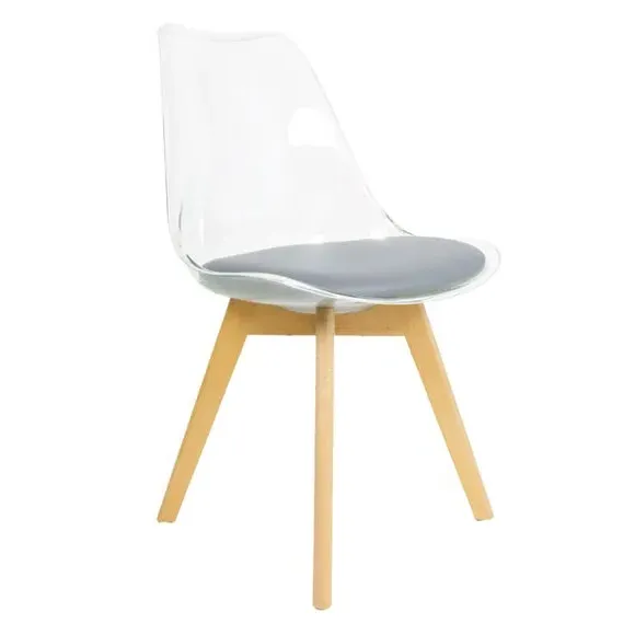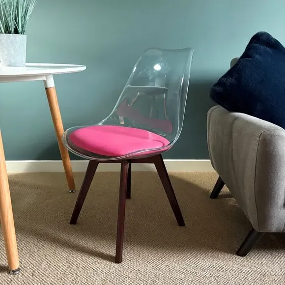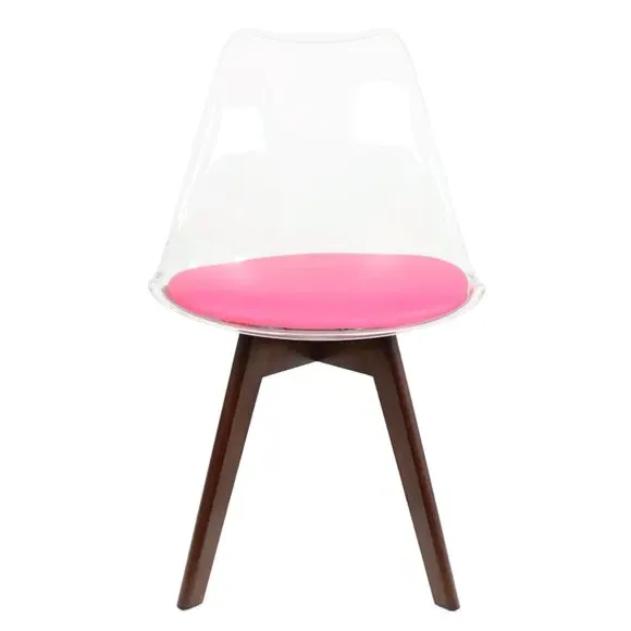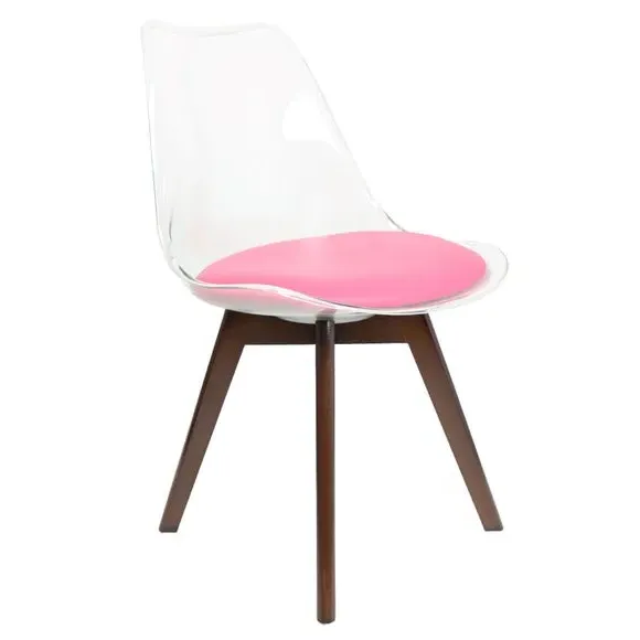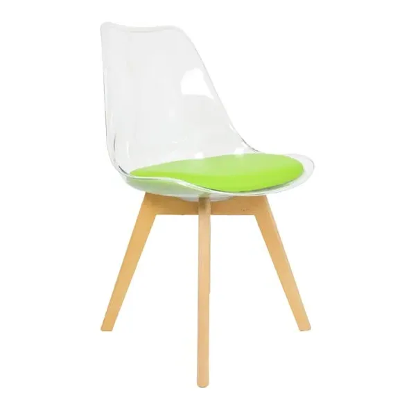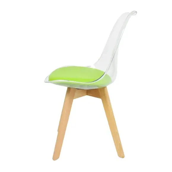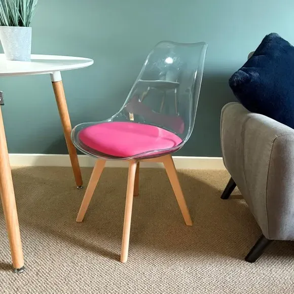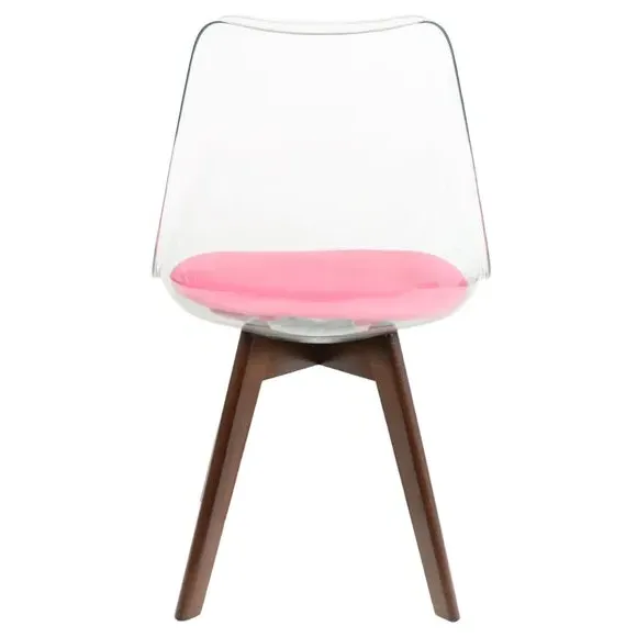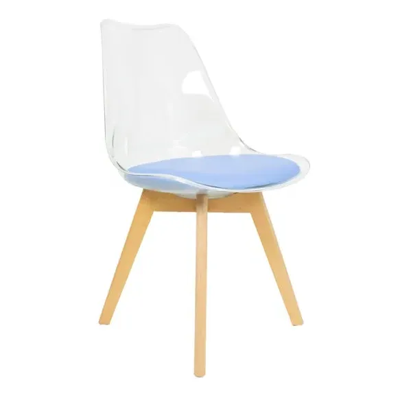 * Removable seat pad* Comfortable and durable* Easy to wipe clean with a damp cloth* Available in a variety of colours* Simple assembly with easy-to-follow instructions Part of a collection that effortlessly blends design and practicality, this chair features a transparent plastic curvaceous seat and a soft, easy-to-clean, colourful seat pad, making it both stylish and comfortable. The contoured, clear seat and four squared light wood legs not only look great but also provide exceptional sturdiness.