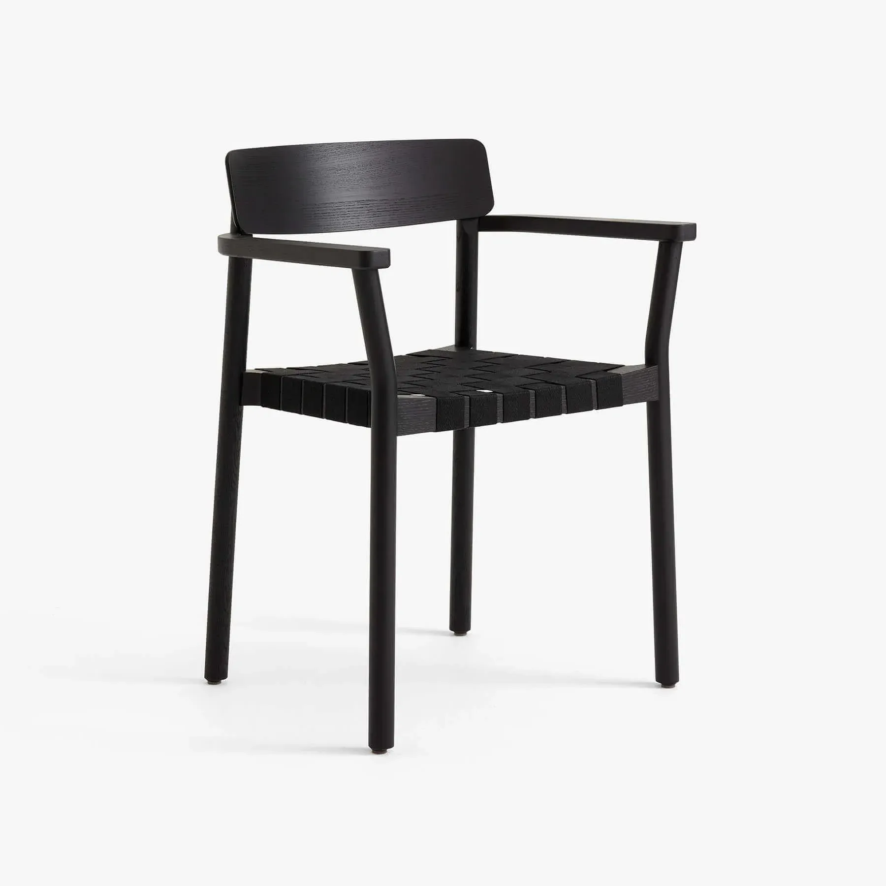 The Betty Chair features a monochromatic design with black lacquered wood frame and black linen webbing seat. Its exposed weave construction delivers breathable seating comfort, while the uniform color palette creates a sleek, cohesive appearance. The stackable functionality provides space-saving storage, and the solid construction offers reliable support for everyday use.