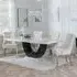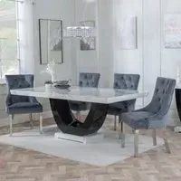 The Madrid dining set combines white marble surfaces with grey velvet knocker back chairs. Its marble construction provides durability and easy maintenance, while the velvet upholstery adds comfort and texture. The knocker back design offers ergonomic support, and the black wooden legs ensure stability. Dimensions: H130-160cm.