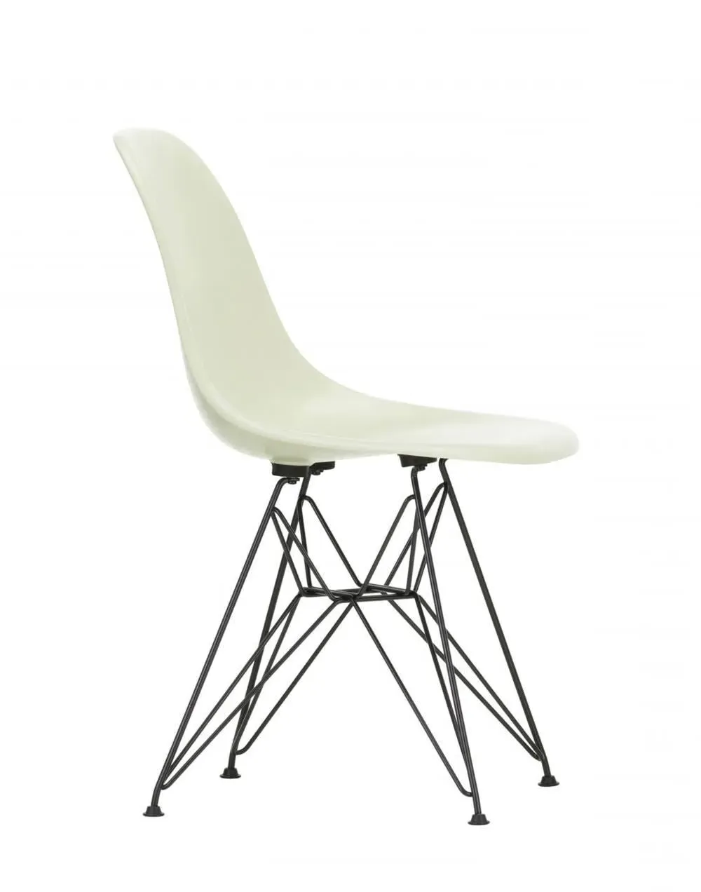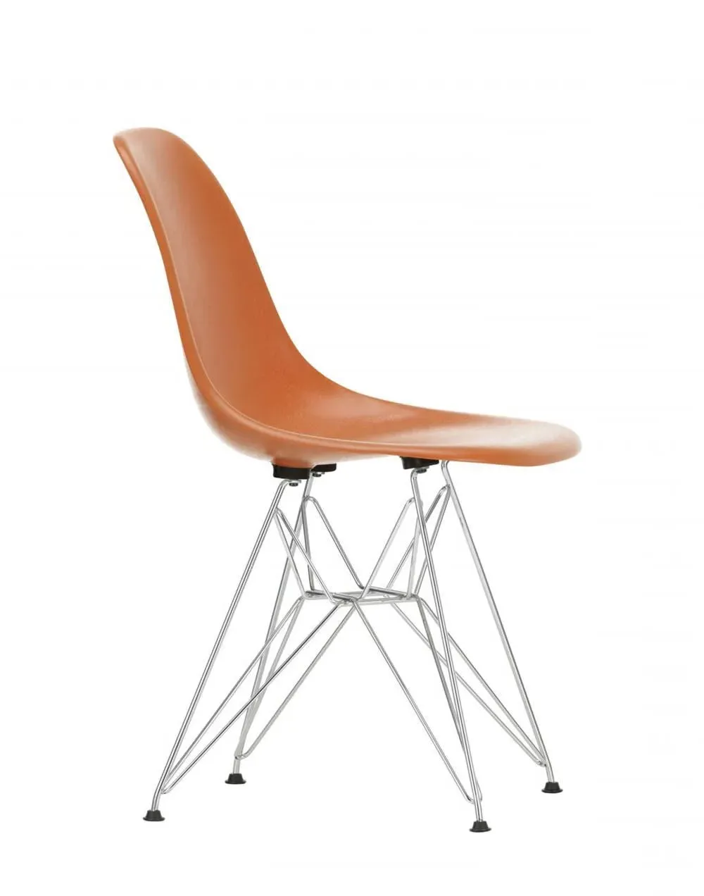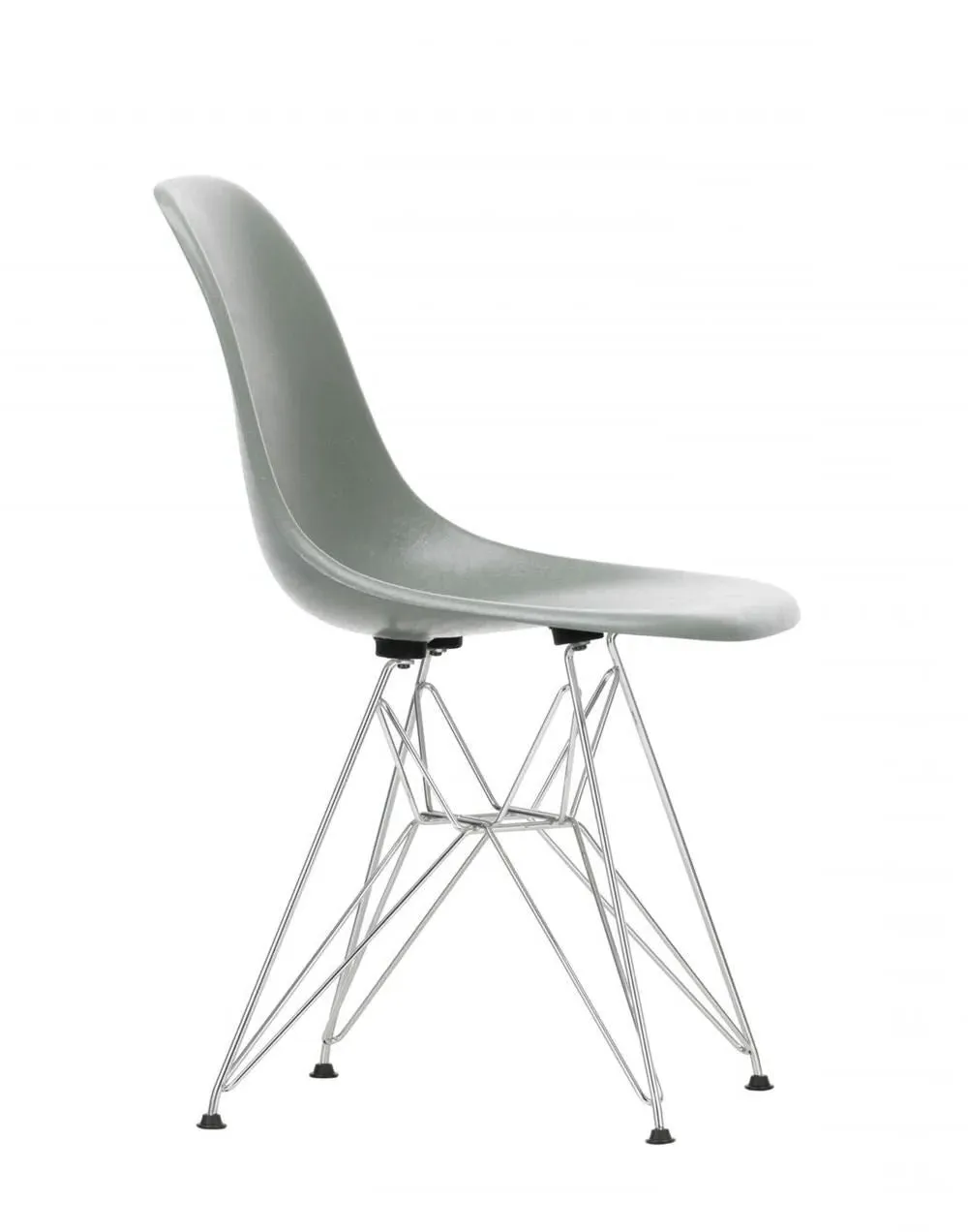 The DSR side chair combines structural strength with elegant form through its curvaceous fiberglass seat shell and robust steel base. Its organic design provides comfortable seating, while the chrome finish adds durability and visual appeal. The Eiffel Tower-style base ensures stability and complements the chair's light construction.