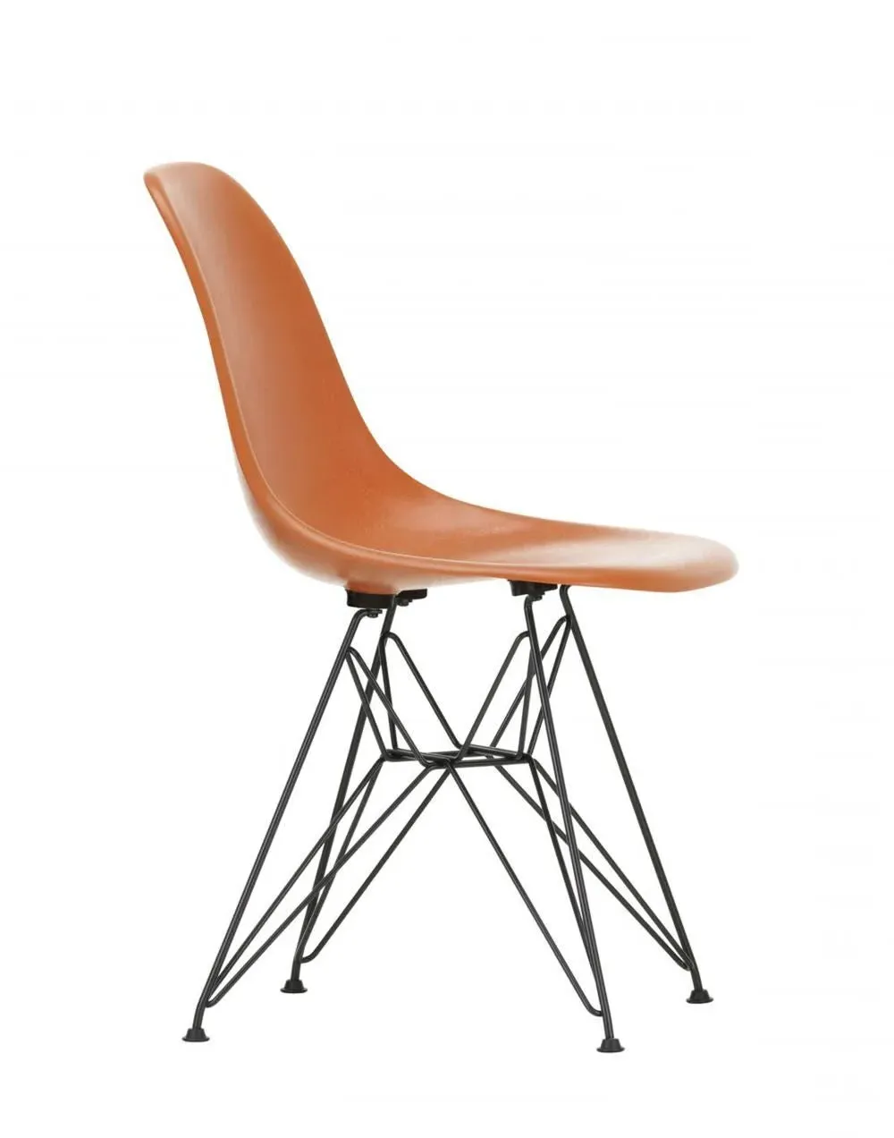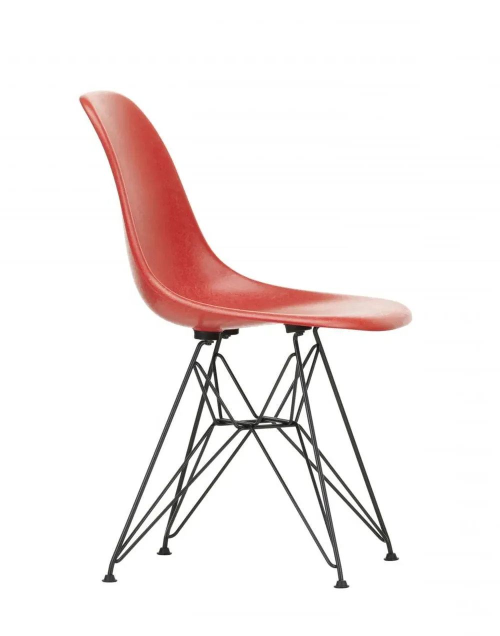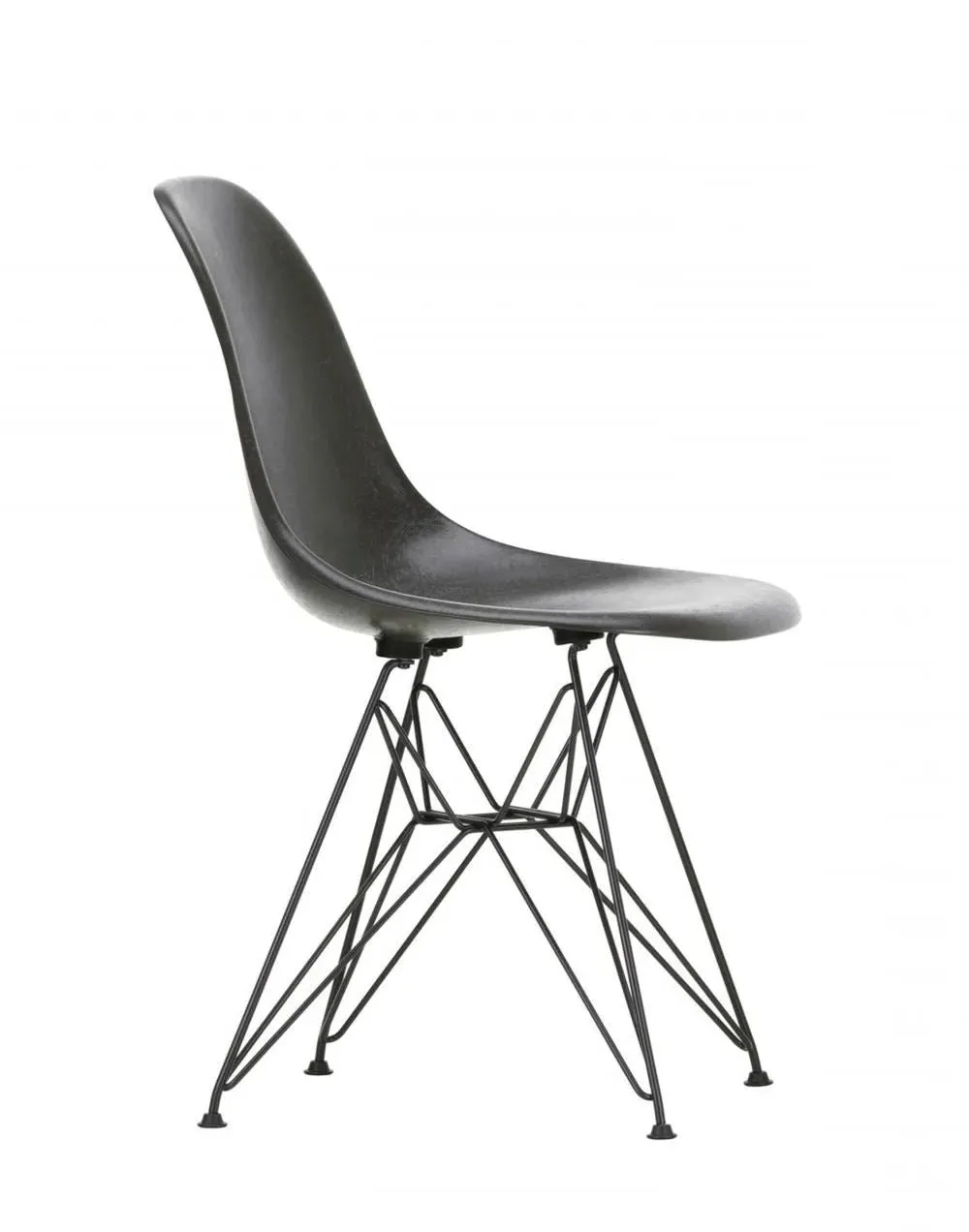 The DSR side chair combines structural strength with elegant form through its curvaceous fiberglass seat shell and robust steel base. Its organic design provides comfortable seating, while the chrome finish adds durability and visual appeal. The Eiffel Tower-style base ensures stability and complements the chair's light construction.