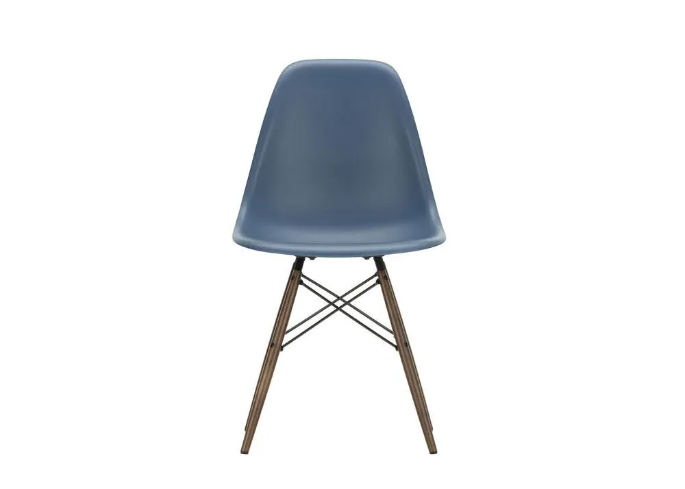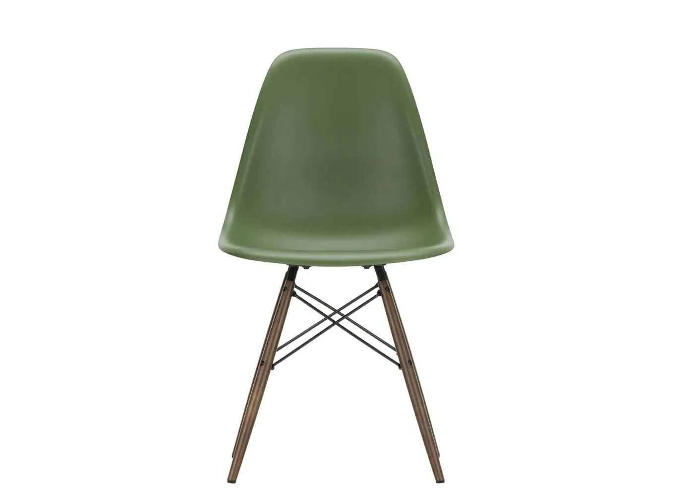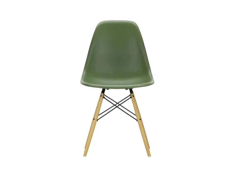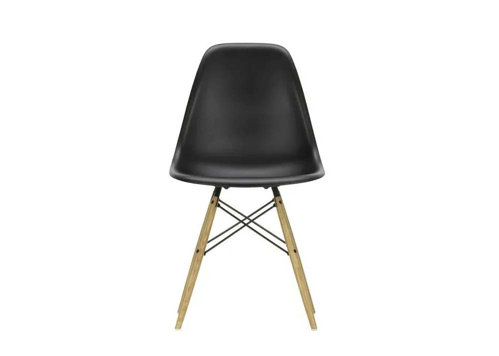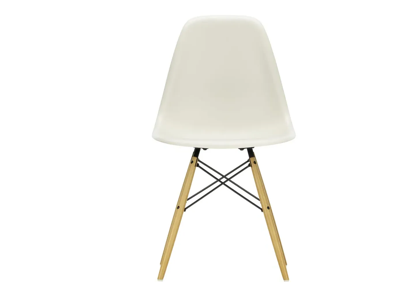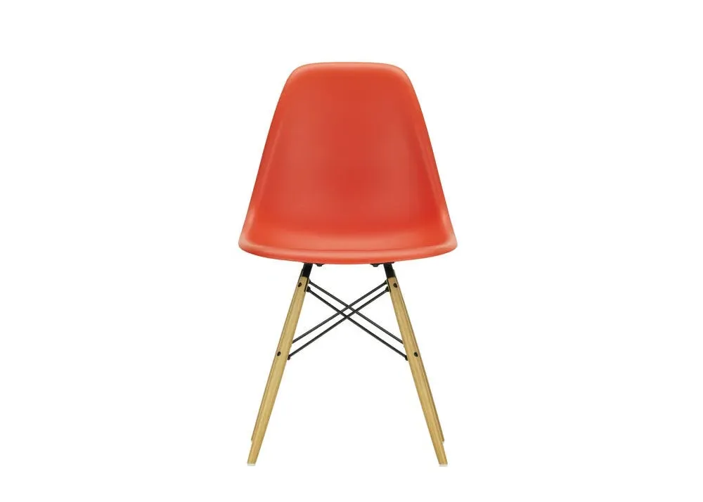 The organic seat, or “shell” as it's often referred to, has a curvaceous, organic form that allows for a comfortable sit while still providing firm posture support. On the base, spindly maple legs, available in a range of dark or light finishes, form to create diagonal arches attached via durable steel supports.A wonderfully crafted, and fully licensed edition by Vitra, this reproduction adheres strictly to the Eames original design, the only change being the replacement of fibreglass shell for a more environmentally friendly, not to mention hard-wearing, polypropylene seat.