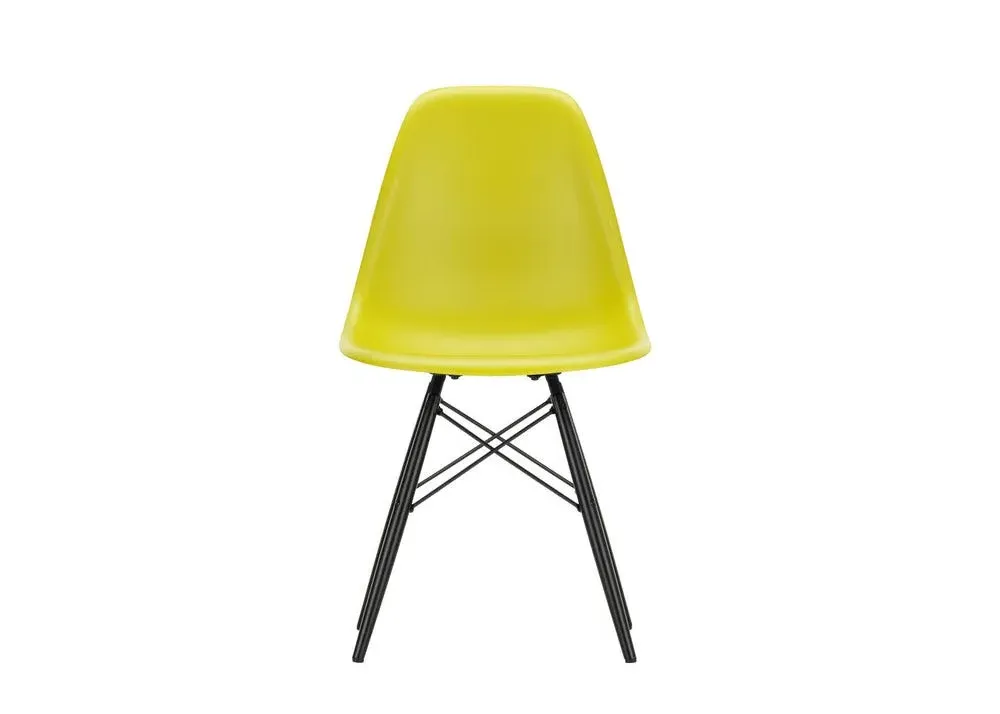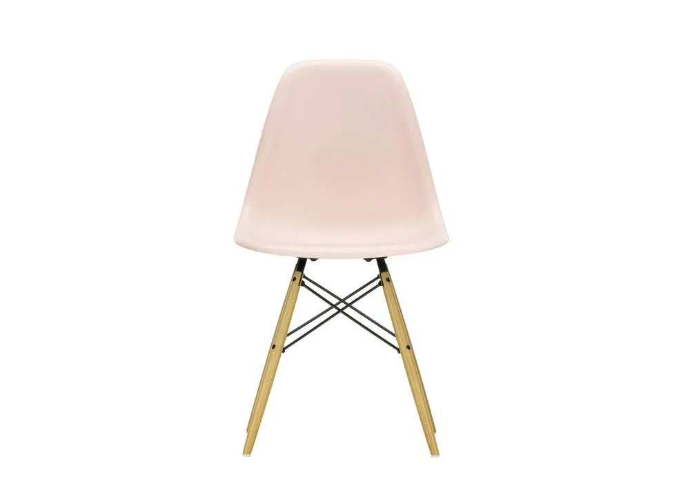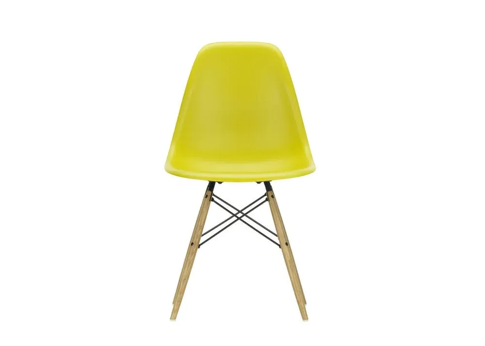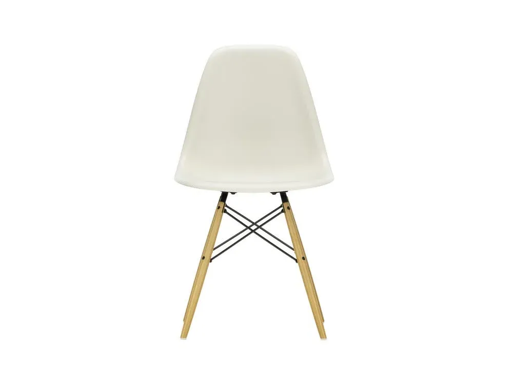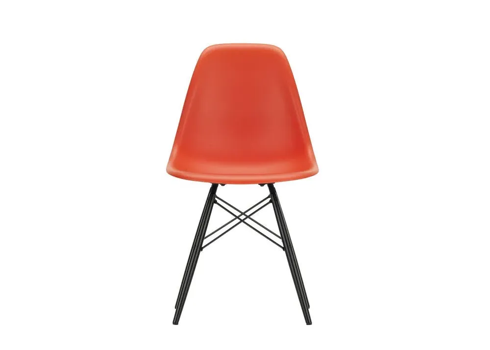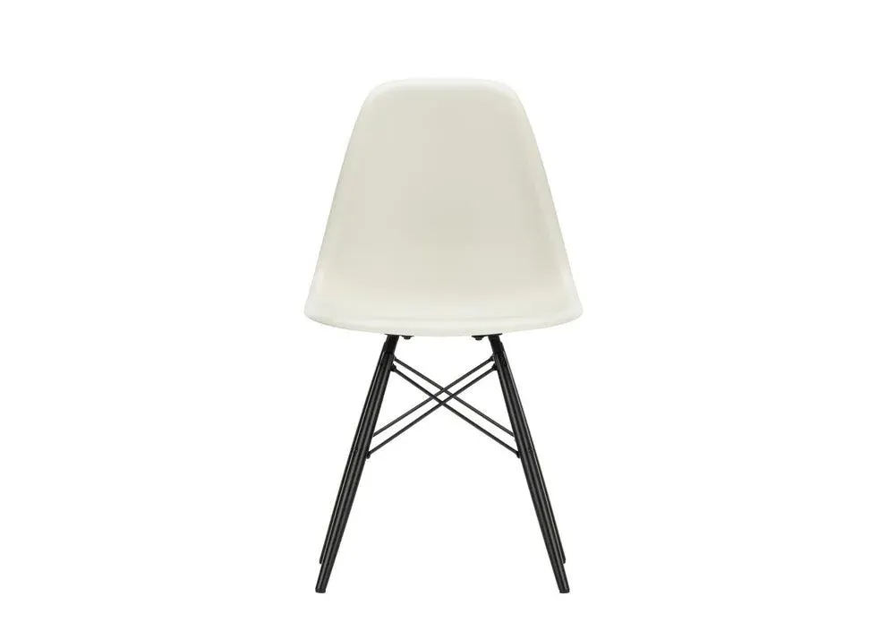 The DSW Side Chair features an organic shell design that provides comfortable seating while maintaining firm posture support. Its curvaceous polypropylene seat offers durability and environmental benefits, while the maple legs form diagonal arches connected through steel supports. The honey-toned ash base adds warmth to the design, and the glide feet ensure smooth movement across floors.