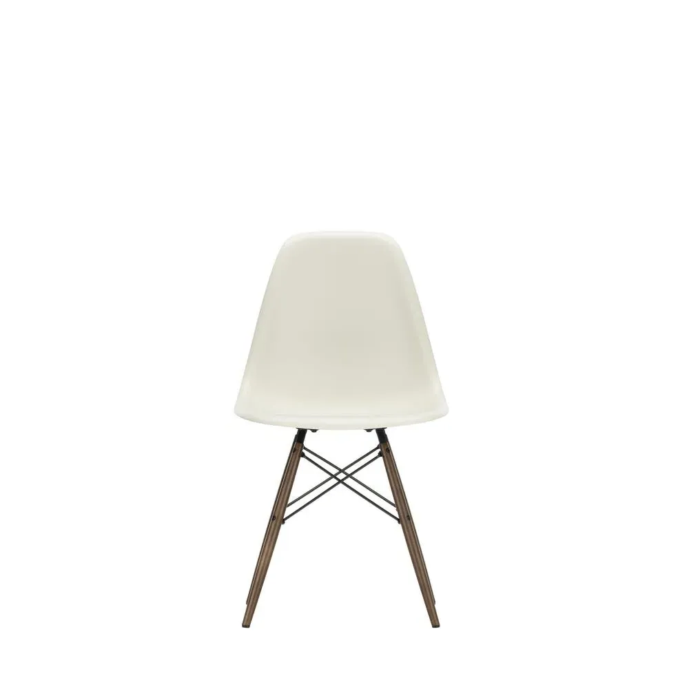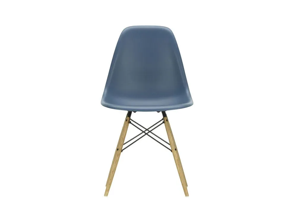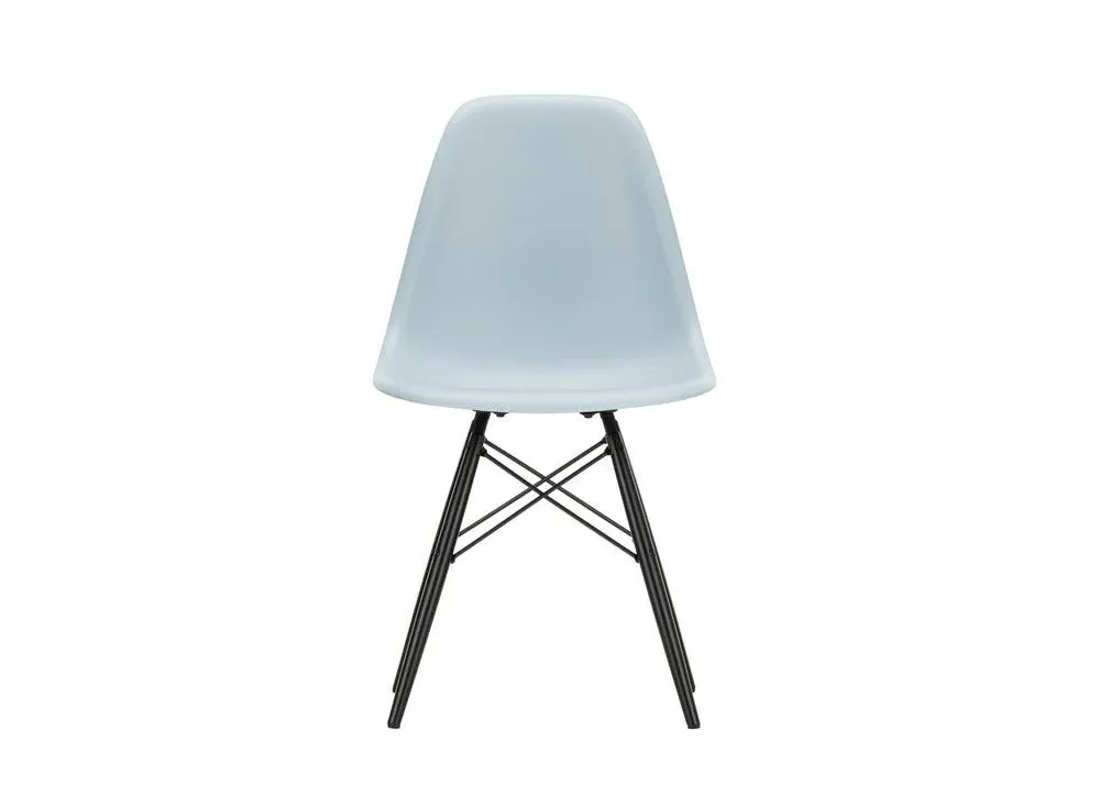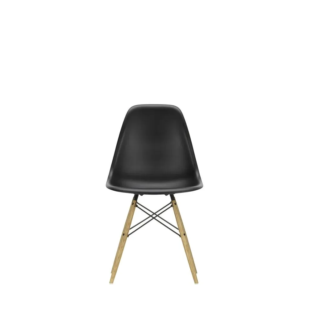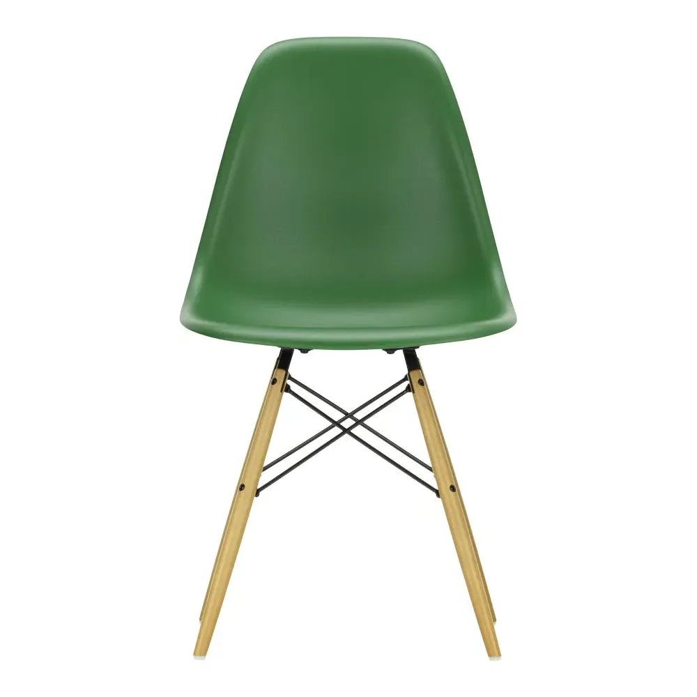 The DSW Side Chair features an organic shell design that provides comfortable seating while maintaining firm posture support. Its curvaceous polypropylene seat offers durability and environmental benefits, while the maple legs form diagonal arches connected through steel supports. The honey-toned ash base adds warmth to the design, and the glide feet ensure smooth movement across floors.