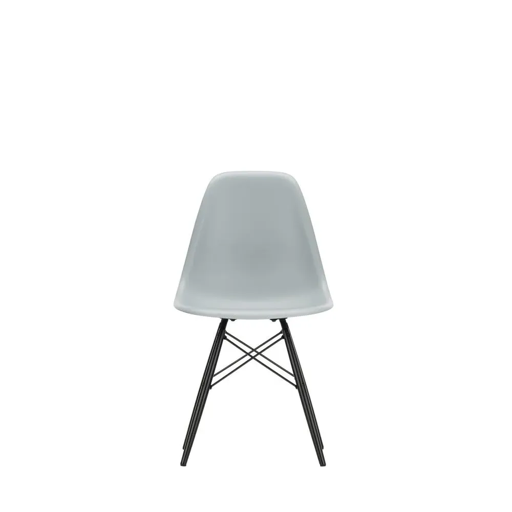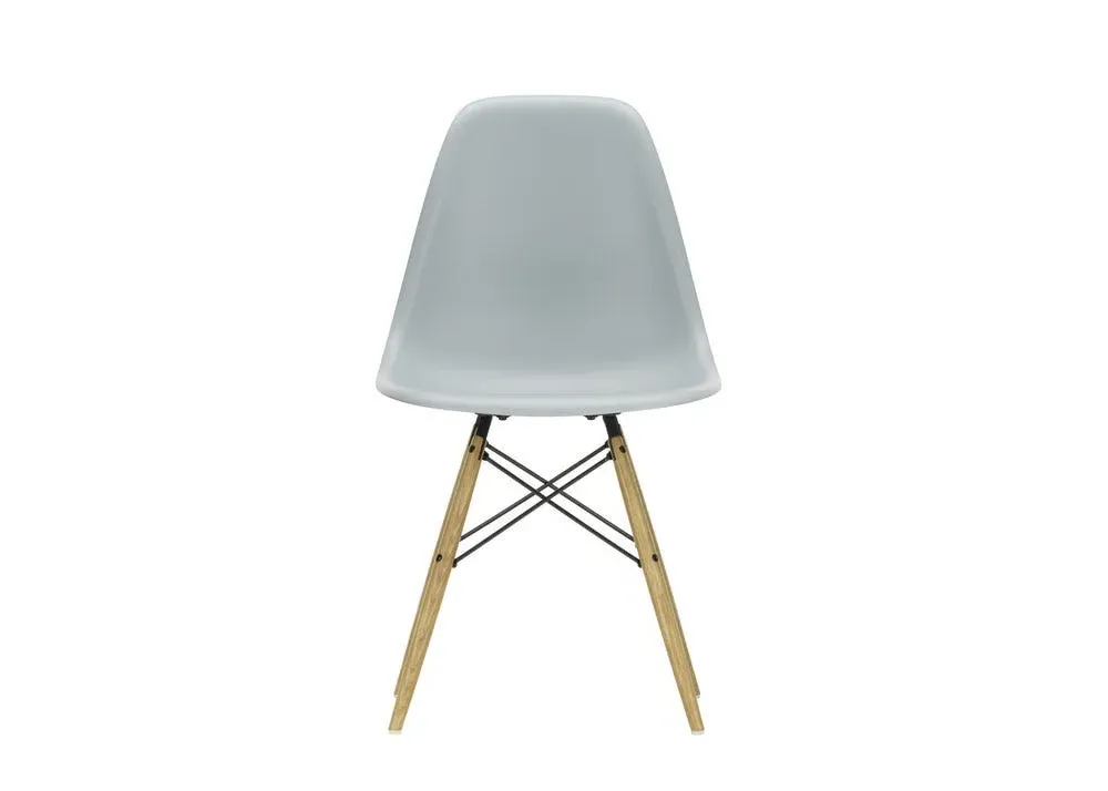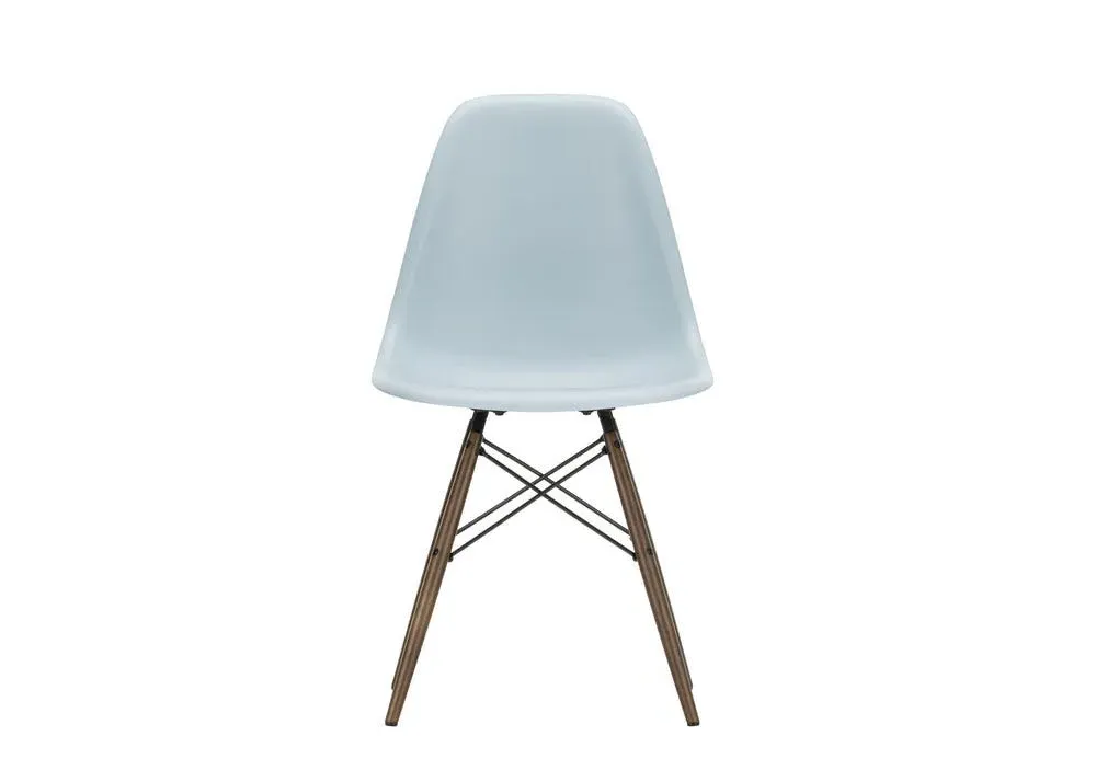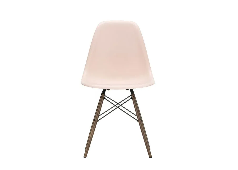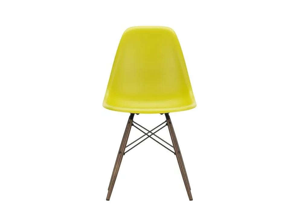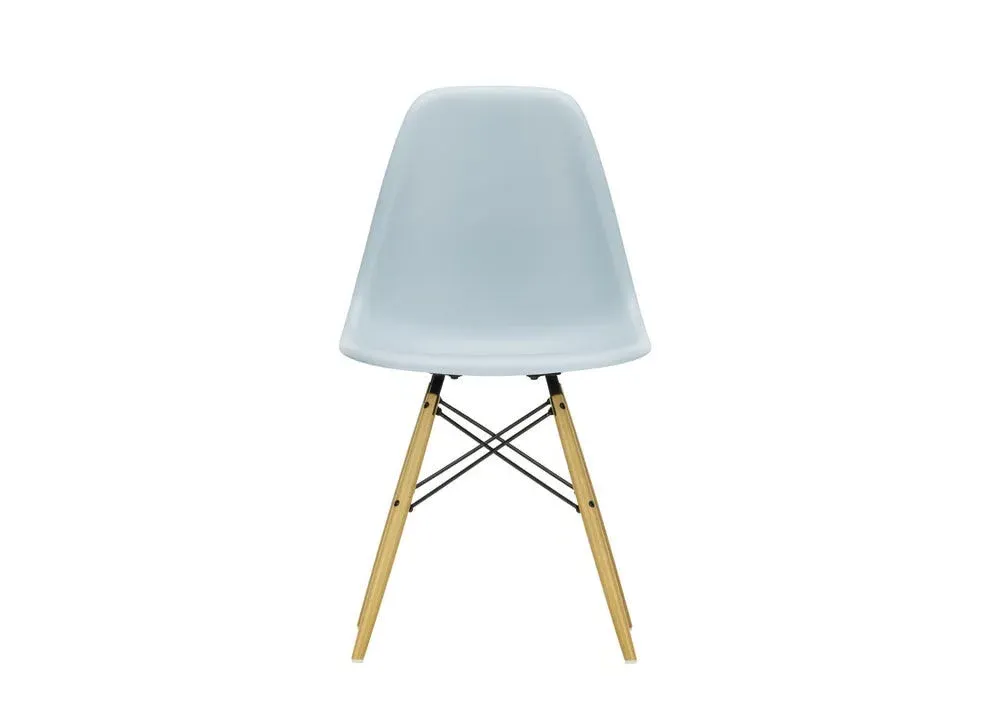 The DSW Side Chair features an organic shell design that provides comfortable seating while maintaining firm posture support. Its curvaceous polypropylene seat offers durability and environmental benefits, while the maple legs form diagonal arches connected through steel supports. The honey-toned ash base adds warmth to the design, and the glide feet ensure smooth movement across floors.