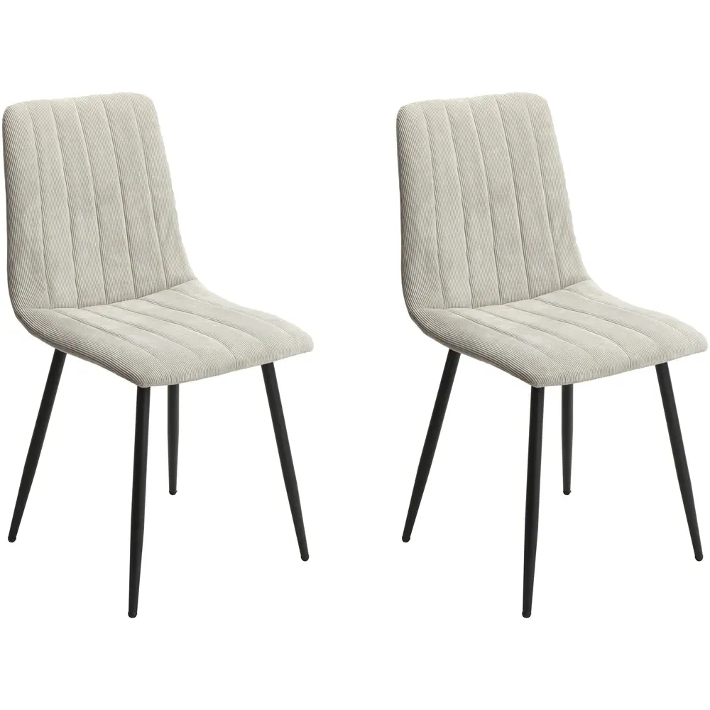 Indulge in dining perfection with the Core Products Aspen Set of 2 Grey and Black Straight Stitch Dining Chair. Designed with sleek black metal legs that lend a modern look, these chairs will fit seamlessly into any room's decor. The chairs not only depict elegant aesthetics but are also incredibly sturdy and supportive, making them the perfect choice for daily use. These chairs are incredibly versatile and able to complement a wide range of dining table styles. Each set comes with two chairs, each of which is beautifully upholstered in a soft fabric that features a straight stitch detail. The two-part steel underframe with tapered legs is sturdy and reliable, ensuring that these chairs will last for years to come. And for those who value comfort, these chairs are sure to deliver, thanks to their foam-filled seat and back areas that provide extra cushioning. With these chairs, you can enjoy both comfort and quality, all in one stylish package. Fixings are included with the chairs.