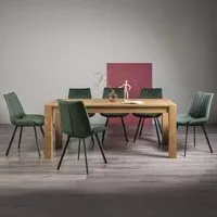 The Turin dining set offers versatility with its extending design, constructed from American White Oak and American Knotty Oak Veneer. Its light oak finish creates warmth, while the petrol blue velvet upholstery on the Cezanne chairs provides luxurious seating. The black chair legs complement the overall design, and the extending mechanism suits both casual and formal dining. Table extends from W165 x D90 x H75 cm to W225 x D90 x H75 cm, with chairs measuring W50 x D46 x H84 cm.