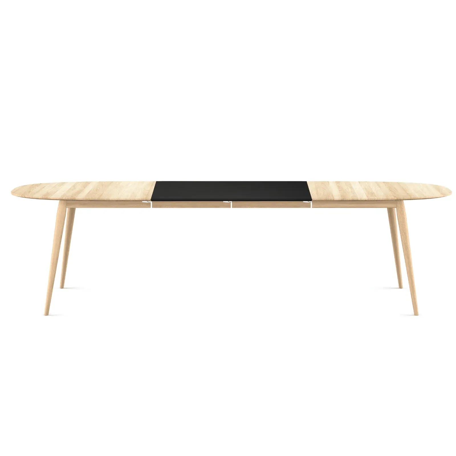 The extendable dining table combines mathematical precision with handcrafted quality, featuring an ellipse-shaped curve that blends rectangular and round forms. Its solid FSC-certified white oiled oak construction provides durability and natural warmth, while the extendable design adjusts from 180 cm to 280 cm to accommodate up to 12 people. The precise joints connecting additional plates remain almost invisible, creating a seamless extension mechanism.