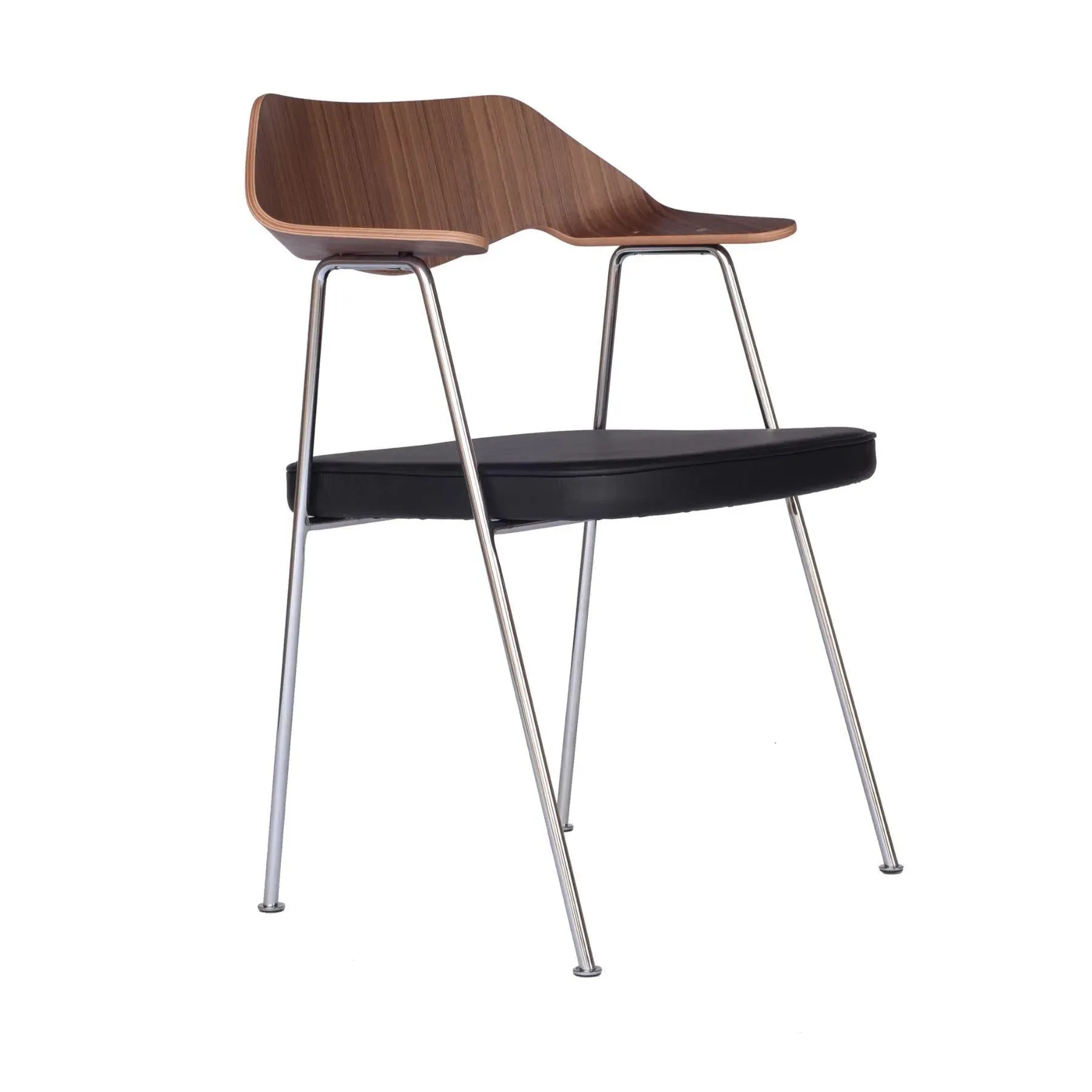 The dining chair features curved moulded plywood back and armrests with premium leather upholstery. Its sculptural plywood construction provides structural support, while the nero leather seat delivers luxurious comfort. The tubular frame adds stability, and the walnut accents complement the sleek design.