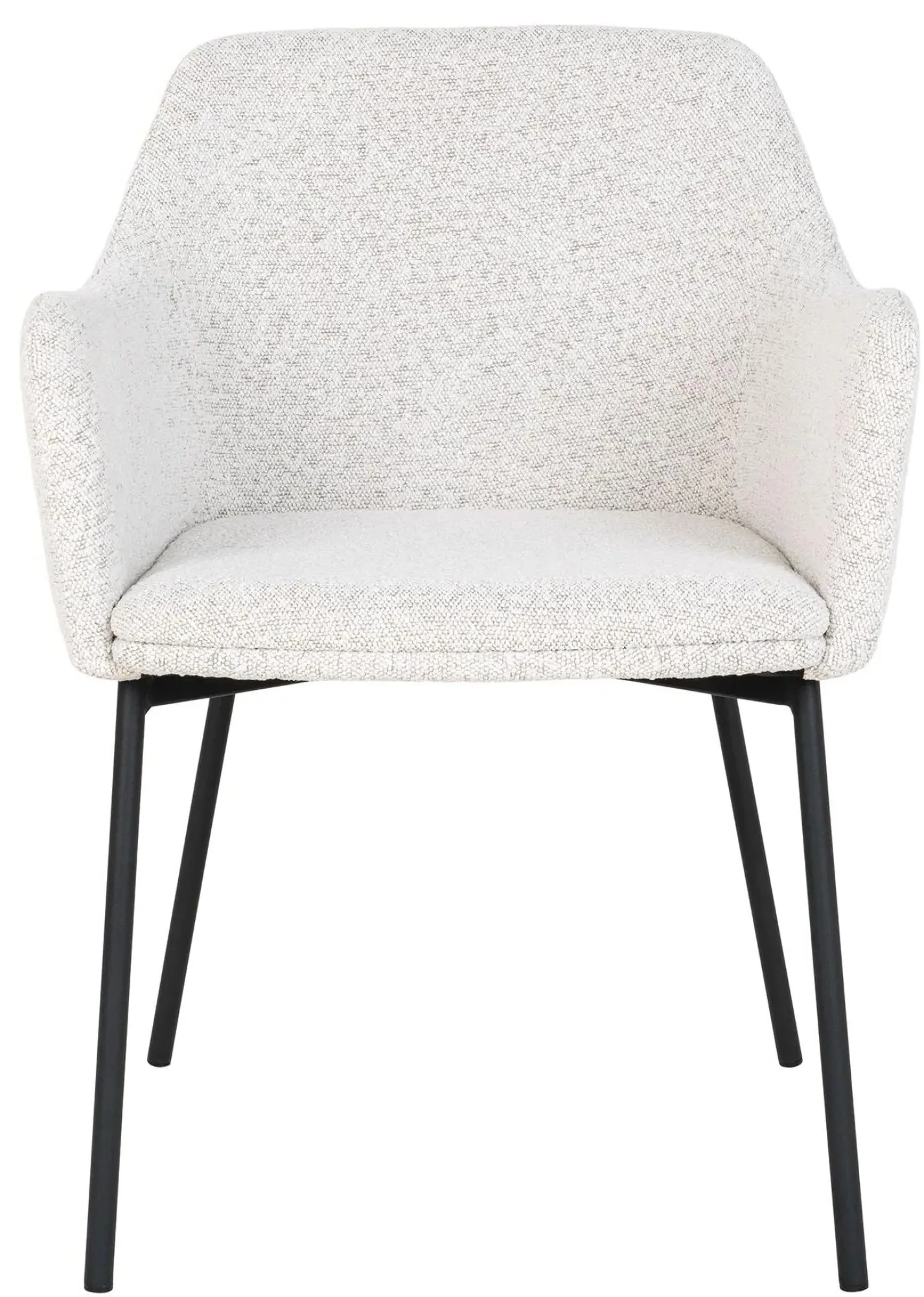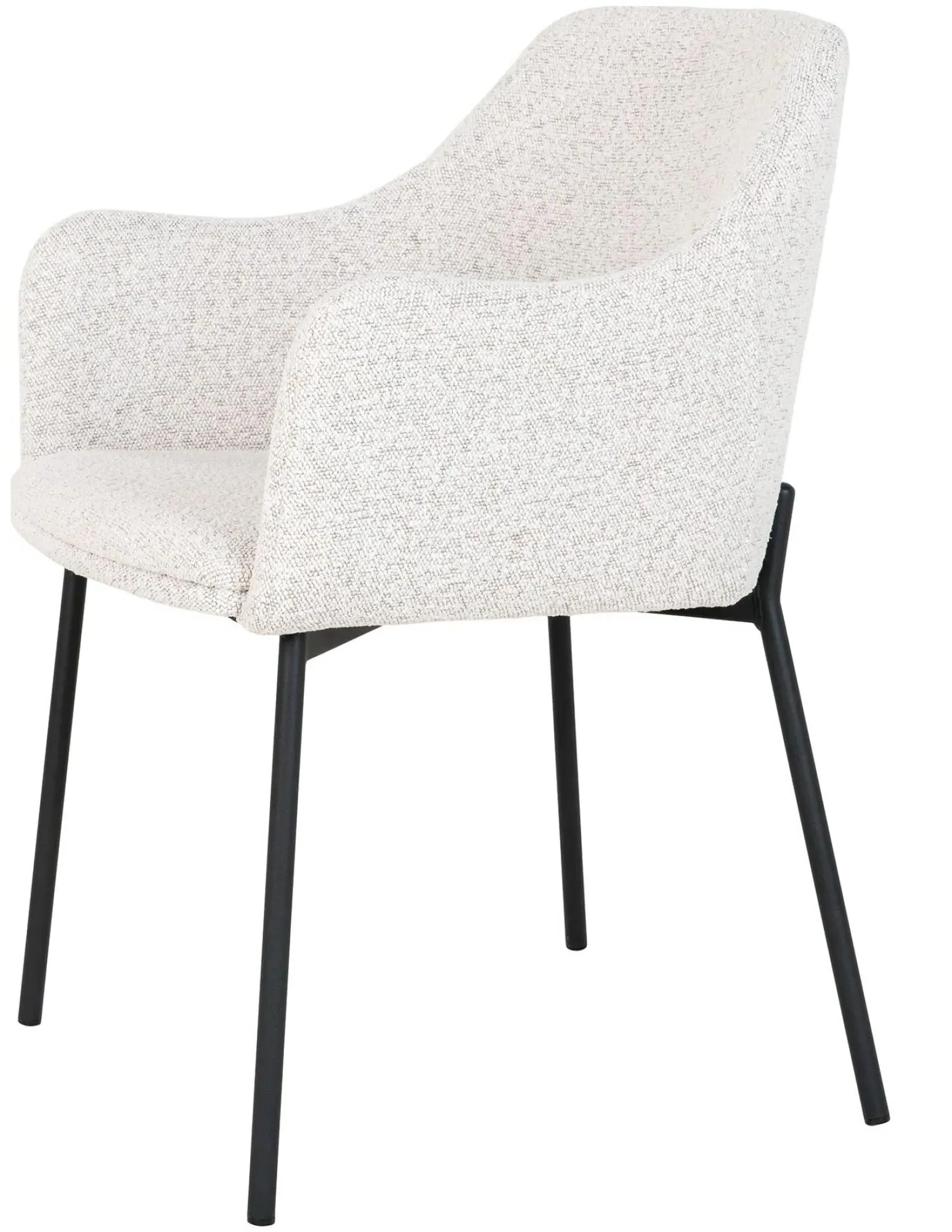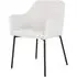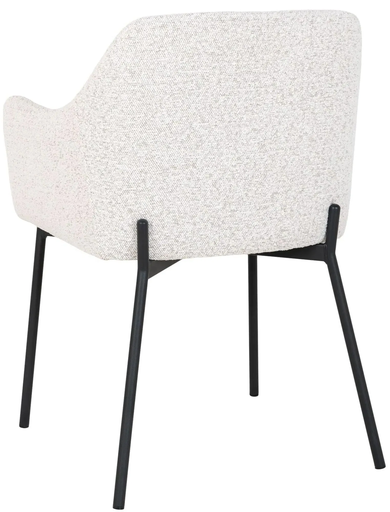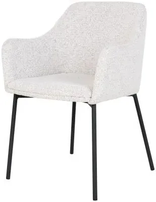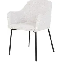 The Halden dining chair combines comfort with its soft boucle fabric upholstery, supported by sleek black legs. The textured boucle material provides a tactile surface that adds visual interest, while the sturdy frame ensures reliable daily use. Its neutral beige tone complements various dining room styles, and the black leg finish creates an appealing contrast.