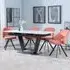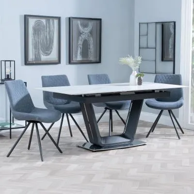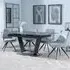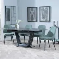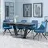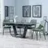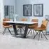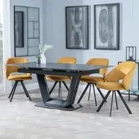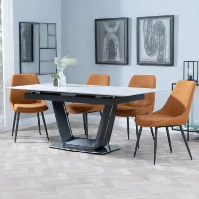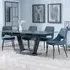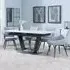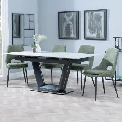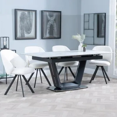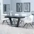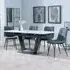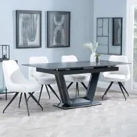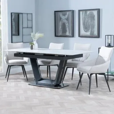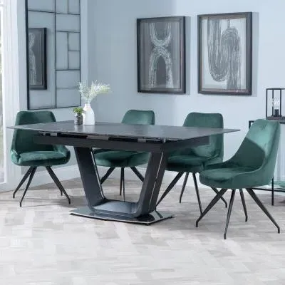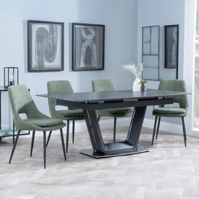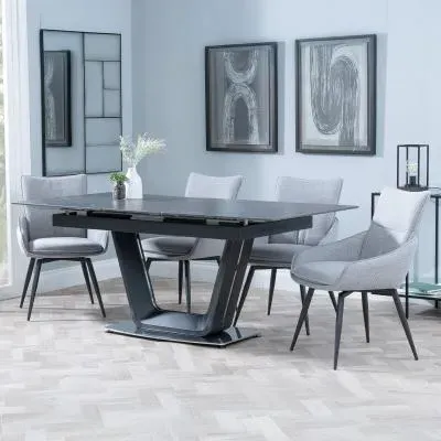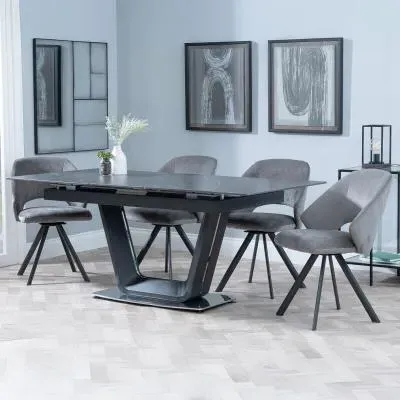 The Alpha dining set combines functionality with its extendable black ceramic table and Corona fabric chairs. The black ceramic surface provides durability and easy maintenance, while the light grey fabric upholstery adds comfort for extended dining. Its extending mechanism accommodates varying group sizes, and the sturdy construction ensures long-lasting use.