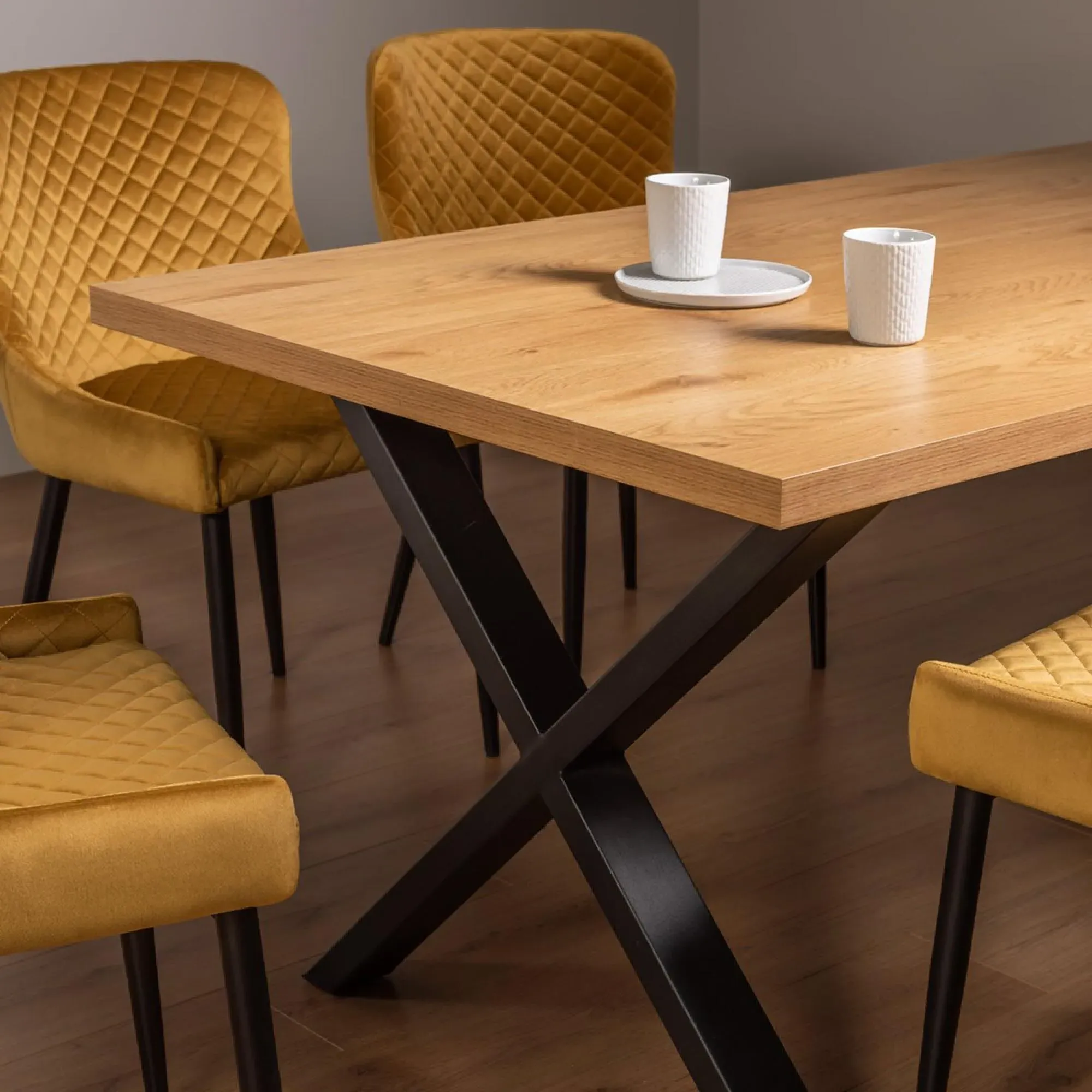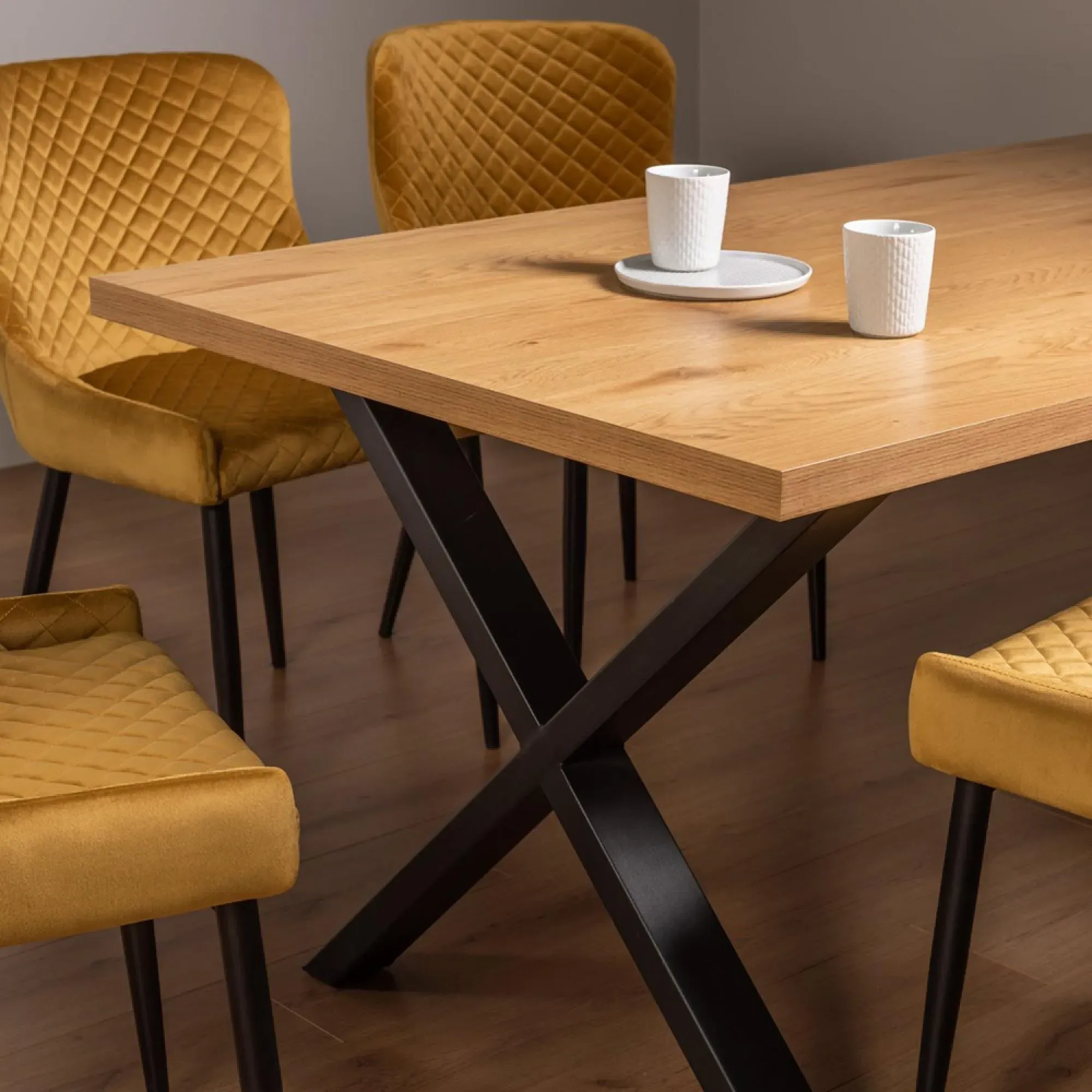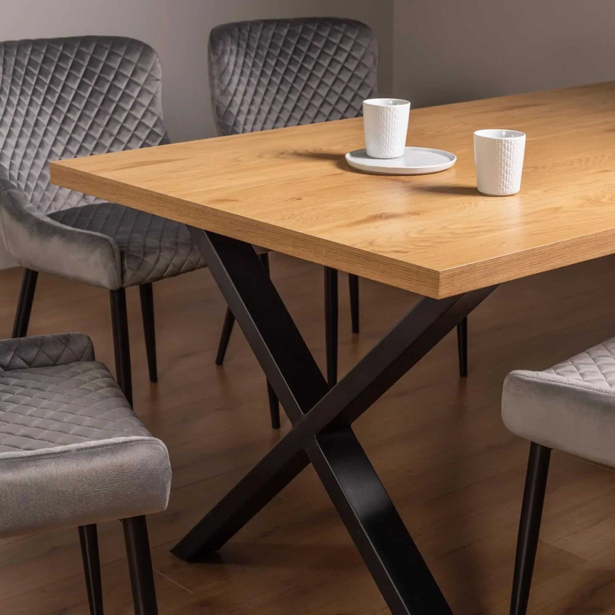The Ramsay dining table offers robust construction with its oak melamine finish, supported by distinctive black X-shaped legs. Its 6-seater capacity provides ample space for family gatherings, while the melamine surface ensures easy maintenance and durability. The contrasting black leg design adds visual interest to the oak-effect tabletop.