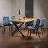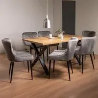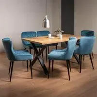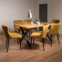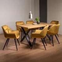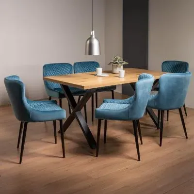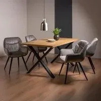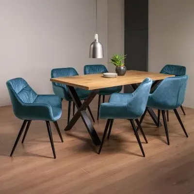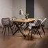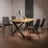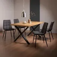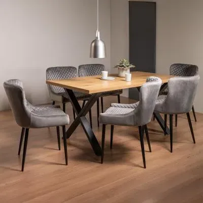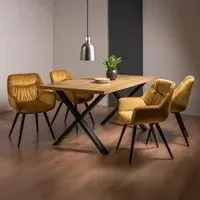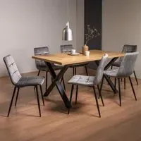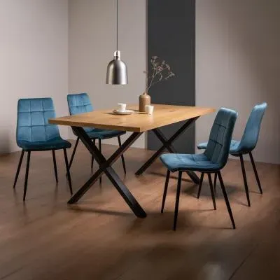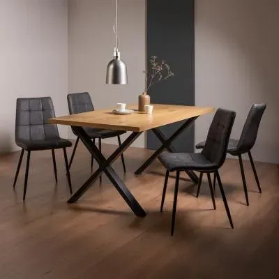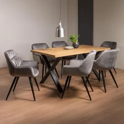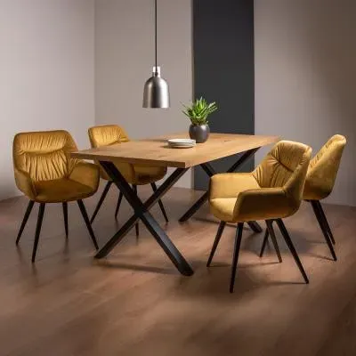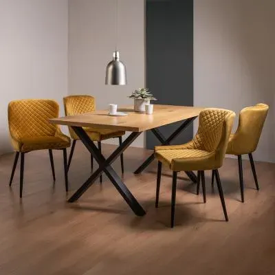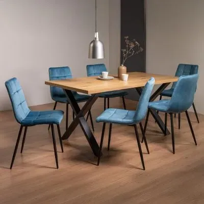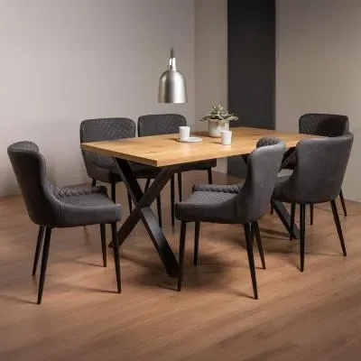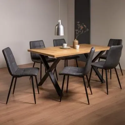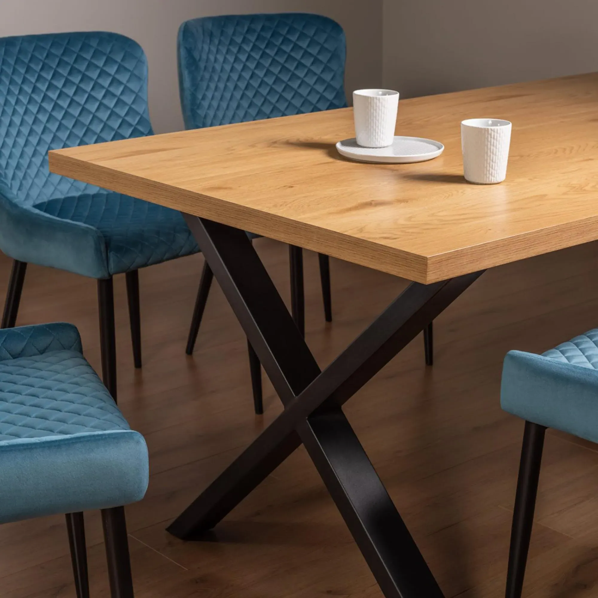 The Ramsay dining table offers robust construction with its oak melamine finish, supported by distinctive black X-shaped legs. Its 6-seater capacity provides ample space for family gatherings, while the melamine surface ensures easy maintenance and durability. The contrasting black leg design adds visual interest to the oak-effect tabletop.