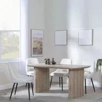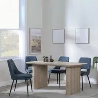 The Bern Fluted Dining Set provides contemporary appeal with its sleek MDF rectangular black table featuring fluted design elements. The spacious table surface accommodates gatherings with ease, while the Peyton Blue fabric chairs offer comfort with sturdy frames and plush padding. The rich blue upholstery creates sophisticated contrast against the black table finish. W160 x D90 x H76 cm table, chairs W49 x D61 x H88 cm.