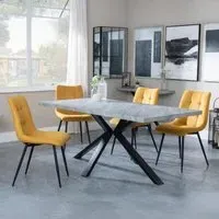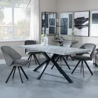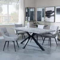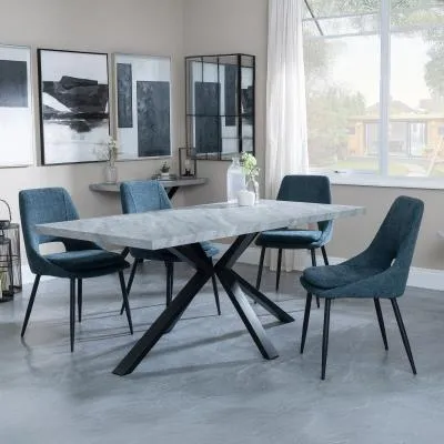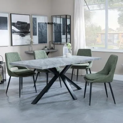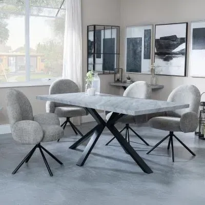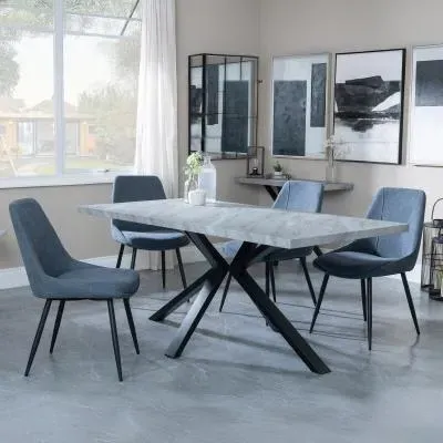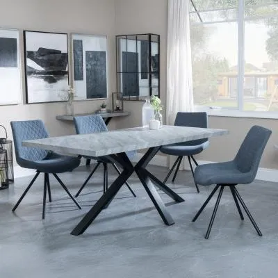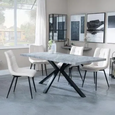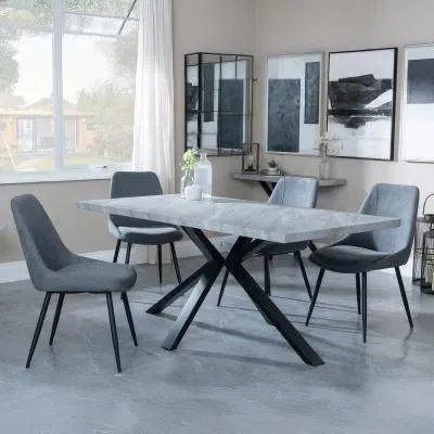 Ezra Grey Dining Set with Spider Legs - Corona Light Grey Fabric Dining Chair: Transform your dining space with this stunning Urban Deco Ezra Grey dining set, combining modern aesthetics with practical functionality. This sophisticated ensemble features a rectangular MDF dining table with a striking grey top and sleek black spider legs, measuring W 180cm x D 90cm x H 75cm. The table is perfectly complemented by Corona light grey fabric dining chairs, each measuring W 44cm x D 61cm x H 88cm, offering both style and comfort. The Urban Deco Ezra Grey range seamlessly blends industrial chic with contemporary design, making it an ideal choice for those seeking to create a statement in their home. The durable MDF construction ensures longevity, while the finish adds a touch of urban sophistication. The black spider legs provide stability and a visually striking contrast to the table's grey top. The Corona chairs, upholstered in soft light grey fabric, offer a comfortable seating experience and effortlessly complement the table's aesthetic. Whether you're hosting dinner parties or enjoying family meals, this dining set will undoubtedly become the focal point of your dining area, combining form and function in a visually appealing package. Upgrade your dining experience with this Urban Deco Ezra Grey Dining Set, a perfect blend of style, durability, and comfort. However you may find different names used in each store for Ezra Grey Dining Set with Spider Legs - Corona Light Grey Fabric Dining Chair & can be found under the name as Sawyer Grey Dining Set with Spider Legs - Corona Light Grey Fabric Dining Chair. Best furniture shop in Leicester,Leicestershire,East Midlands Selling. Deals. Black Friday Furniture Sale, Black Friday Dining Sets Sale Best furniture shop in Leicester,Leicestershire,East Midlands Selling. Deals. Black Friday Furniture Sale, Black Friday Dining Set for 6 Sale Best furniture shop in Leicester,Leicestershire,East Midlands Selling. Deals. Black Friday Furniture Sale,Black Friday Sale Best furniture shop in Leicester,Leicestershire,East Midlands Selling. Deals. Black Friday Furniture Sale,Black Friday Dining Sets Sale Best furniture shop in Leicester,Leicestershire,East Midlands Selling. Deals. Black Friday Furniture Sale,Black Friday Dining Sets Sale Best furniture shop in Leicester,Leicestershire,East Midlands Selling. Deals. Black Friday Furniture Sale,Black Friday Dining Sets Sale Best furniture shop in Leicester,Leicestershire,East Midlands Selling. Deals. Black Friday Furniture Sale,Black Friday Dining Sets Sale