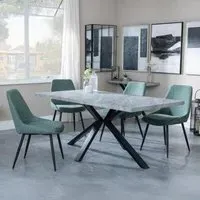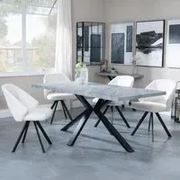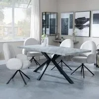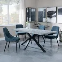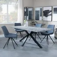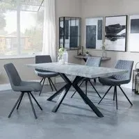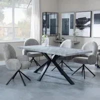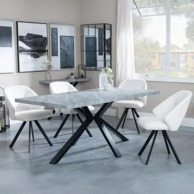The Ezra dining set offers industrial chic design with its rectangular MDF table featuring a grey top and sleek black spider legs. Paired with Corona light grey fabric dining chairs, the set provides both style and comfort for family meals and entertaining. The MDF construction ensures durability, while the contrasting black legs create visual appeal against the grey surface. Table: W180 x D90 x H75 cm, Chairs: W44 x D61 x H88 cm.