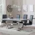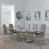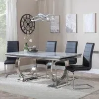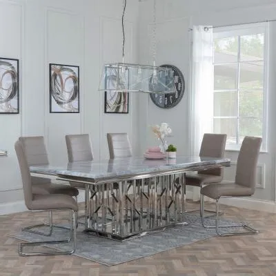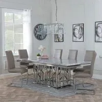 The Louis dining set combines grey marble surfaces with chrome detailing for a sophisticated look. Its Roma chairs feature beige faux leather upholstery that provides comfortable seating, while the chrome frame adds structural support. The marble table surface offers durability and easy maintenance, complemented by the sleek chrome base that ensures stability.