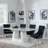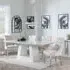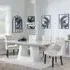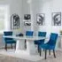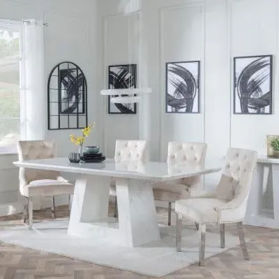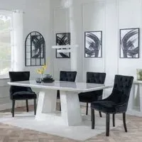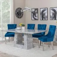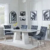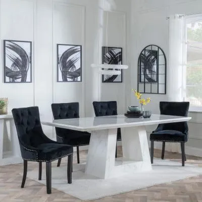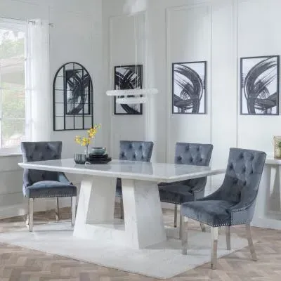 The Milan Dining Set offers grey marble surfaces with matching grey velvet knocker back chairs for coordinated dining comfort. Its black wooden legs ensure reliable stability, while the velvet fabric provides plush seating. The marble construction delivers durability and simple maintenance, and the knocker back design enhances the overall dining experience.
