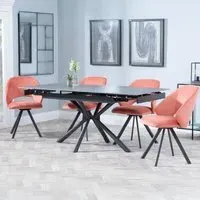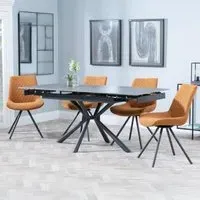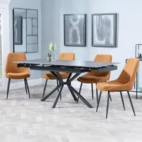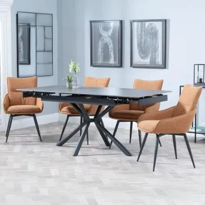 The Ripon dining set combines functionality with its extendable ceramic table, paired with Corona fabric dining chairs. The black ceramic surface provides durability and easy maintenance, while the brown fabric upholstery adds comfort and rich warmth. The extending mechanism accommodates varying guest numbers, and the sturdy construction ensures long-lasting use.