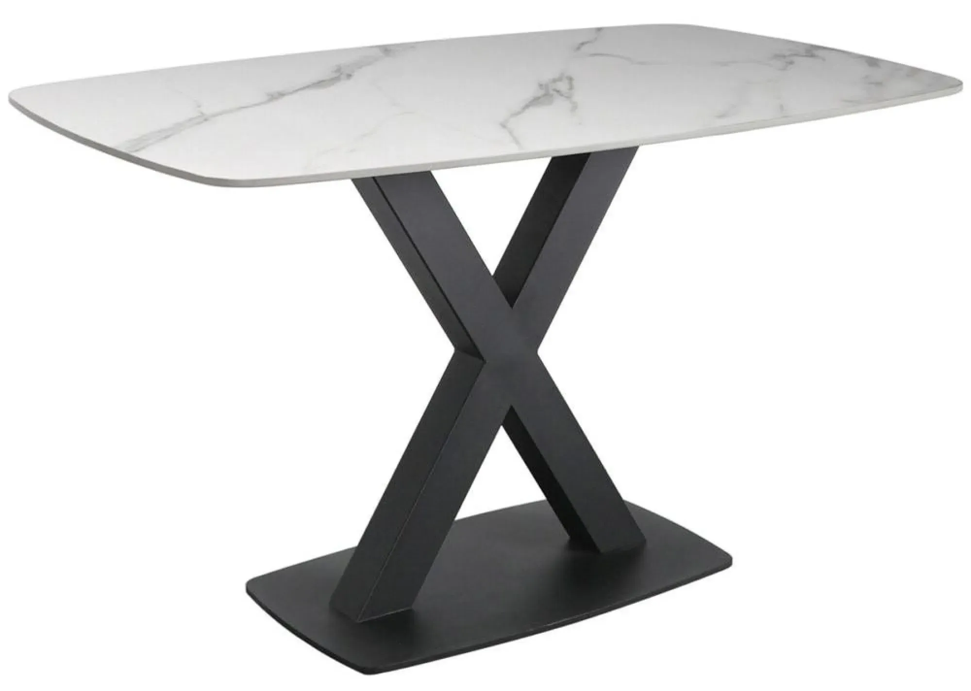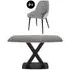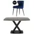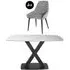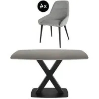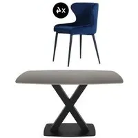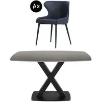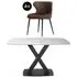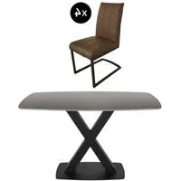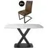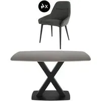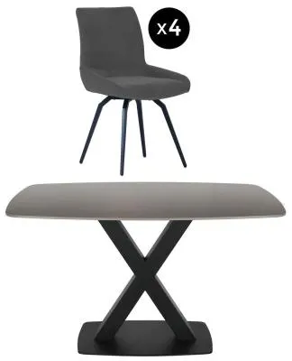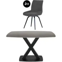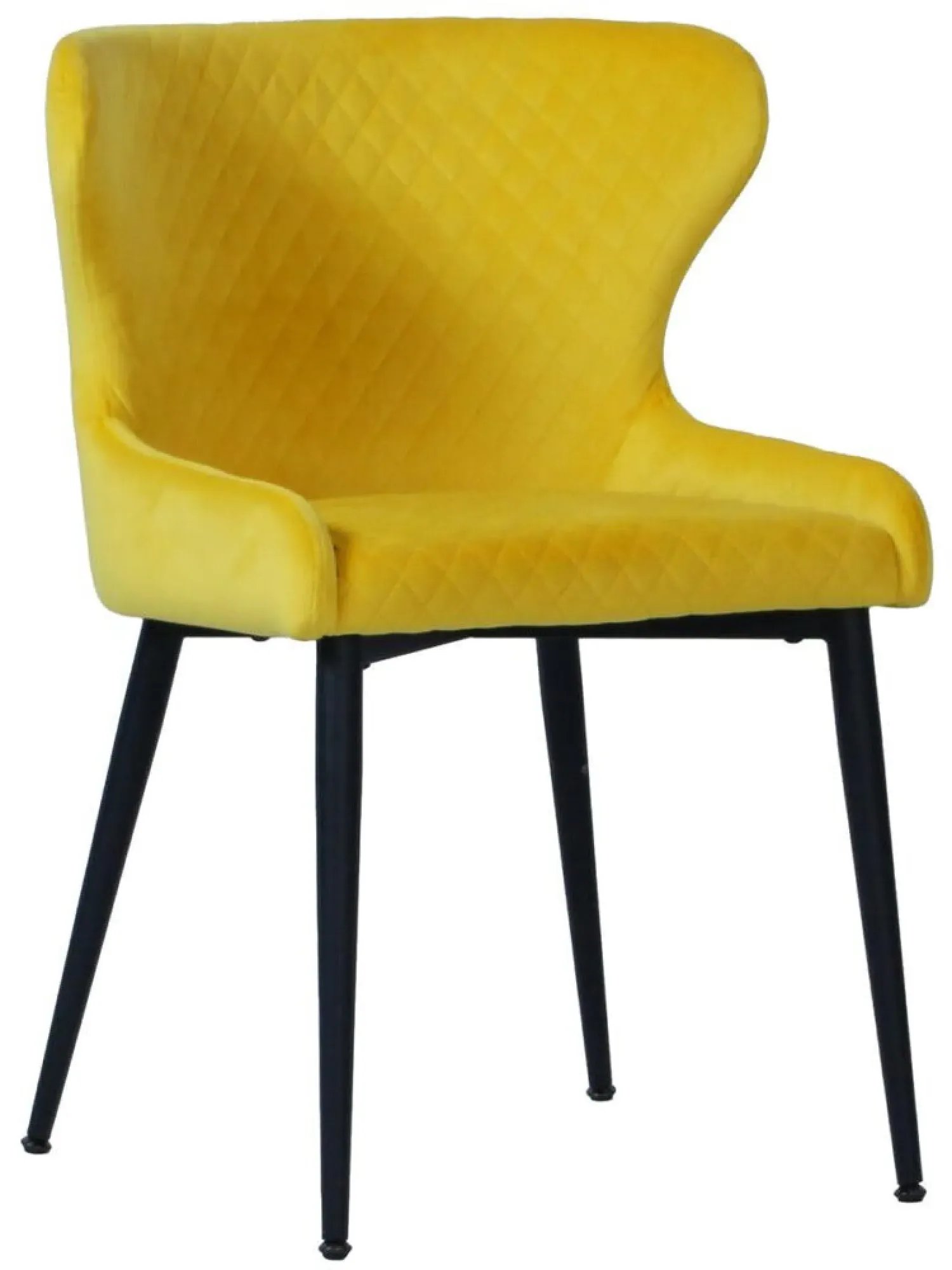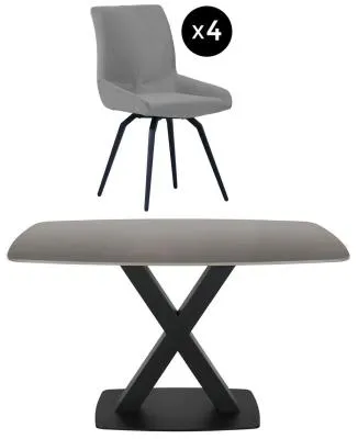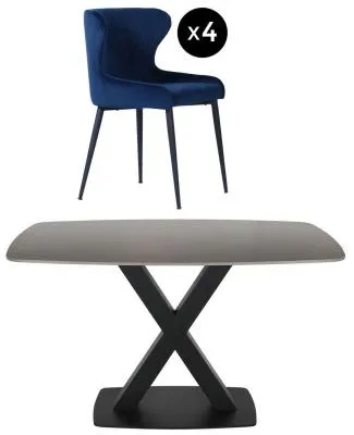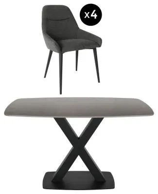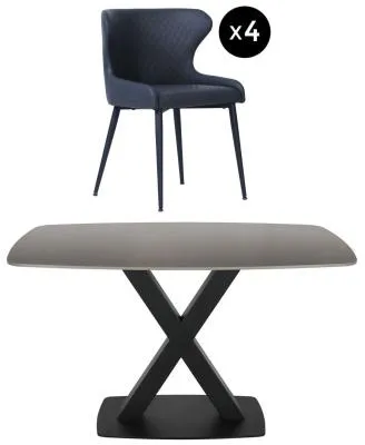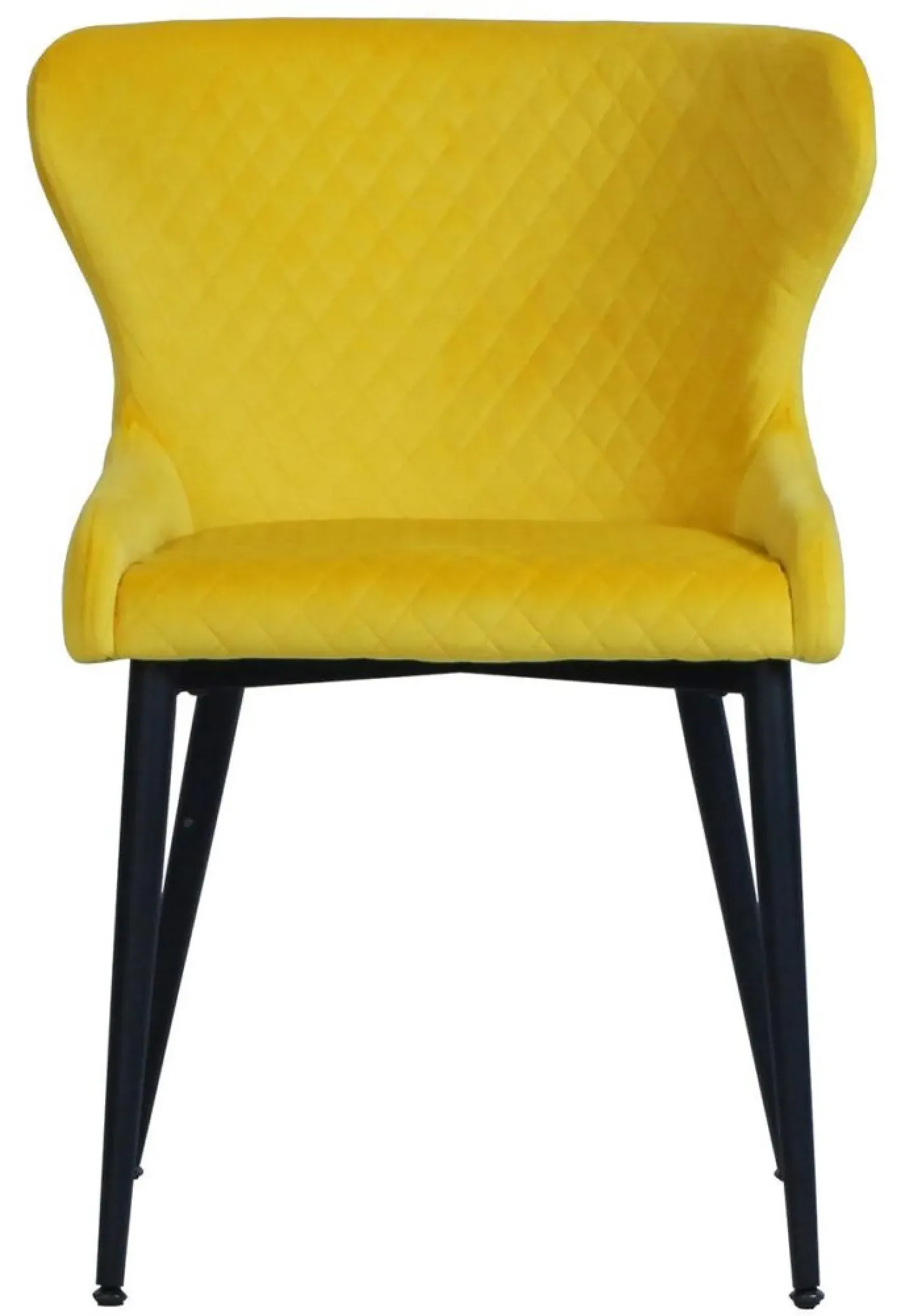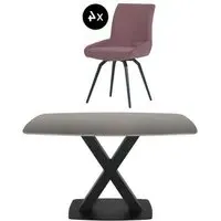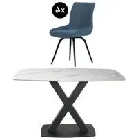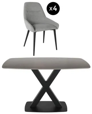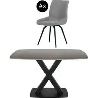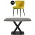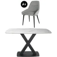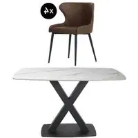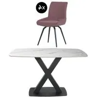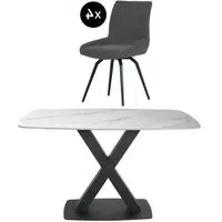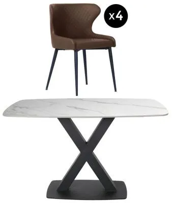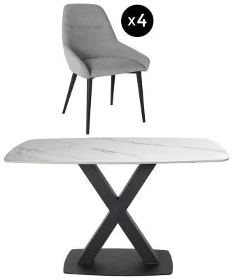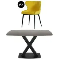 The Vernal dining set combines a white sintered stone table with four Langley chairs in yellow fabric upholstery. The sintered stone surface provides durability and easy maintenance, while the fabric upholstery offers comfort for extended seating. The coordinated design creates a cohesive dining arrangement with contrasting color elements.