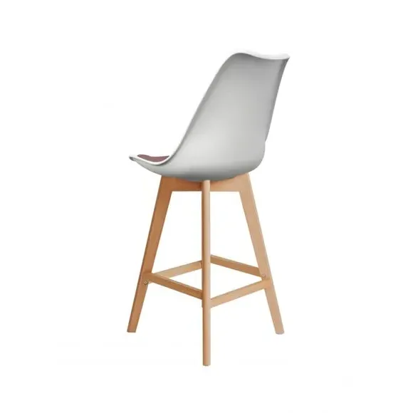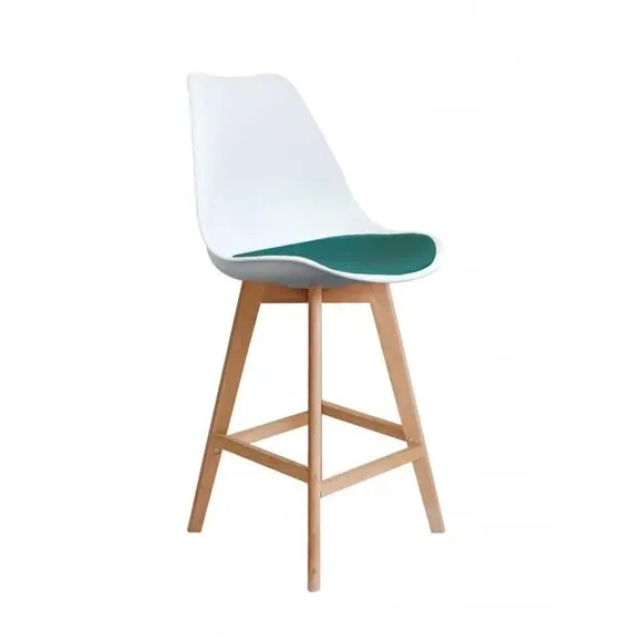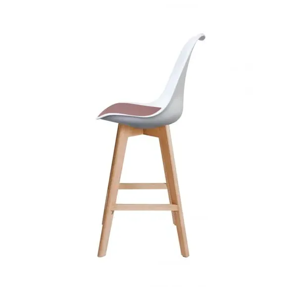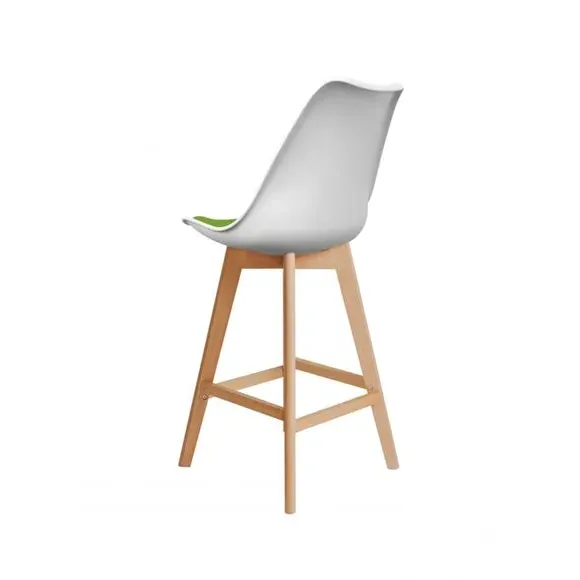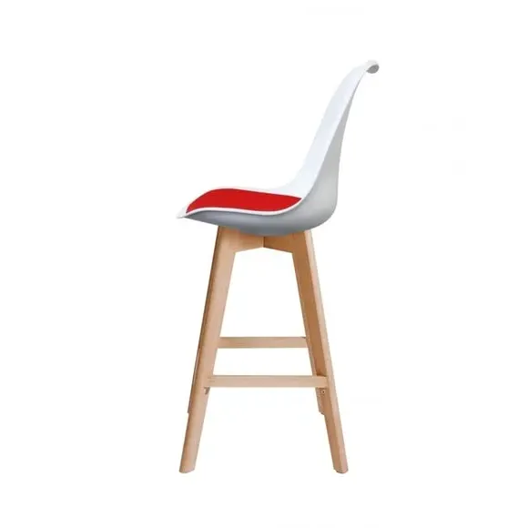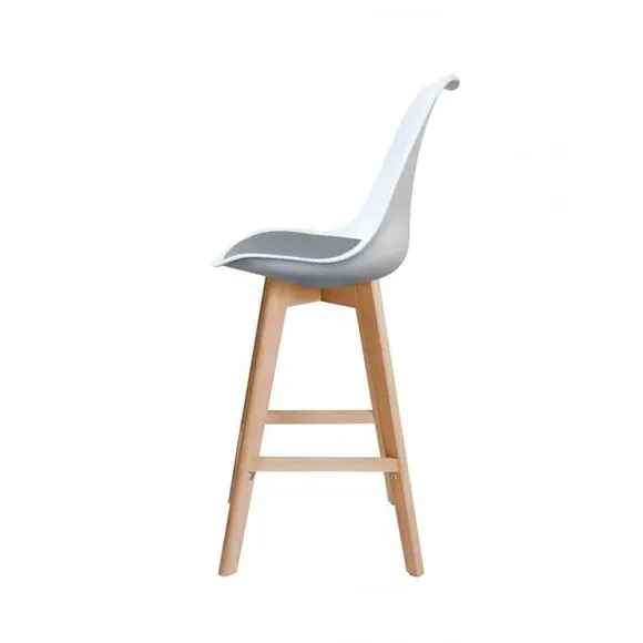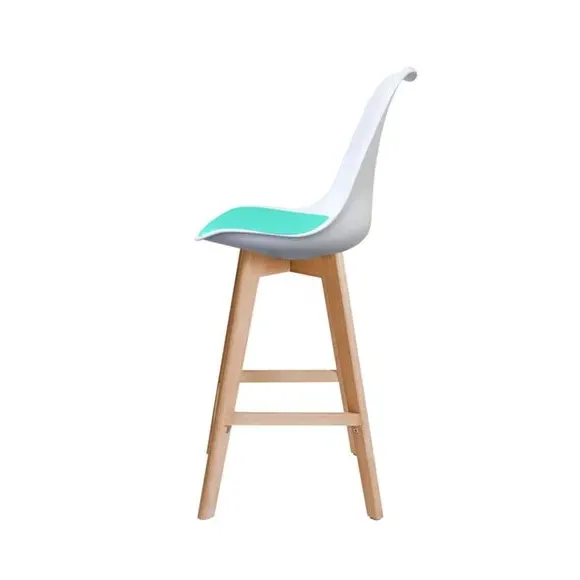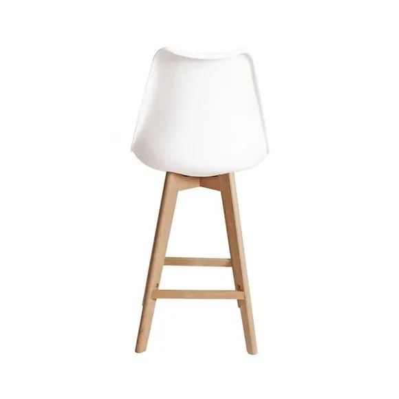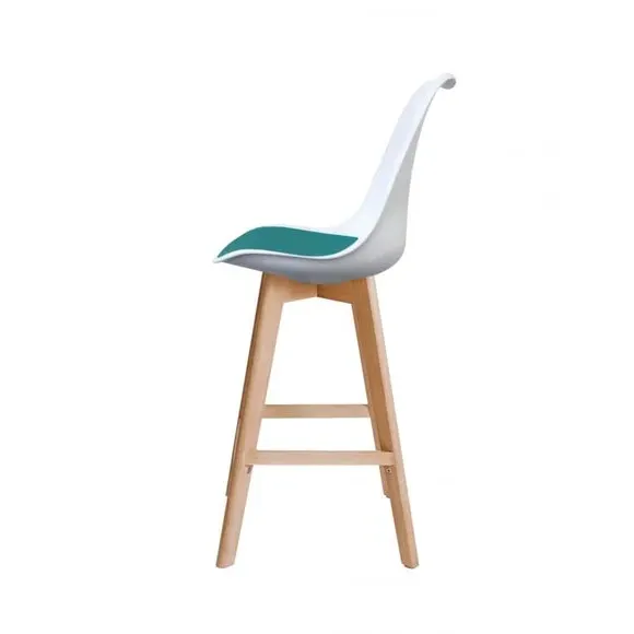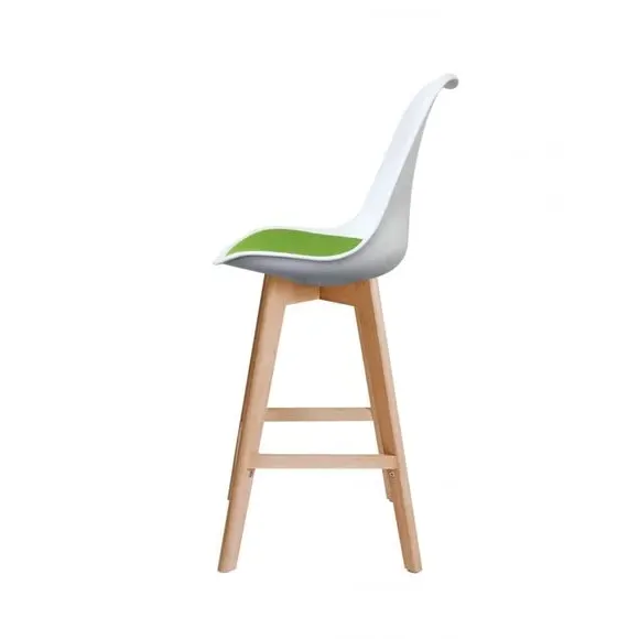 The bar stool combines contemporary design with practical comfort through its shaped seat and back construction. Its removable soft seat pad provides added comfort while remaining easy to wipe clean with a damp cloth. The four squared natural wood legs offer sturdy support, and the durable plastic construction ensures long-lasting use with simple maintenance.