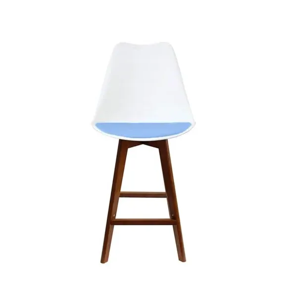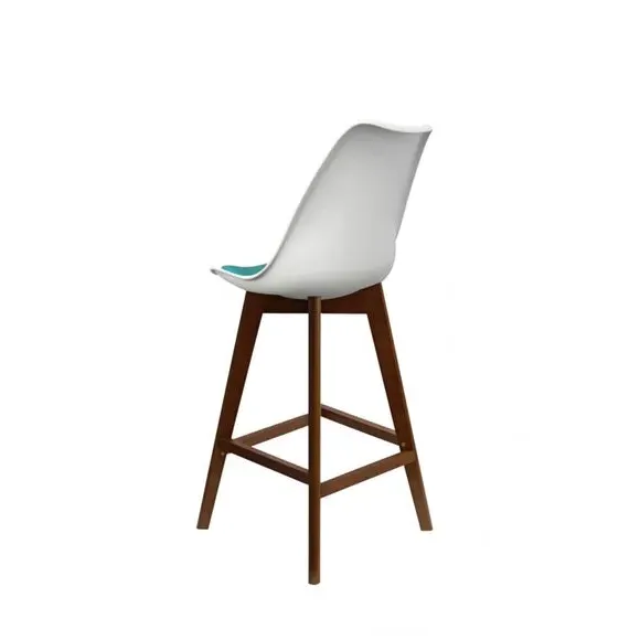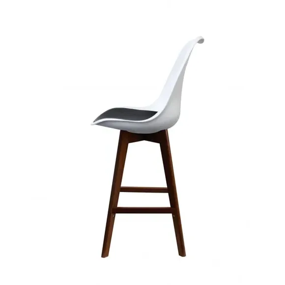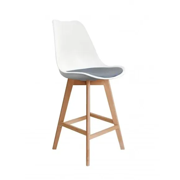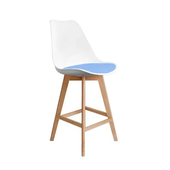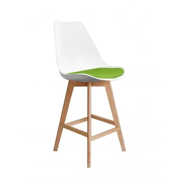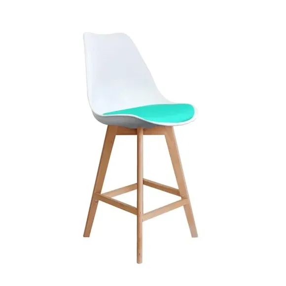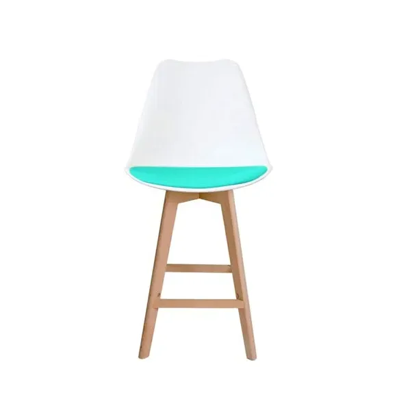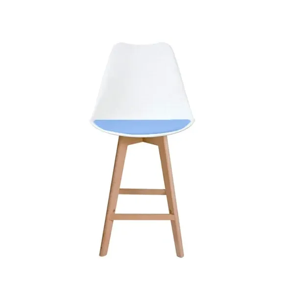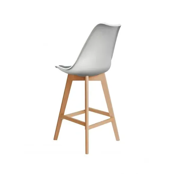 The bar stool combines contemporary design with practical comfort through its shaped seat and back construction. Its removable soft seat pad provides added comfort while remaining easy to wipe clean with a damp cloth. The four squared natural wood legs offer sturdy support, and the durable plastic construction ensures long-lasting use with simple maintenance.