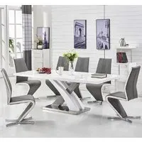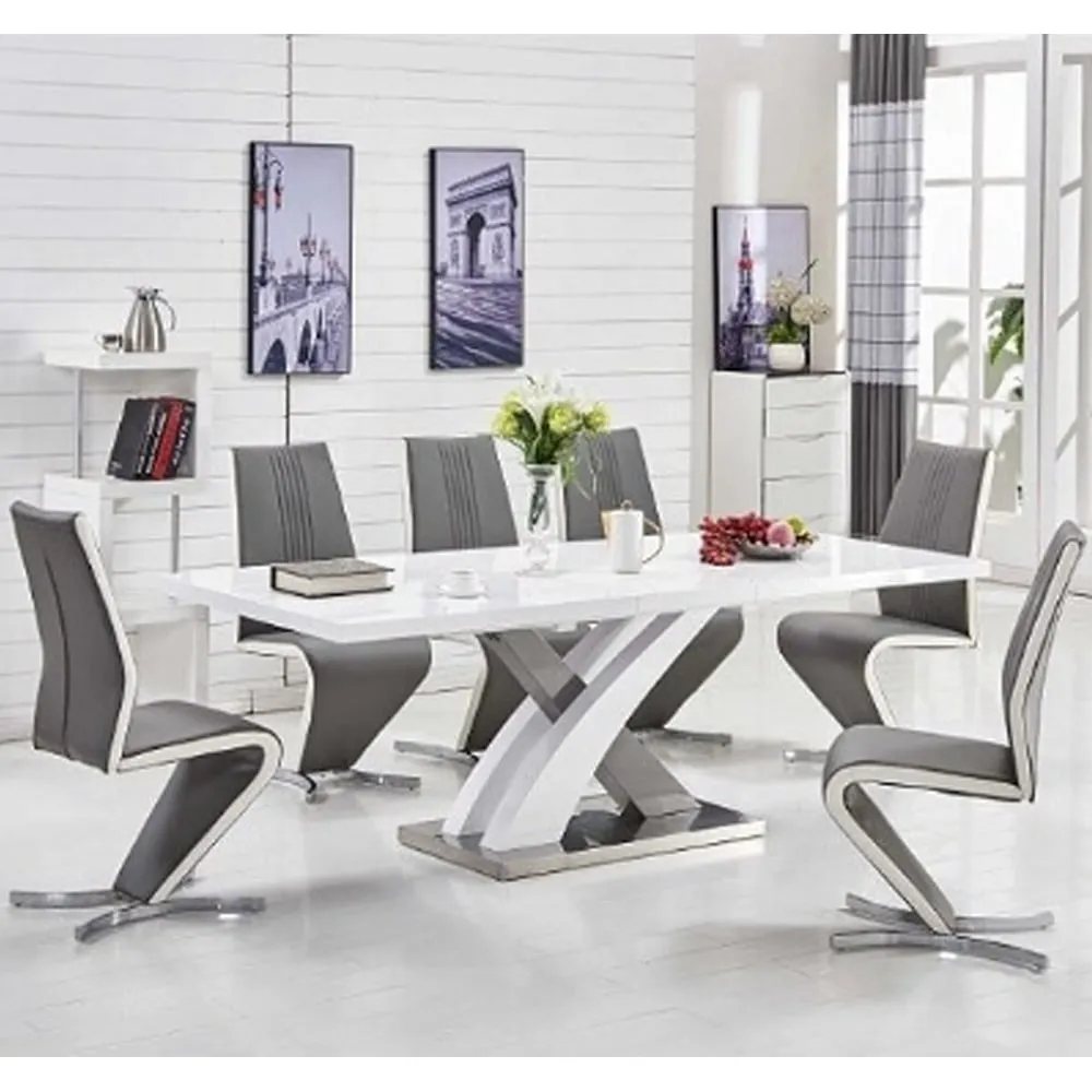 The Axara dining table provides flexible dining space with its extending mechanism that expands from 120cm to 160cm. Its MDF construction features a white and grey high gloss finish, while the stainless steel X-shaped base ensures stability and durability. The waterproof surface allows for easy cleaning and maintenance, making it suitable for daily use. W120-160 x D85 x H75 cm.