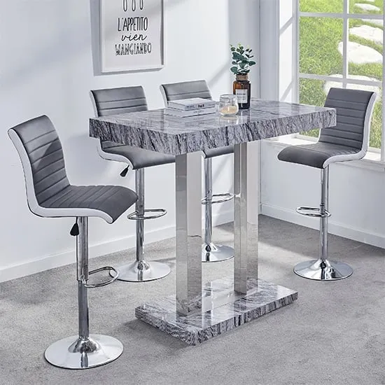 The Caprice bar table offers sophisticated dining with its melange marble effect top in dark grey, featuring a high-gloss finish that adds visual appeal. Its sturdy MDF construction with stainless steel covered legs provides reliable support, while the chrome plating ensures durability. The four Ritz stools feature black and white faux leather upholstery with ribbed backrests and height-adjustable gas-lift systems. The rectangular table top suits entertaining and casual dining, and the chrome bases with footrests ensure stability. W120 x D70 x H110 cm.