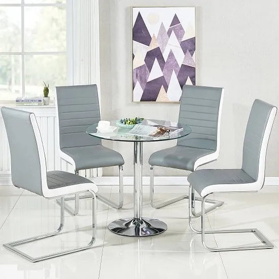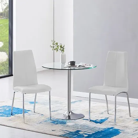 The Dante Round Clear Glass Dining Table with Chrome Base from Furniture in Fashion is a stylish and modern option for any dining space. The table features a clear tempered glass top that sits atop a sleek and sturdy chrome base. The circular shape of the table allows for easy conversation and comfortable seating for up to four people. The transparent glass top provides a clean and airy look that will complement any decor style. The table's compact size makes it an ideal choice for smaller dining areas or as a stylish addition to a breakfast nook. Whether used for everyday meals or special occasions, the Dante Round Clear Glass Dining Table is sure to impress. FEATURES : Material : Tempered Glass, Metal Finish : Clear, Chrome Dante Round Clear Glass Dining Table With Chrome Base Elegant, gorgeous round glass dining table Toughened safety glass provides a durable hard wearing surface Chrome base beautifully finished Stylish finish modern design Bistro/bar Table with tempered clear glass top Available at Affordable Price Images shown are for illustration purpose only DIMENSIONS : Height : 74cm Diameter : 80cm