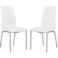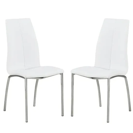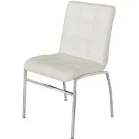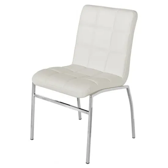 Daryl Faux Leather Dining Chair In White With Chrome Legs FEATURES : Material : Faux Leather, Metal Finish : White, Chrome Daryl Faux Leather Dining Chair In White With Chrome Legs White Faux Leather With Chrome Legs The back and seat are secured padded PU Synthetic leather and filled with polyurethane foam. It has a foot that is supported by stainless steel . Structure against plywood and synthetic PU leather Seat + back : Synthetic PU leather embroidered + polyurethane foam The feet are protected by caps Chair Also Available In Black, Grey And Brown Would add Complement With Any Dining Table Finest Quality Materials Are Used Available At An Affordable Price DIMENSIONS : Height : 103cm Width : 43cm Depth : 58cm
