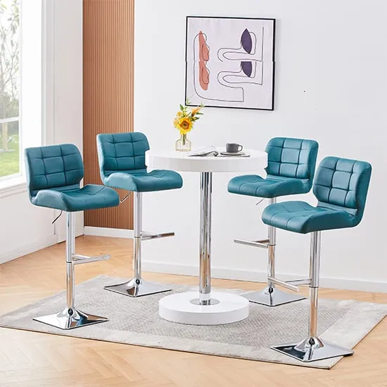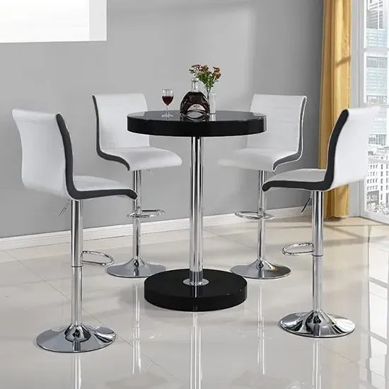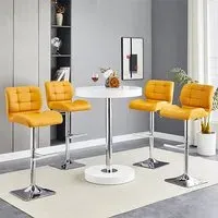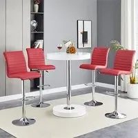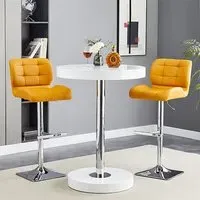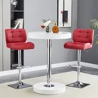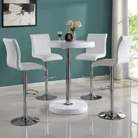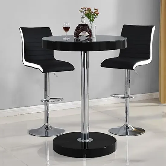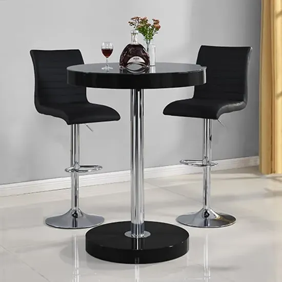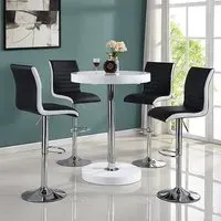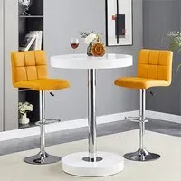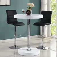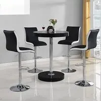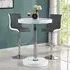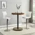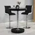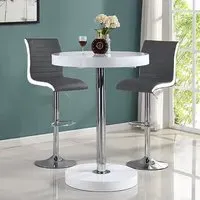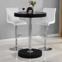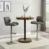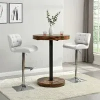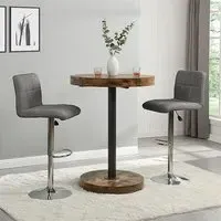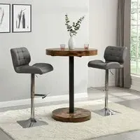 The Havana Bar Table offers rustic oak warmth with its round MDF top and powder-coated metal base. The set includes two Oston Grey stools featuring faux leather upholstery and anthracite legs for modern contrast. Each stool provides padded comfort with tall backrest support, while the durable faux leather material ensures easy maintenance. The table's black metal support ensures durability for dining and entertaining. W80 x D80 x H108 cm table, W54 x D50 x H102 cm stools.